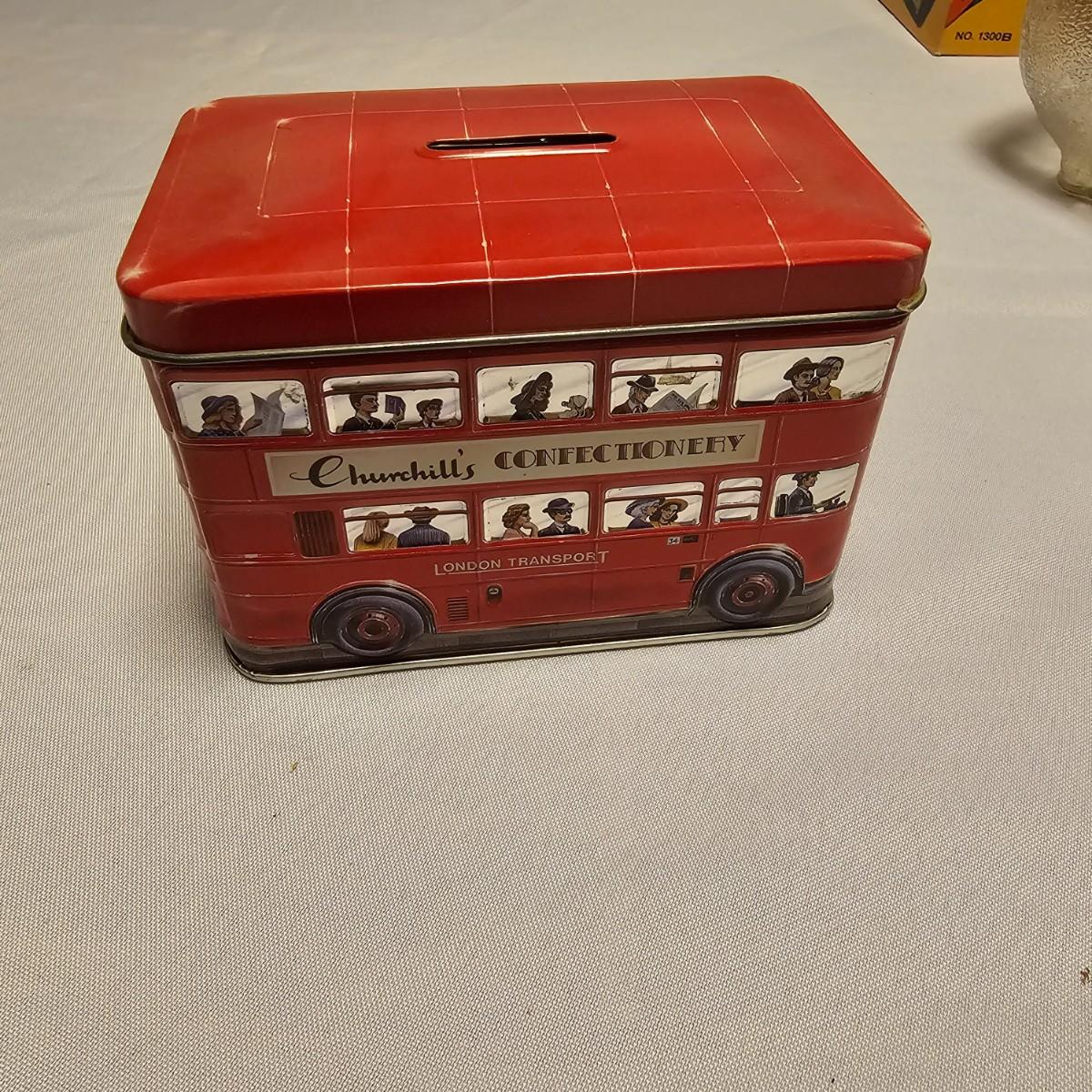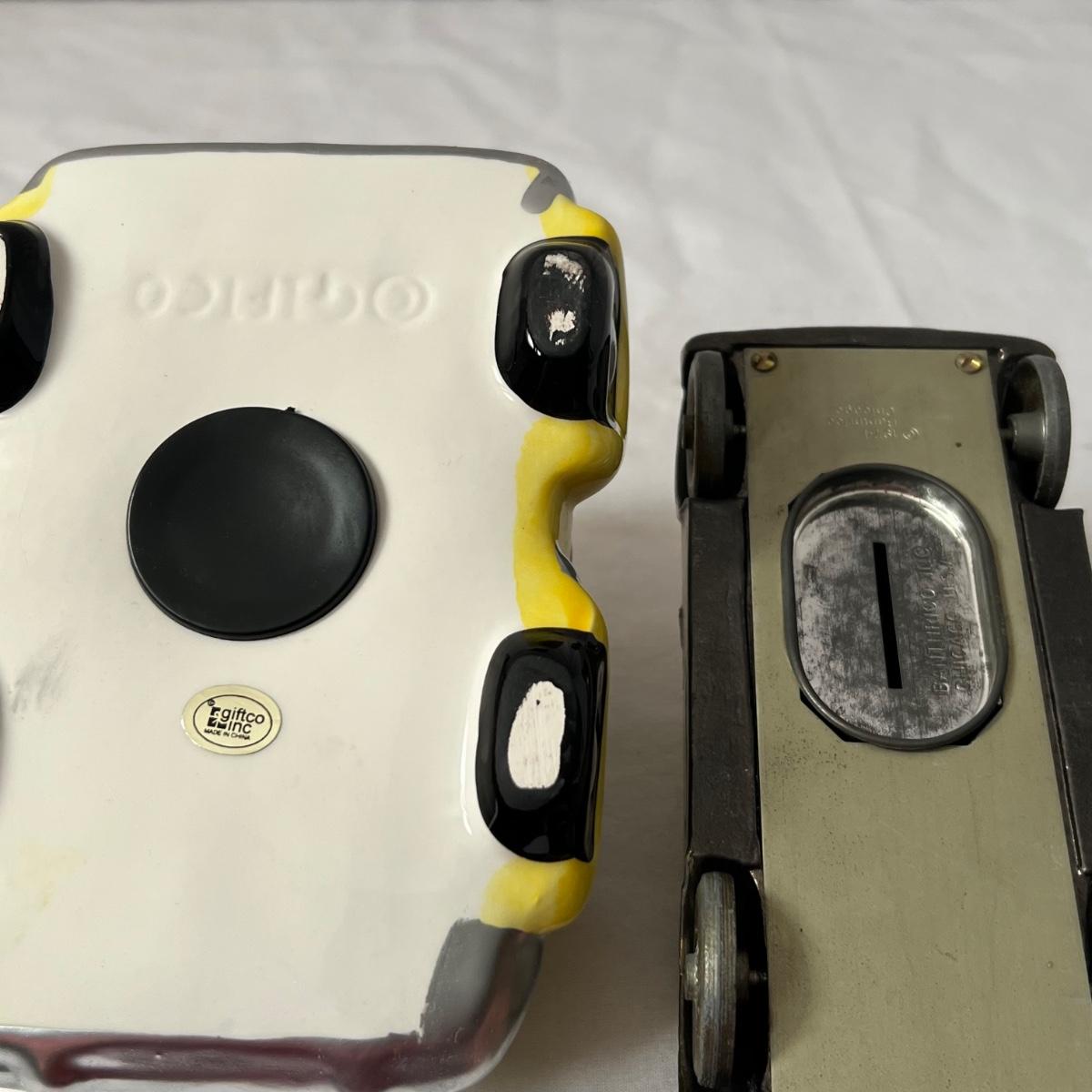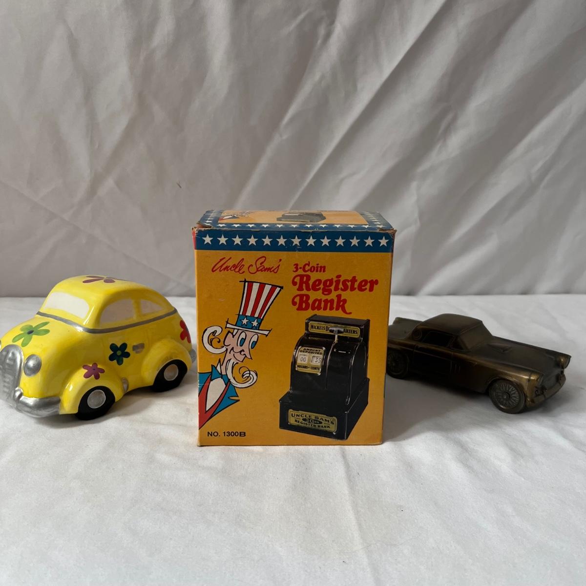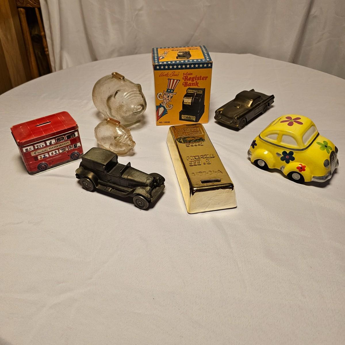 This vintage Uncle Sam’s coin bank comes complete with original box. It is NO.1300 B and measures 4” x 5” x 6”. Other banks includes a ceramic VW Bug, two metal classic cars that measure 3” x 7” x 2.5”, a gold bar that is 4" x 10" x 2"H, a tin London bus bank and two traditional glass piggy banks. Larger is 4" x 6" x 5.5"H, smaller is 2" x 4" x 3"H. Eight banks total. See photos for details.