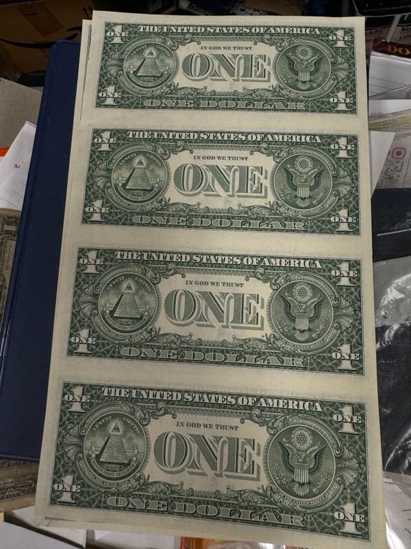 Uncut sheet of U S one Dollar bills