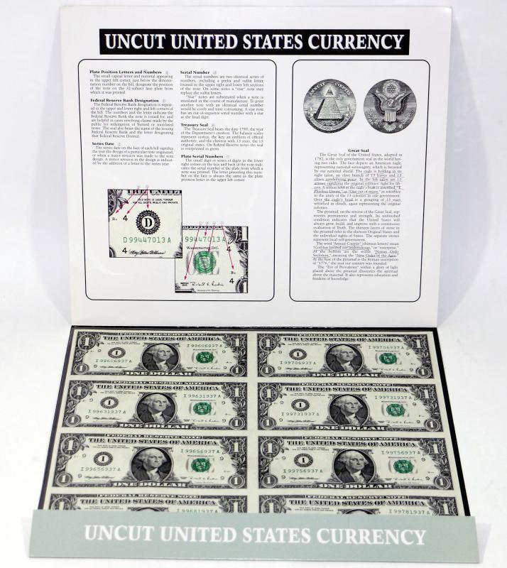 Uncut United States Currency - 8 $1 Notes Uncut Sheet w/ Folder