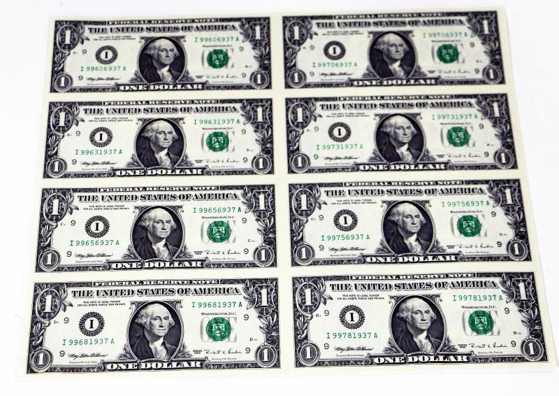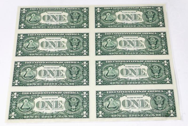 Uncut United States Currency - 8 $1 Notes Uncut Sheet w/ Folder.