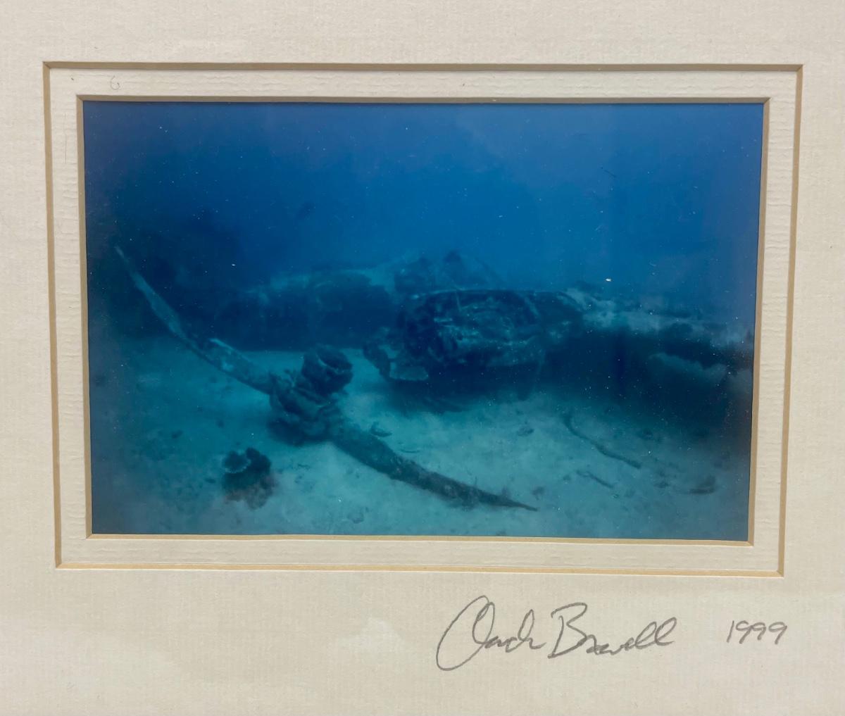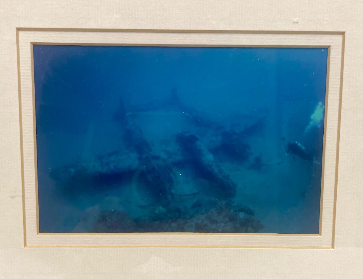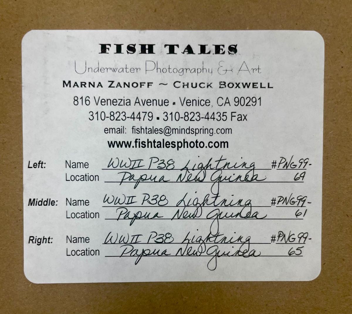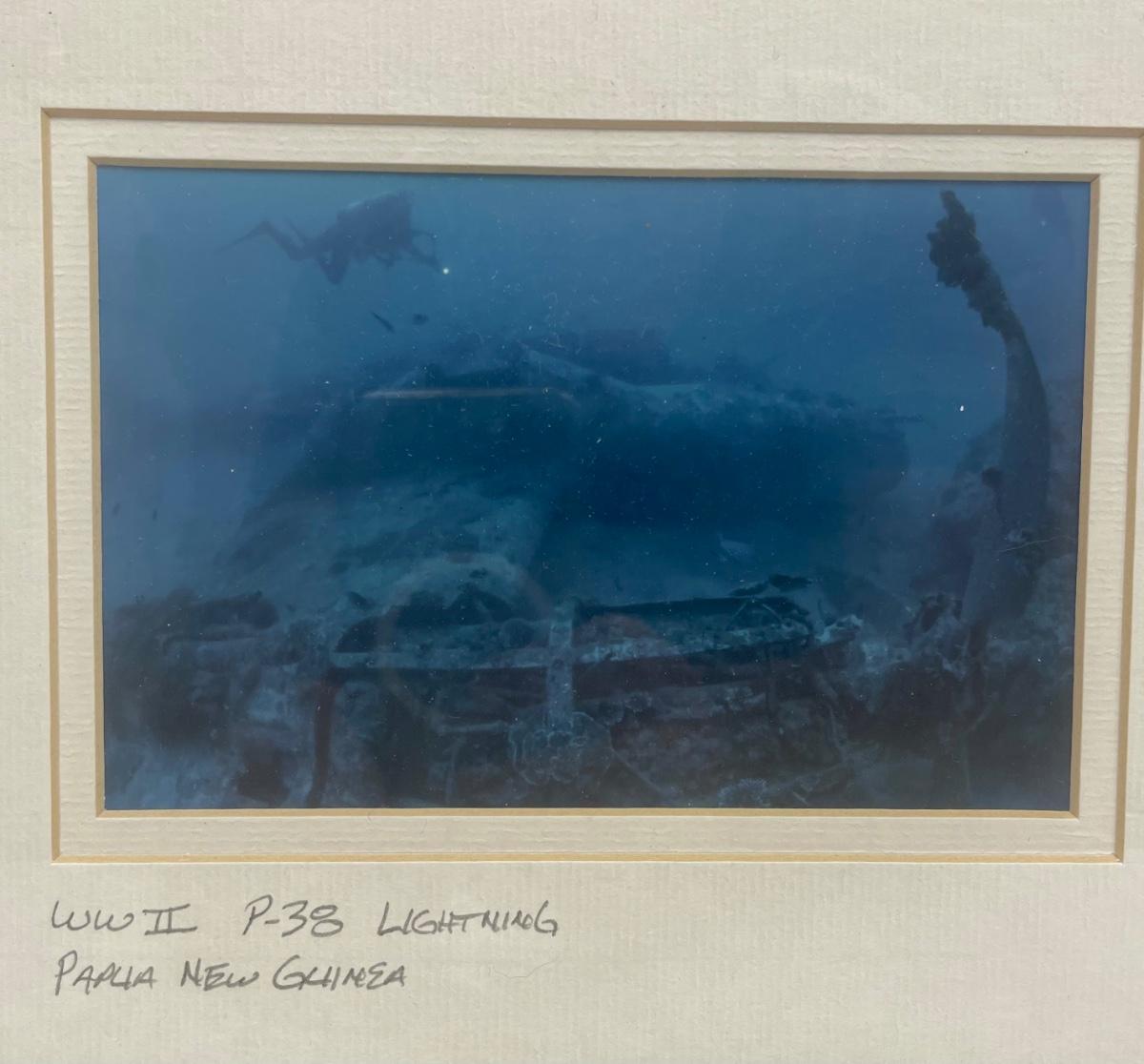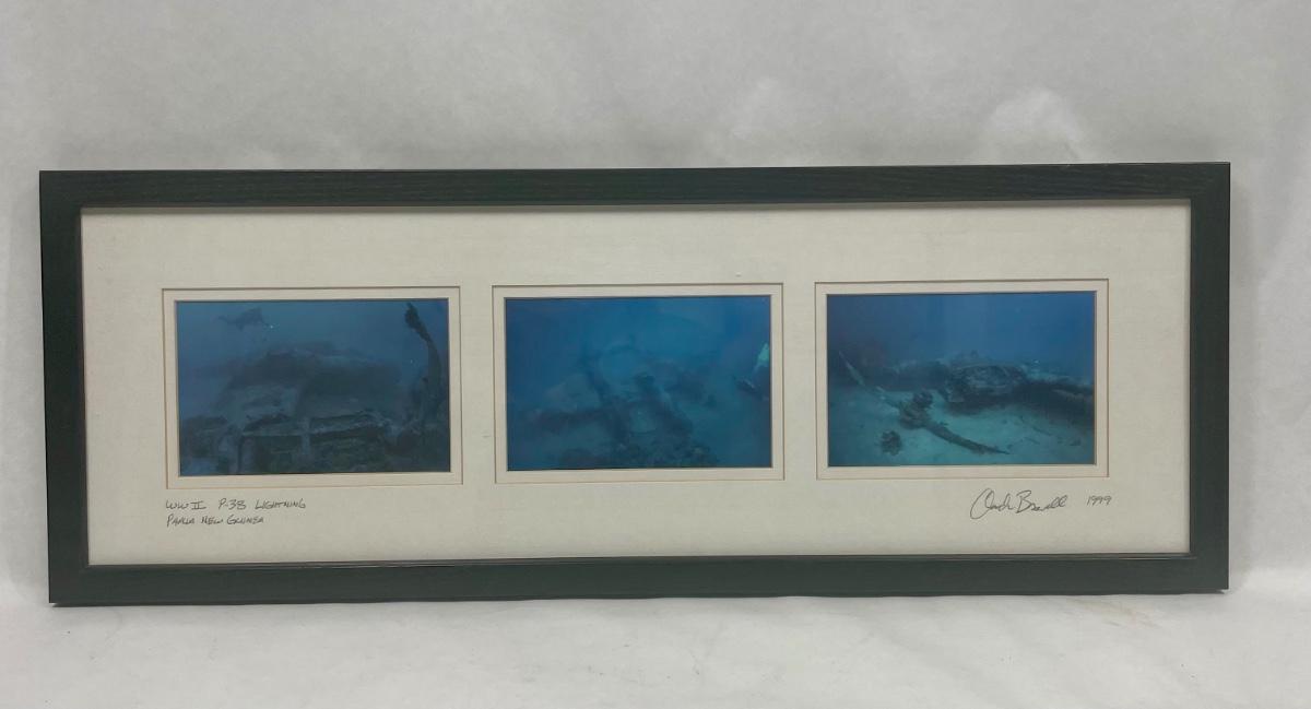 Set of 3 photos taken in 1999 in Papua New Guinea. Photos show the wreck of a US P-38 Lightning. Framed set is approx. 25" long.