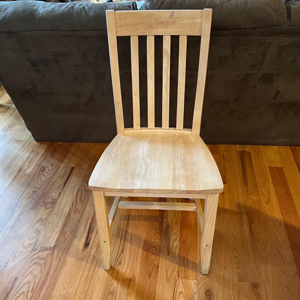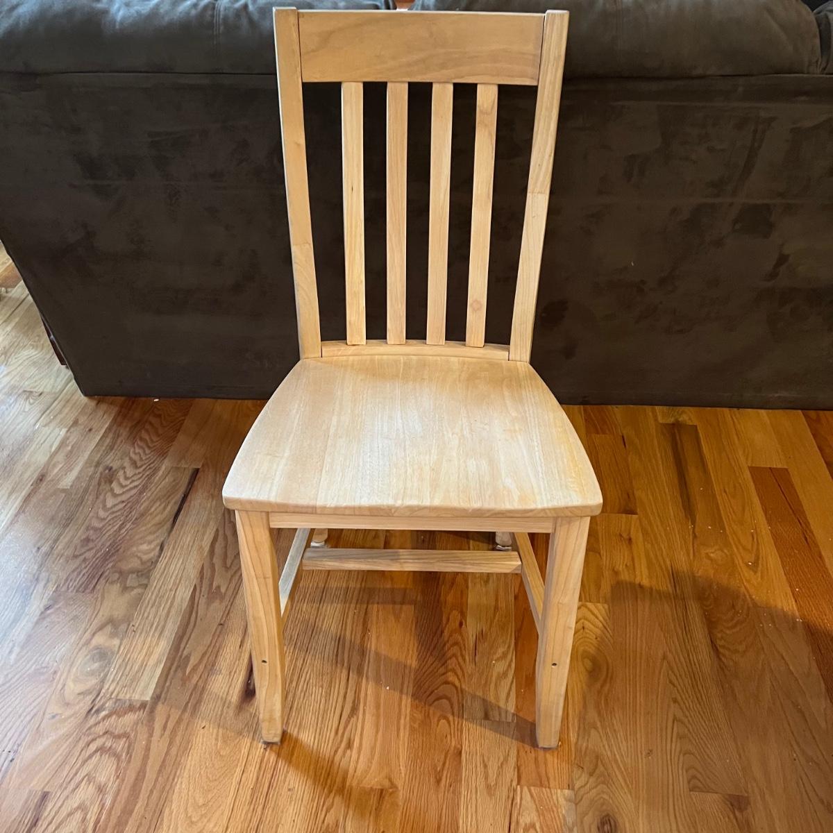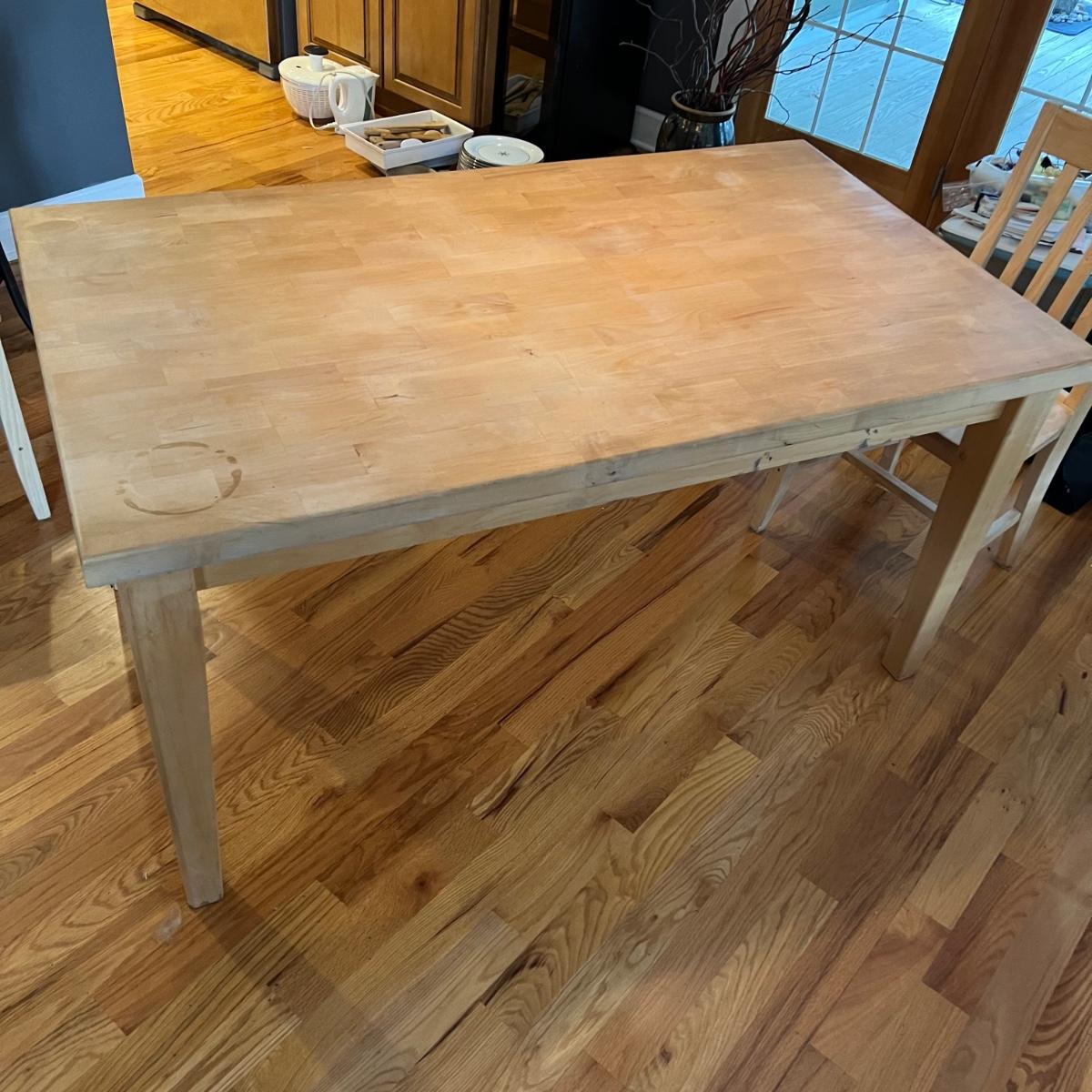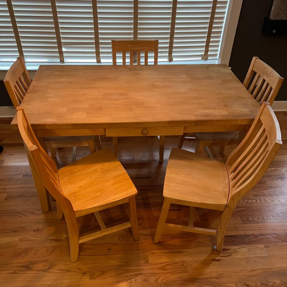 American made unfinished dining table and five chairs that appear to be made of solid pine wood. Four chairs are unfinished and match the table. One additional chair is the same style that has been lacquered. Some water stains and a paint stain on one chair and on the table (see photos for detail), appears that they might be able to be sanded out prior to finishing. Small drawer for storage is ideal place for napkins or placemats. Table measures approximately 60" x 34" x 31". Chairs measure approximately 18" x 19" x 36" with a seat height of 18.5" Local pickup only. .Winning bidder must bring assistance to help move and load this item due to its weight and/or size