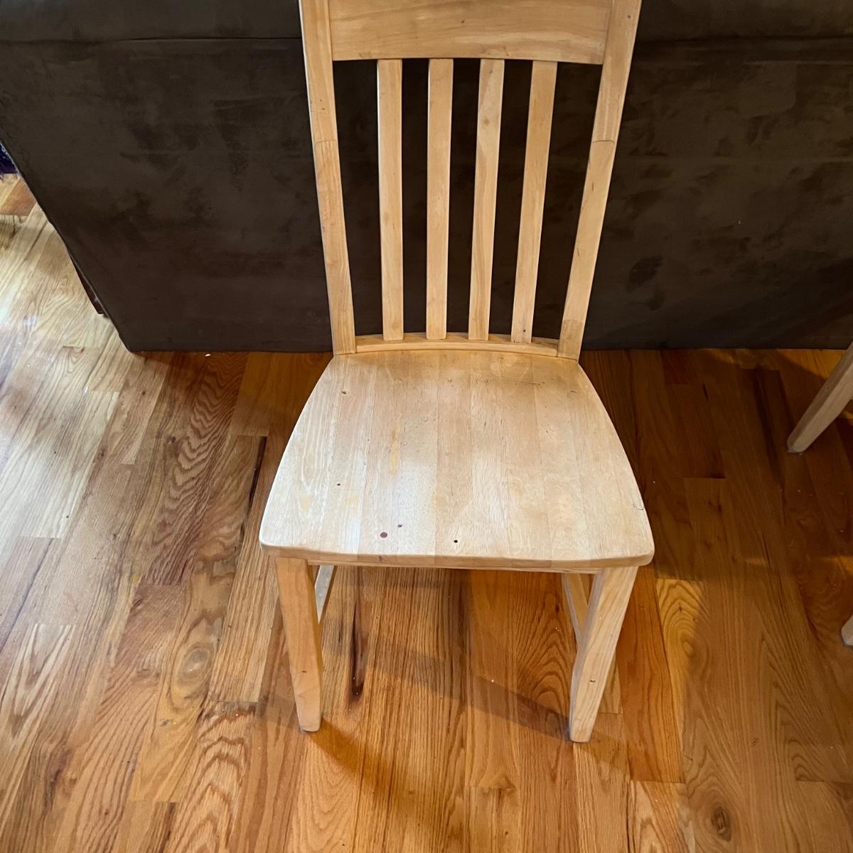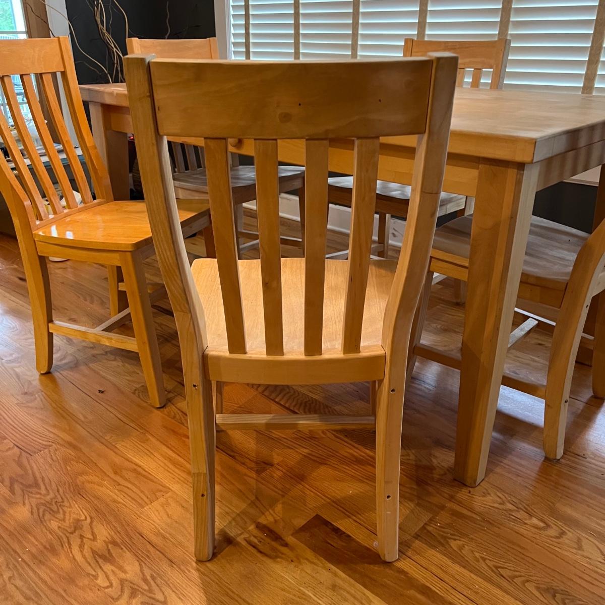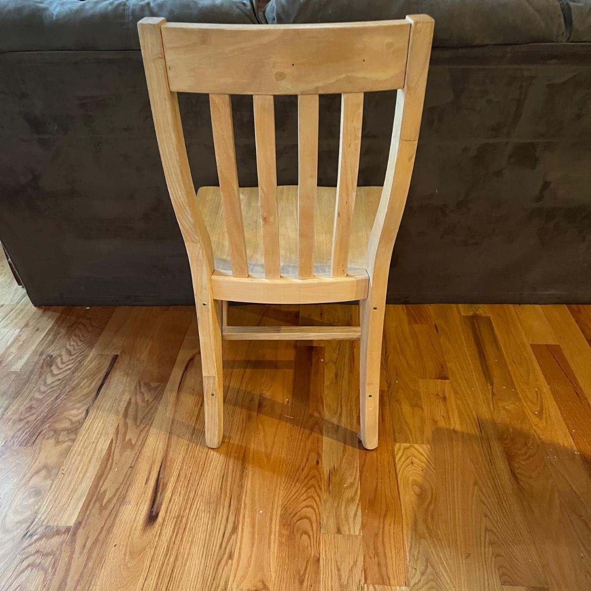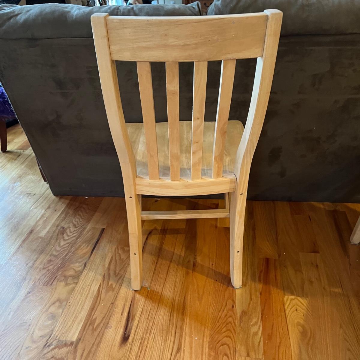 American made unfinished dining table and five chairs that appear to be made of solid pine wood. Four chairs are unfinished and match the table. One additional chair is the same style that has been lacquered. Some water stains and a paint stain on one chair and on the table (see photos for detail), appears that they might be able to be sanded out prior to finishing. Small drawer for storage is ideal place for napkins or placemats. Table measures approximately 60" x 34" x 31". Chairs measure approximately 18" x 19" x 36" with a seat height of 18.5" Local pickup only. .Winning bidder must bring assistance to help move and load this item due to its weight and/or size