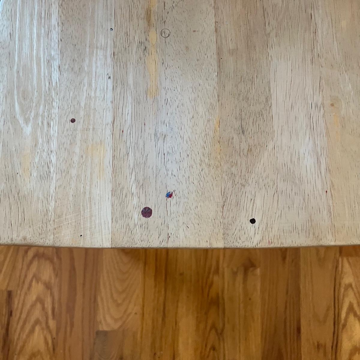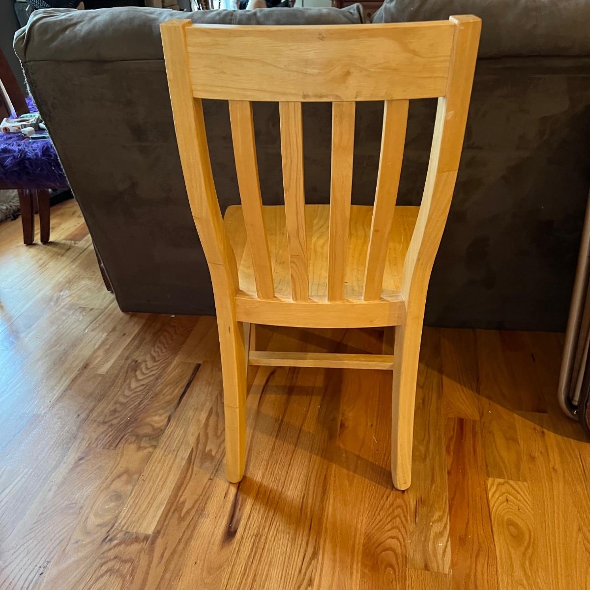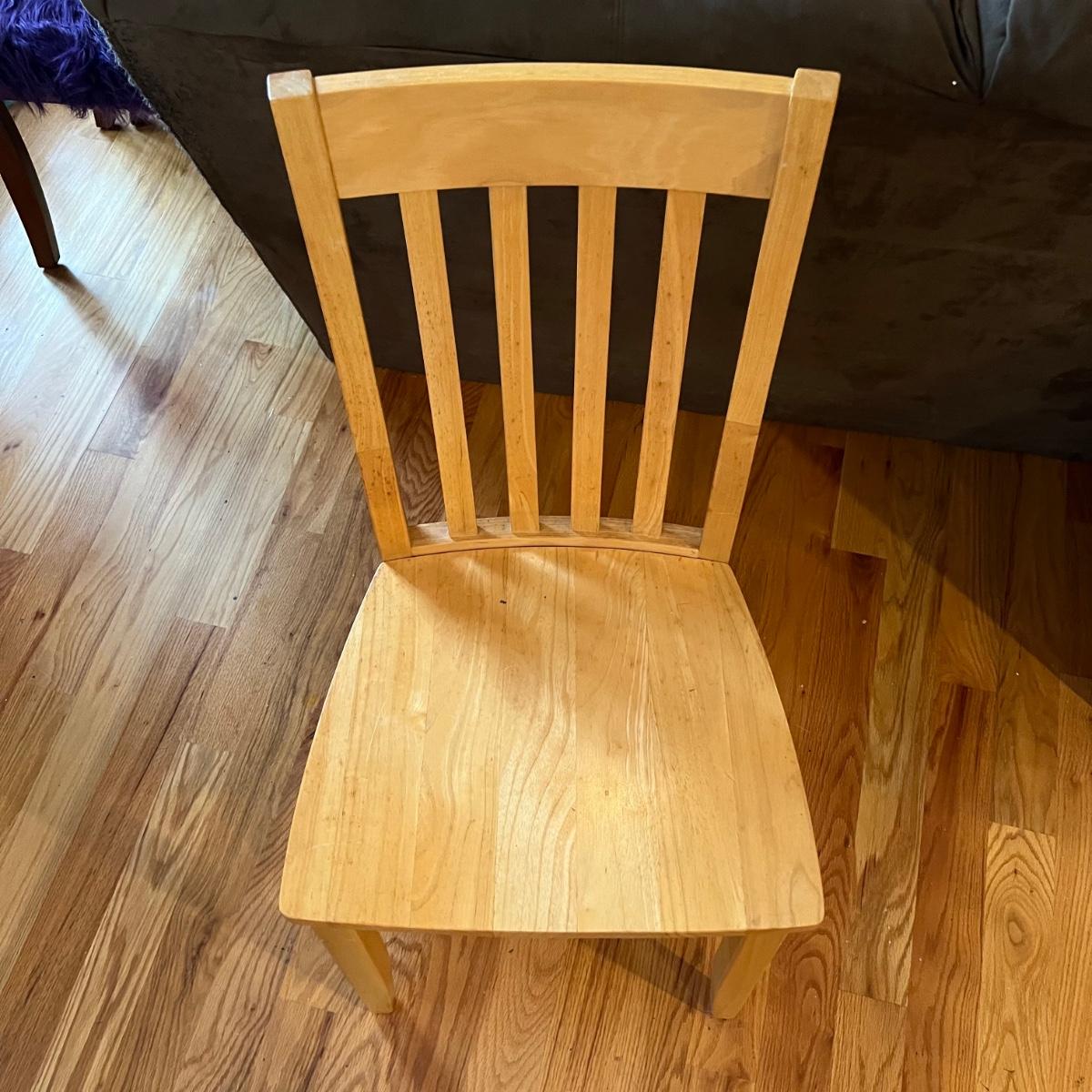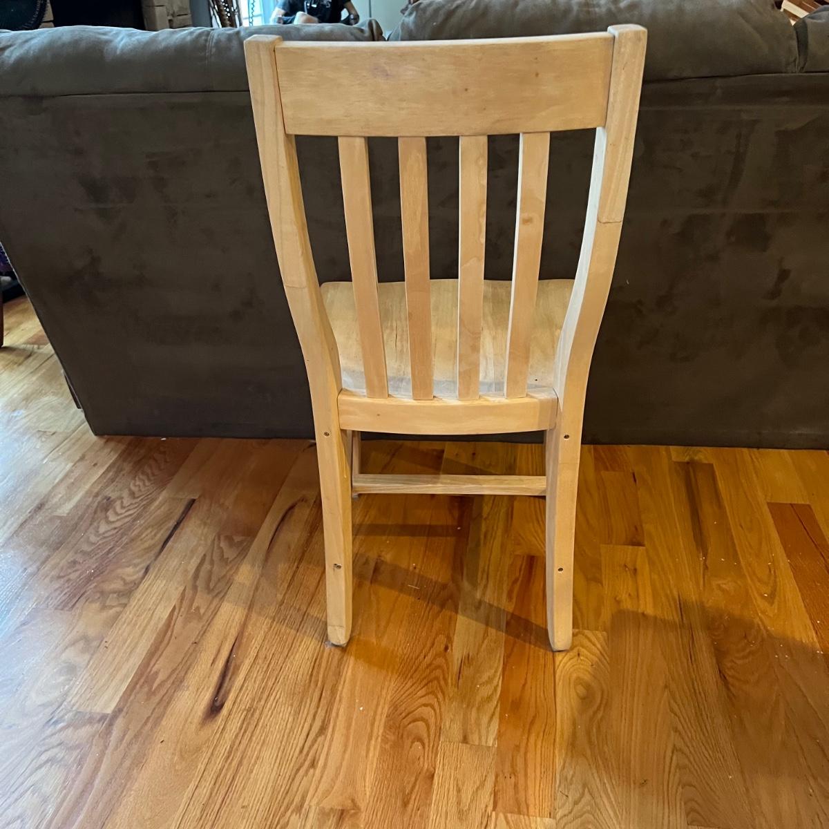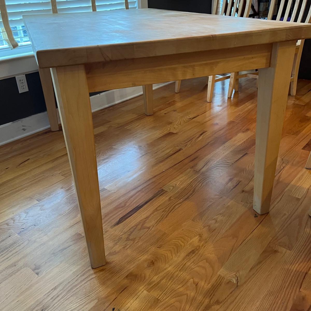 American made unfinished dining table and five chairs that appear to be made of solid pine wood. Four chairs are unfinished and match the table. One additional chair is the same style that has been lacquered. Some water stains and a paint stain on one chair and on the table (see photos for detail), appears that they might be able to be sanded out prior to finishing. Small drawer for storage is ideal place for napkins or placemats. Table measures approximately 60" x 34" x 31". Chairs measure approximately 18" x 19" x 36" with a seat height of 18.5" Local pickup only. .Winning bidder must bring assistance to help move and load this item due to its weight and/or size