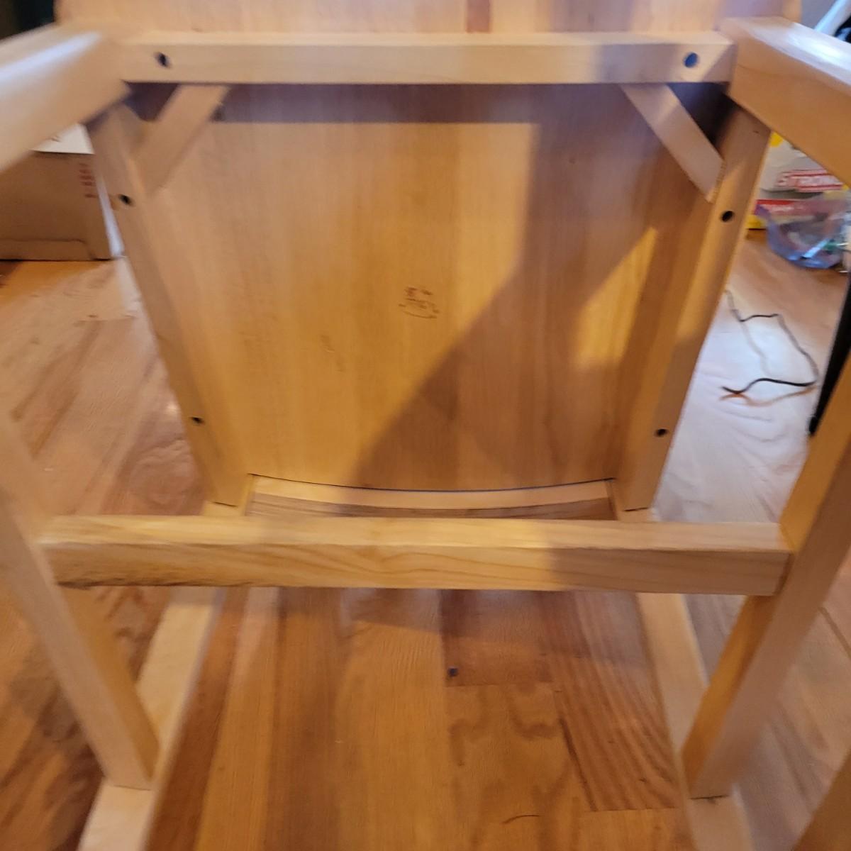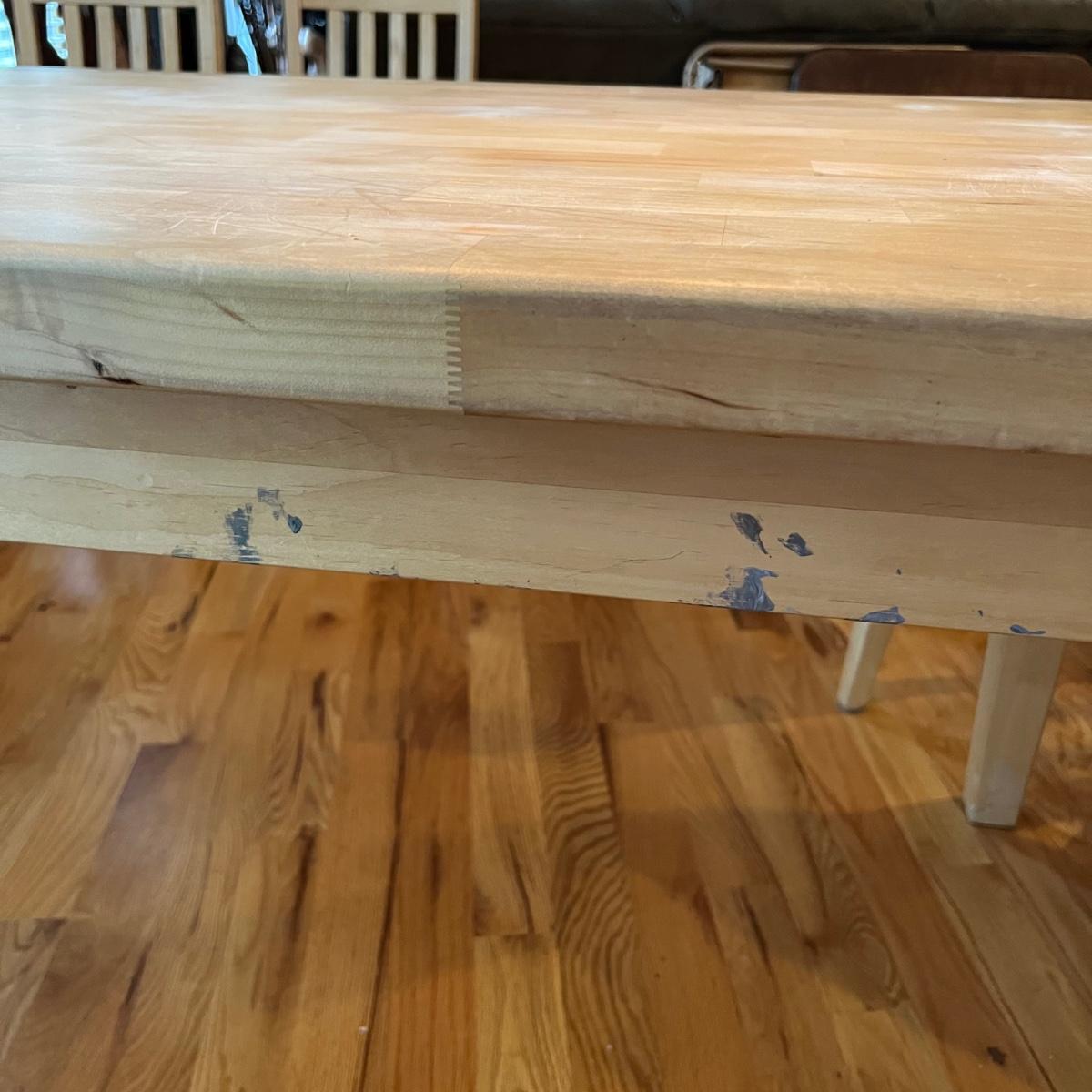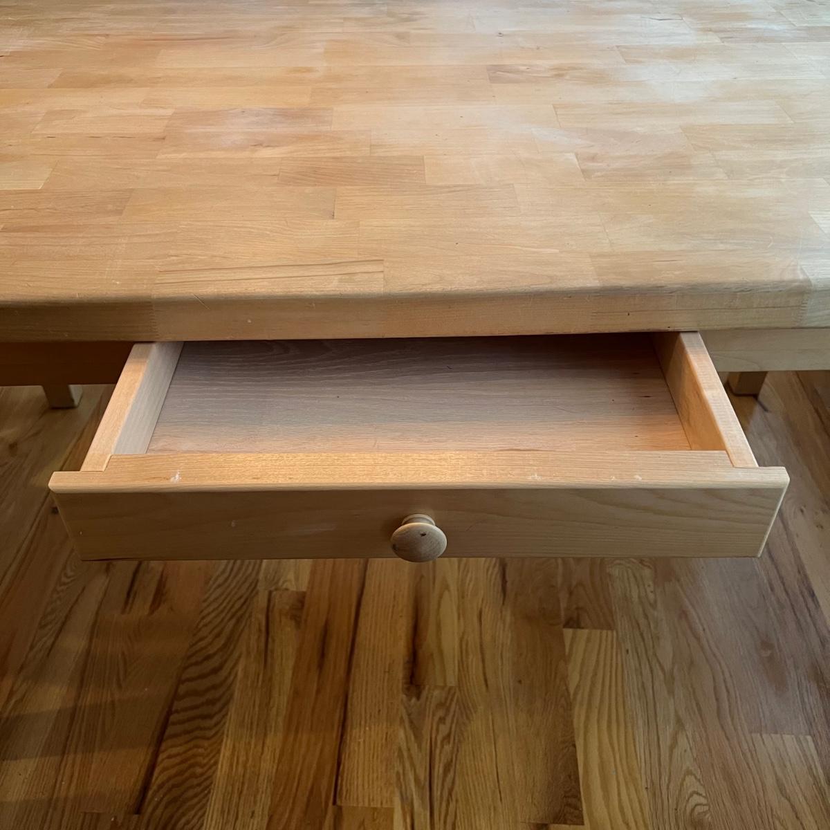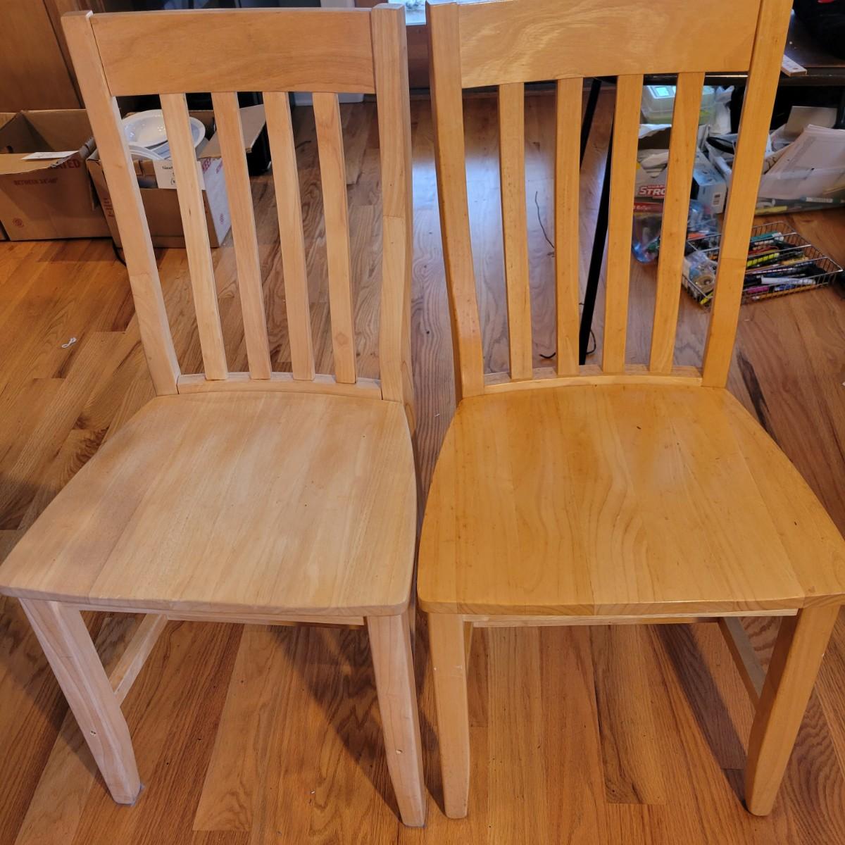 American made unfinished dining table and five chairs that appear to be made of solid pine wood. Four chairs are unfinished and match the table. One additional chair is the same style that has been lacquered. Some water stains and a paint stain on one chair and on the table (see photos for detail), appears that they might be able to be sanded out prior to finishing. Small drawer for storage is ideal place for napkins or placemats. Table measures approximately 60" x 34" x 31". Chairs measure approximately 18" x 19" x 36" with a seat height of 18.5" Local pickup only. .Winning bidder must bring assistance to help move and load this item due to its weight and/or size