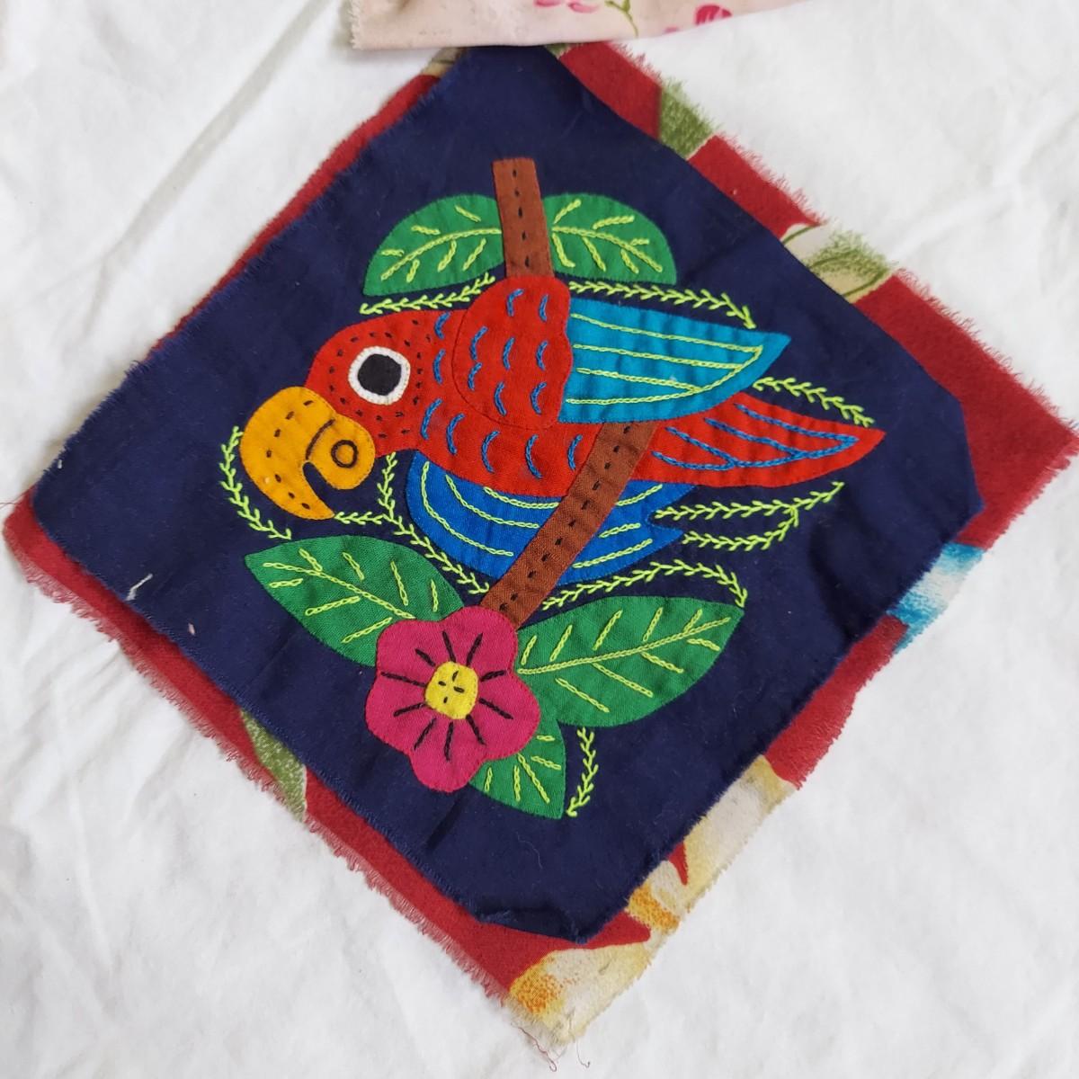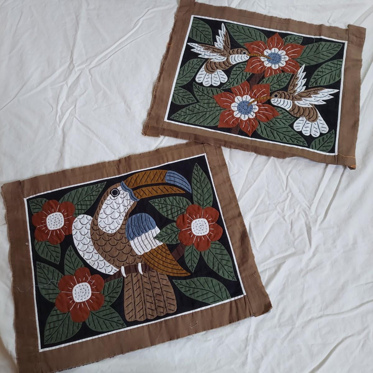 Several unfinished quilt projects. The brown bird blocks are approximately 16" x 13"H. The round bird pieces are around 3" each.