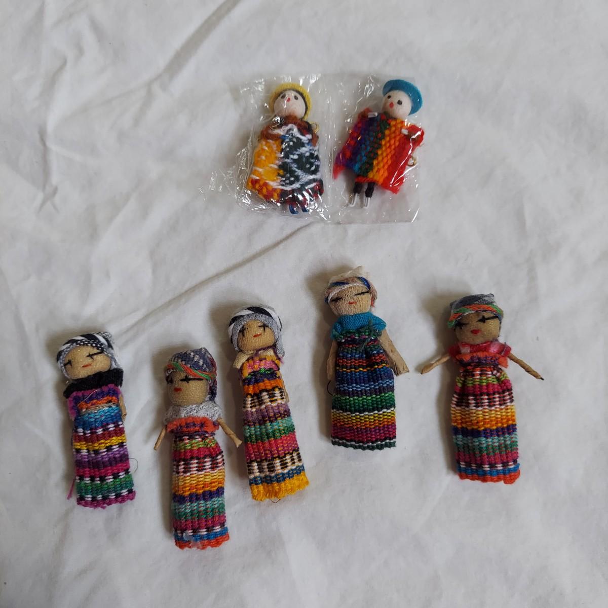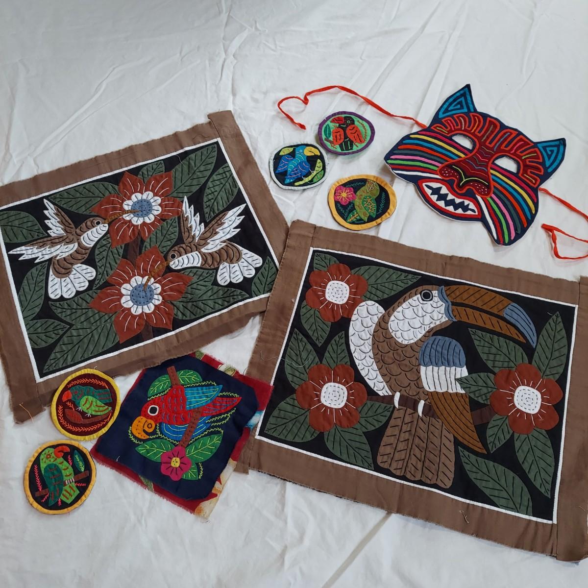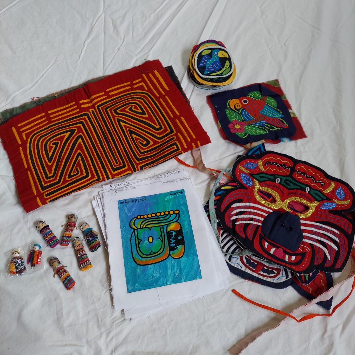 There are several hand painted blocks from the Mayan Calendar. They're approximately 6" x 8"H. Small dolls are 2" tall. Hand made quilted masks also included. Shipping available.