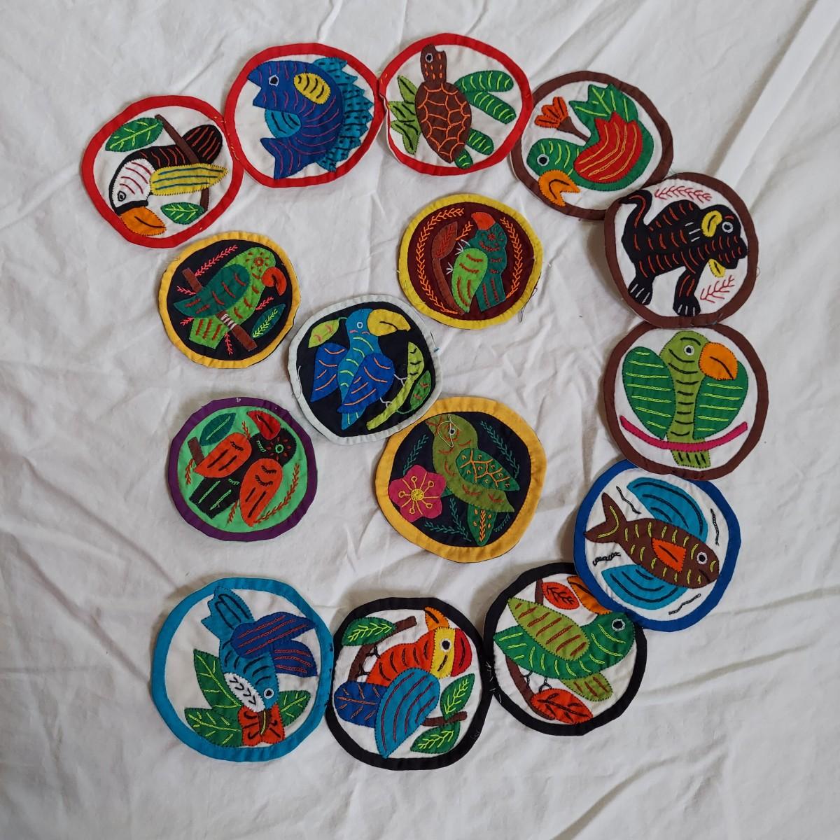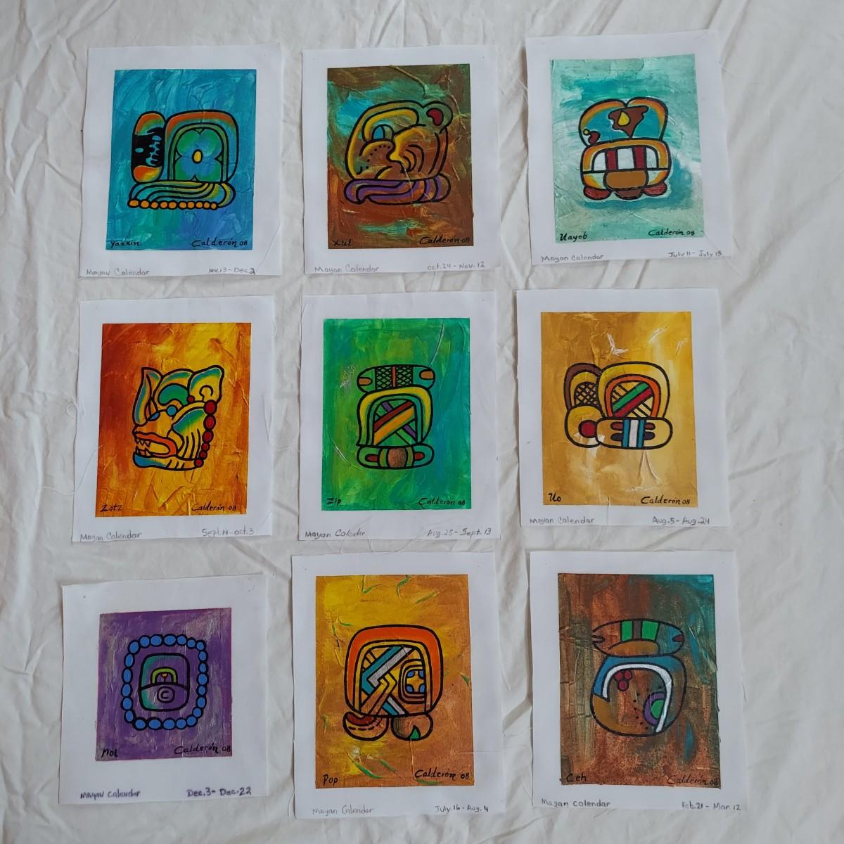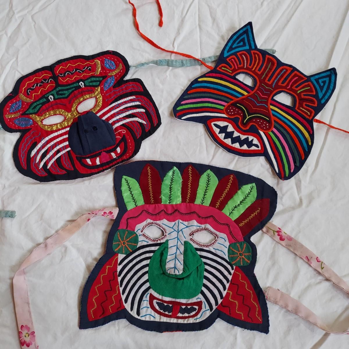 There are several hand painted blocks from the Mayan Calendar. They're approximately 6" x 8"H. Small dolls are 2" tall. Hand made quilted masks also included. Shipping available.