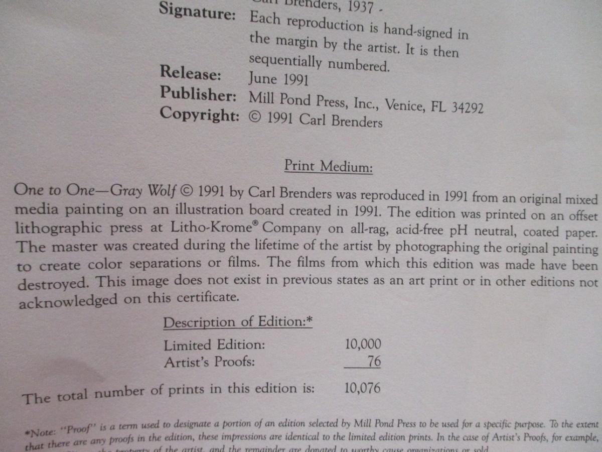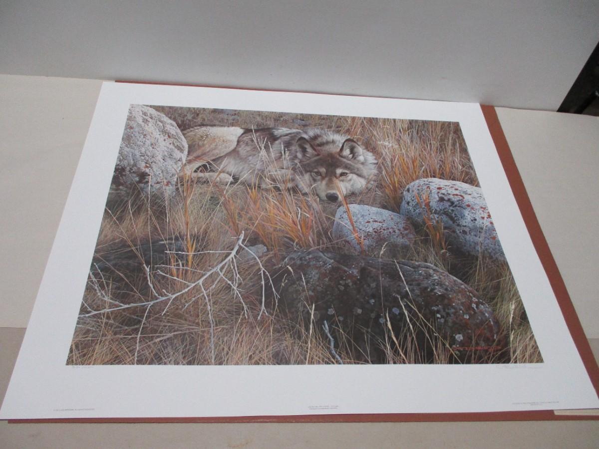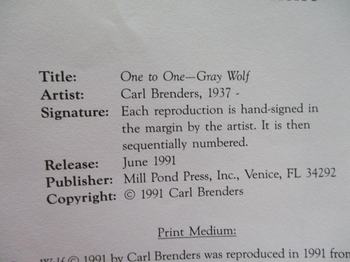Unframed Carl Benders Signed/Numbered Print "One to One - Gray Wolf" 26 1/2" x 32 1/8"