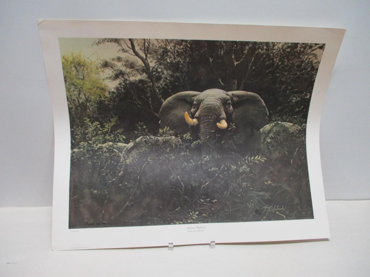 The image is of an elephant in the jungle - Lithograph on paper - Sight size 21" h x 28"w