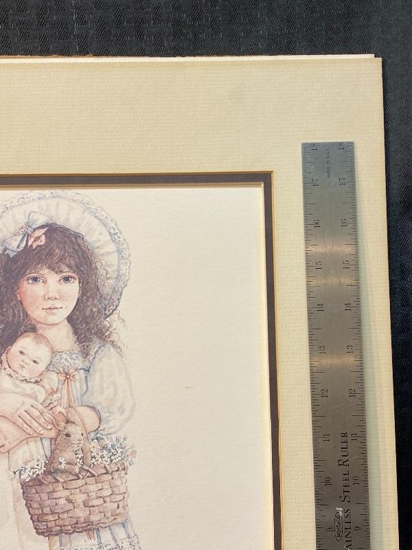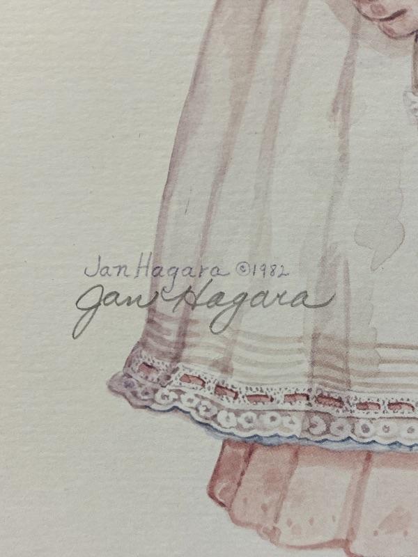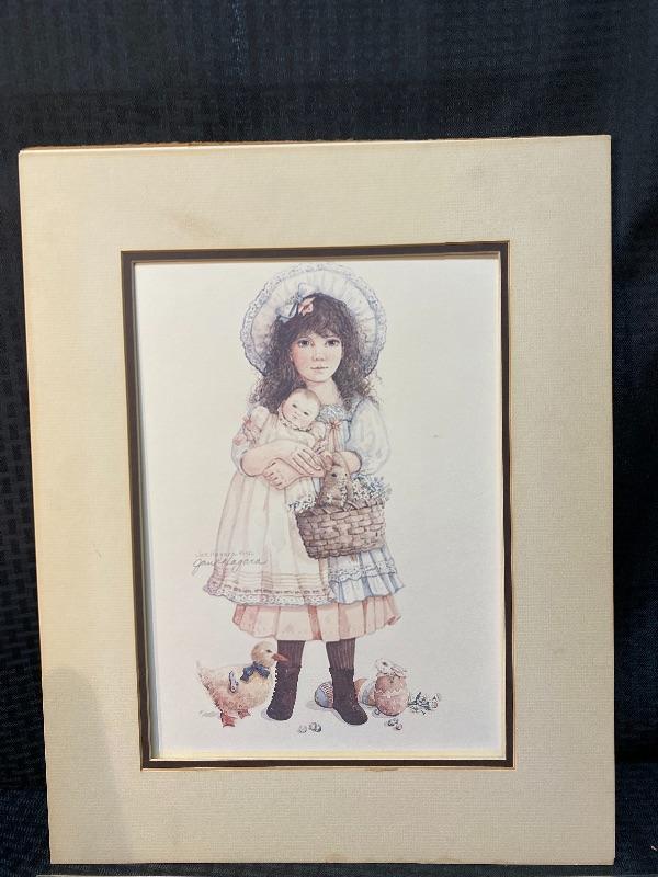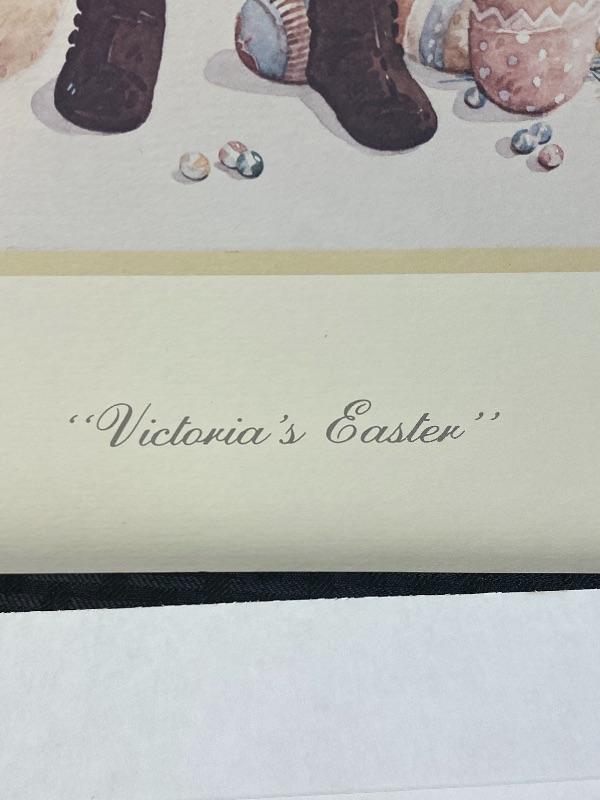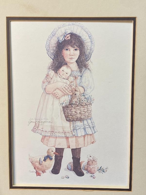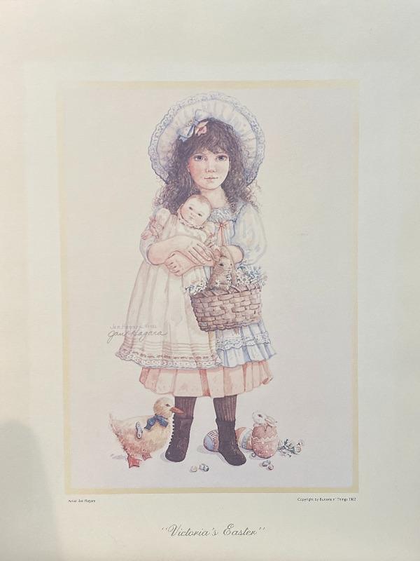 Unframed Jan Hagara 1982 print "Victoria's Easter". Signed. Has matting and backing just no frame. About 16"x20". Matting has some smudges, art work looks good.