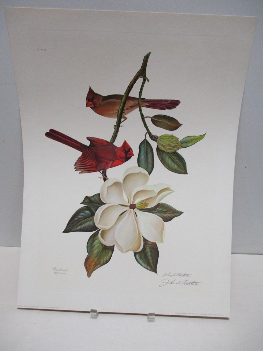Two cardinals, male & female on a magnolia branch - Offset lithograph on paper - sight size 24"h x 18"w