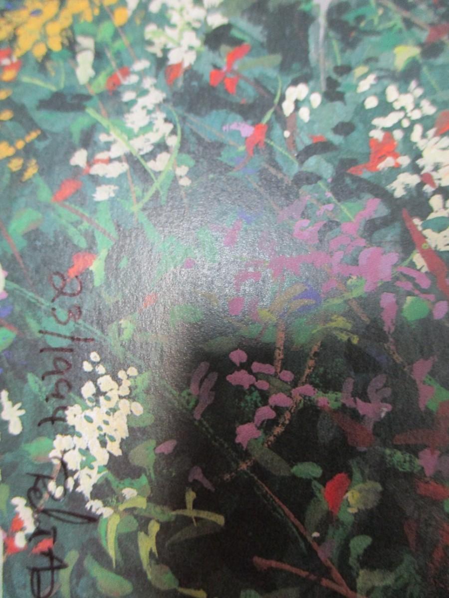 A bear is in a meadow among wild flowers. Mountains and trees are n the background. Offset Lithograph on paper - sight size 22" h x 30"w