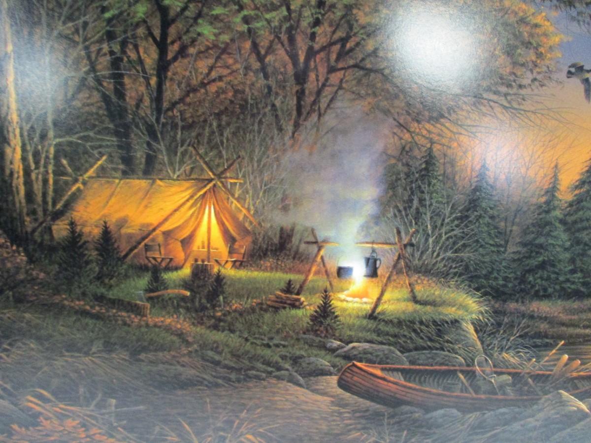 Campers in a tent on a lake. Geese are flying overhead. A sunset in the background. Offset Lithograph on paper - sight size 18.5"h x 32"w