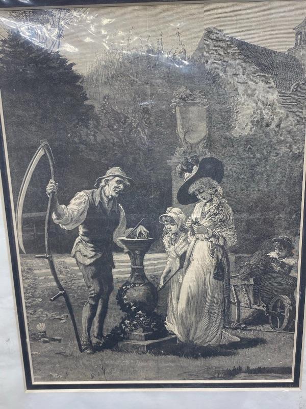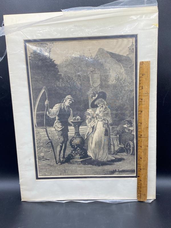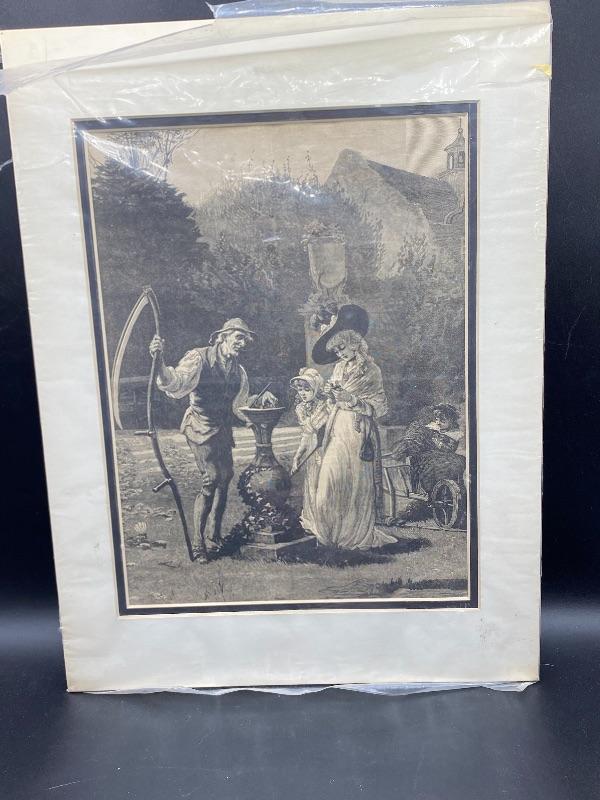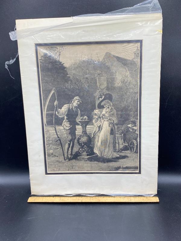Unframed Victorian etching style print. Matted in open plastic. Measures about 12"x16" with matting.