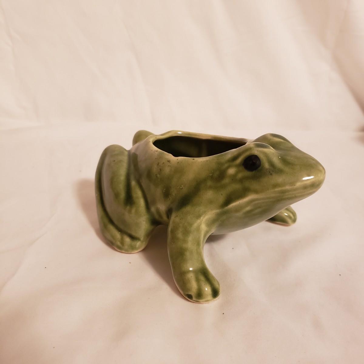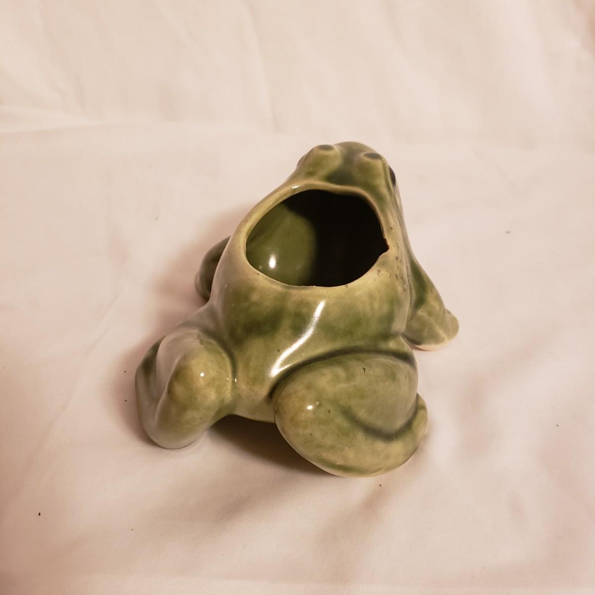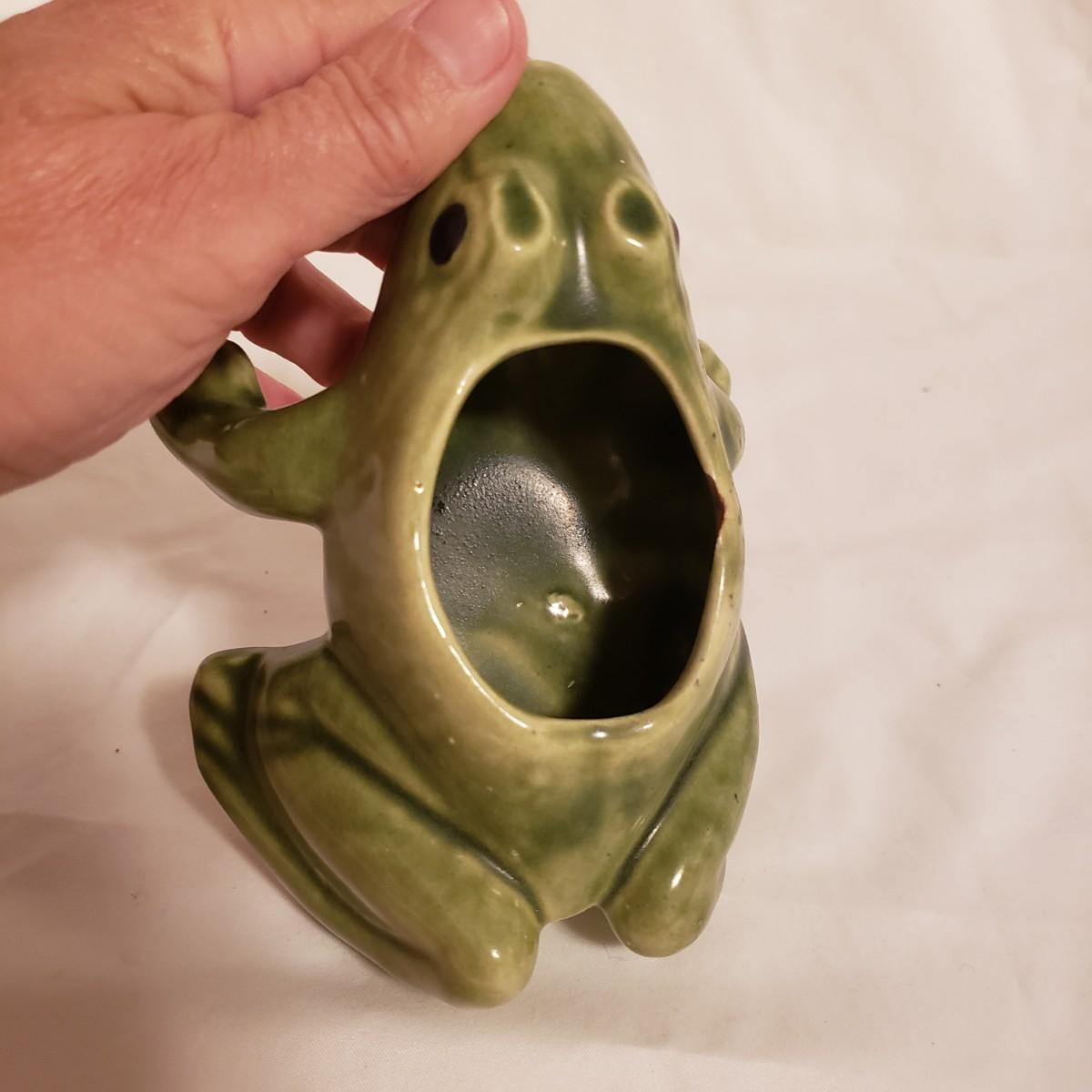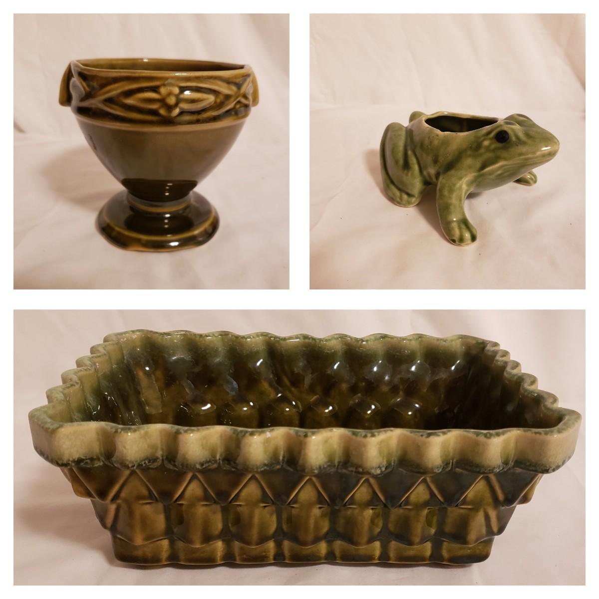 This fun and stylish pottery lot has three gems! The frog would be a perfect succulent pot! The frog measures 6" x 4" x 3"H. It has a crack on the inside rim, see picture. The art deco urn shaped pot has no apparent marking on the bottom. The rippled rectangular bowl is made by Ungemach Pottery Co. USA. It's marked UPCO USA #1028. Please see photos for details.