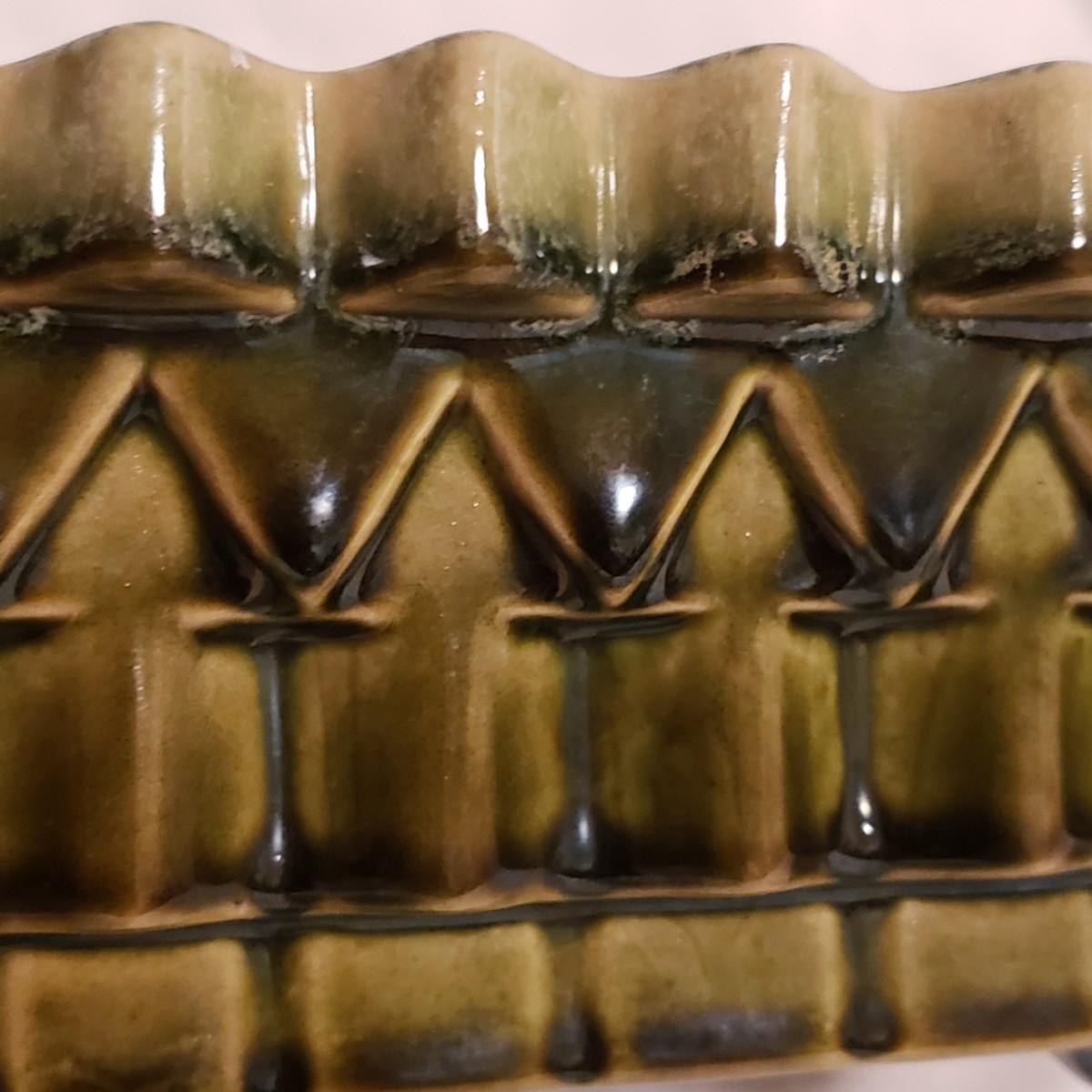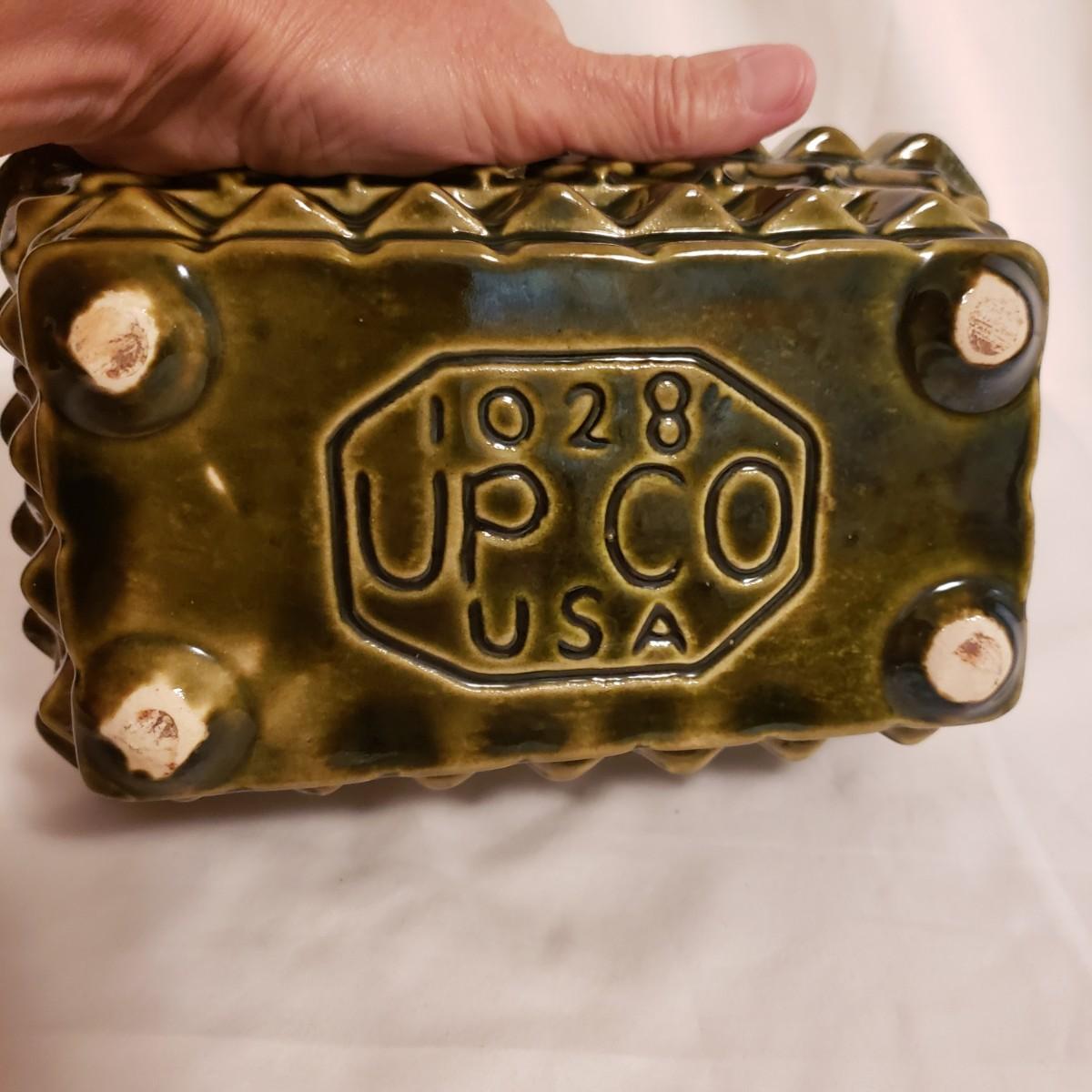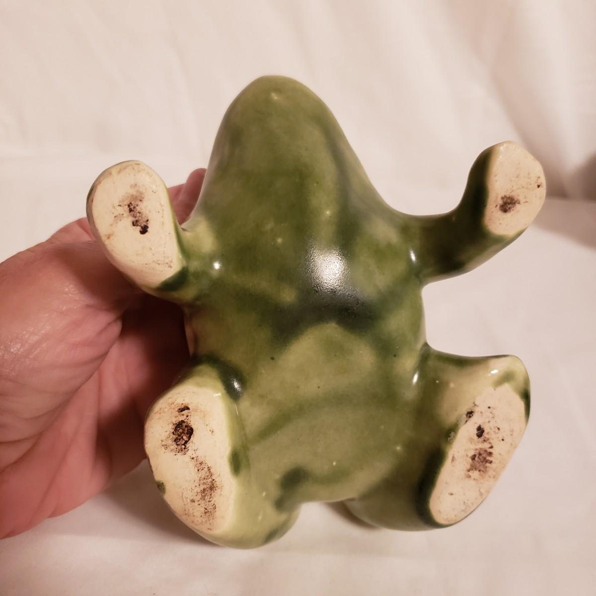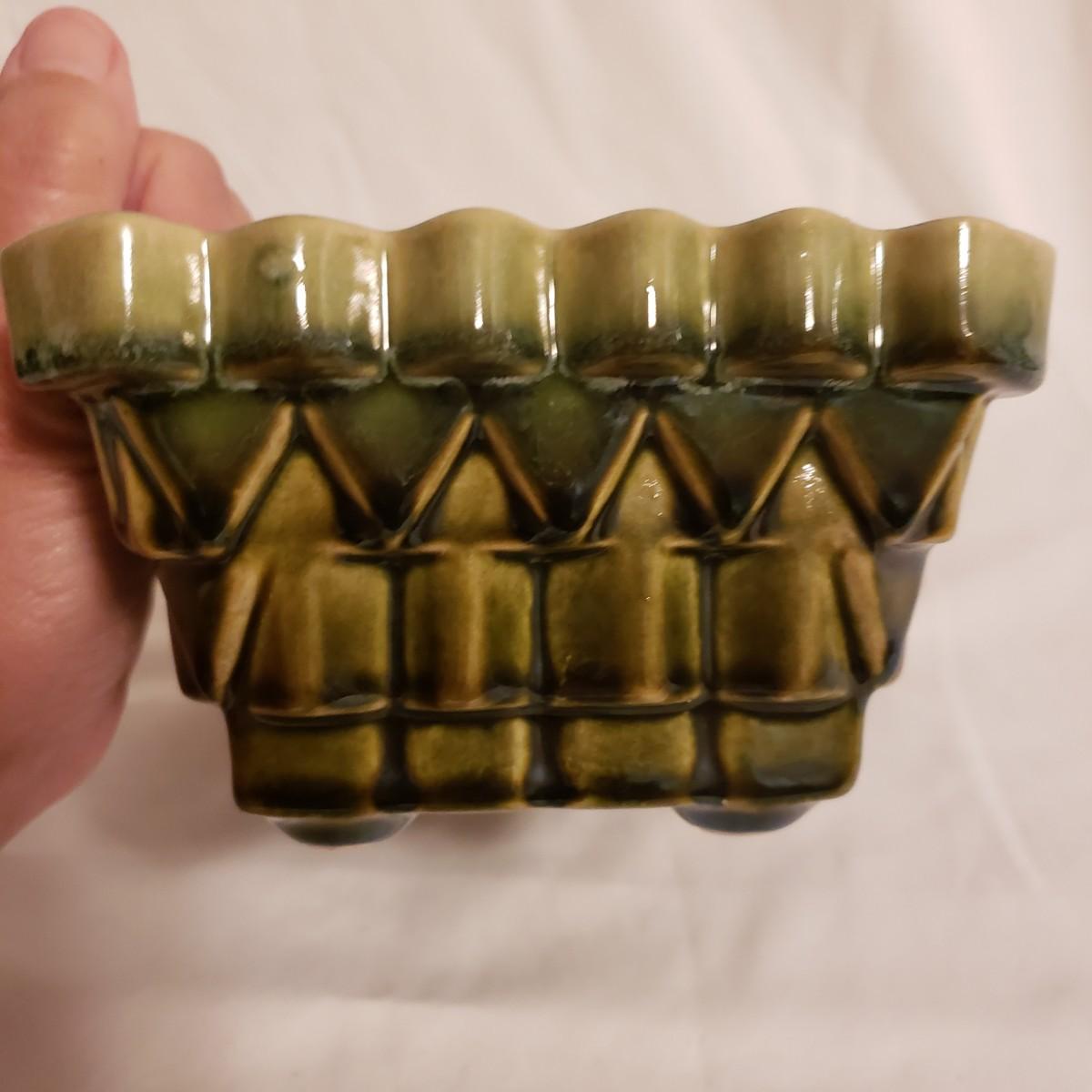 This fun and stylish pottery lot has three gems! The frog would be a perfect succulent pot! The frog measures 6" x 4" x 3"H. It has a crack on the inside rim, see picture. The art deco urn shaped pot has no apparent marking on the bottom. The rippled rectangular bowl is made by Ungemach Pottery Co. USA. It's marked UPCO USA #1028. Please see photos for details.