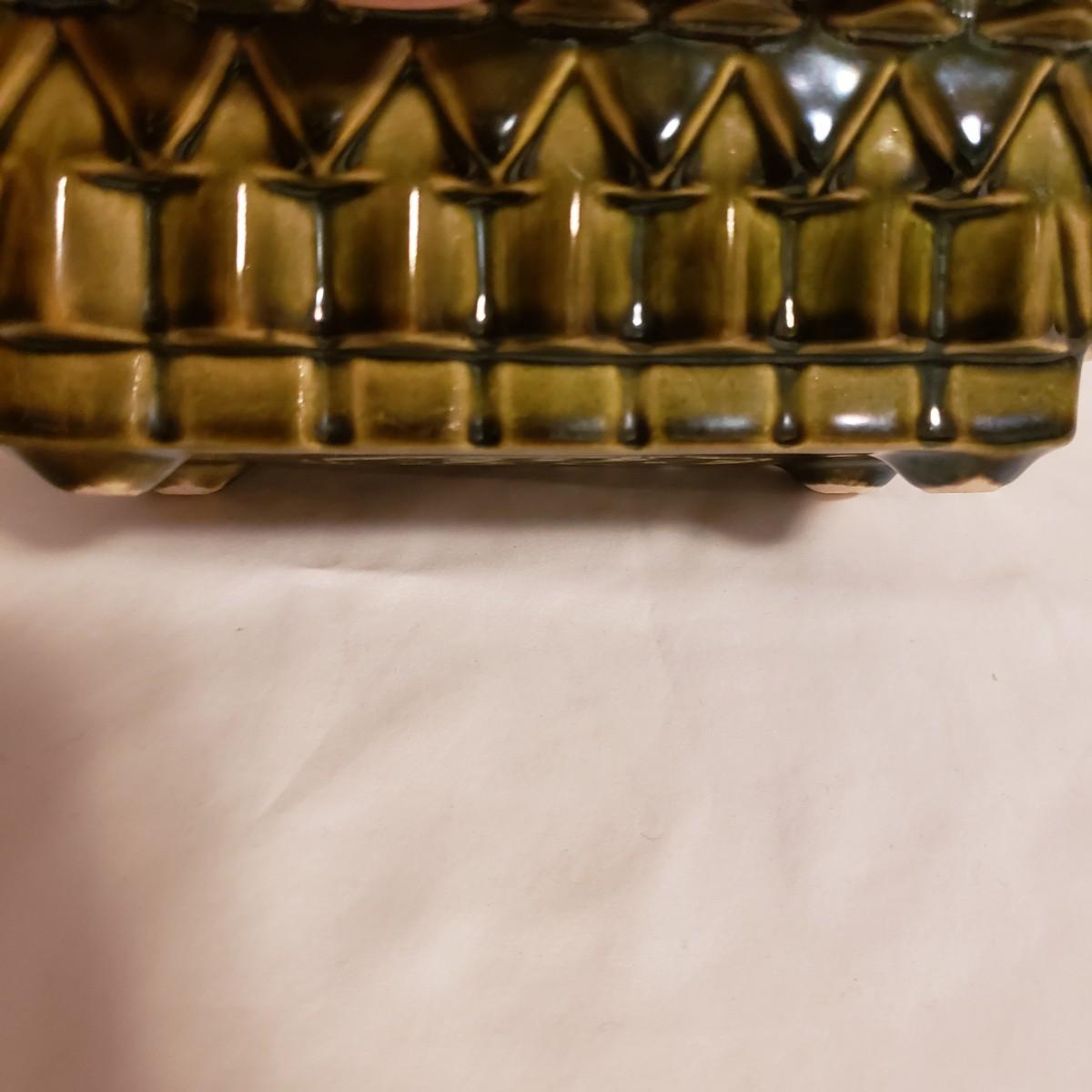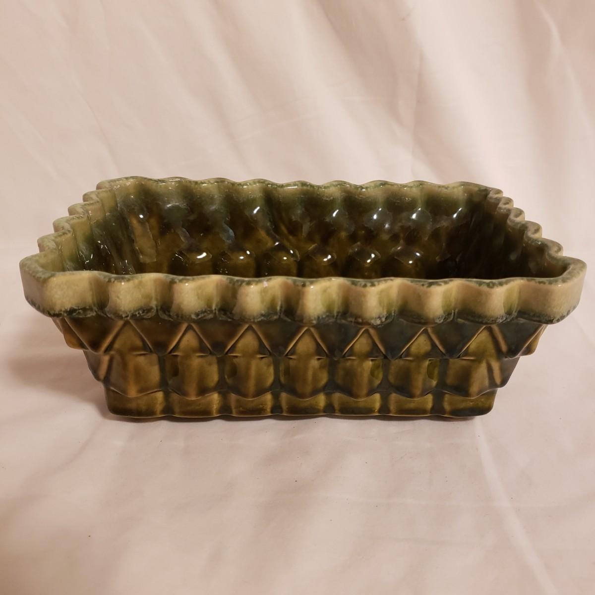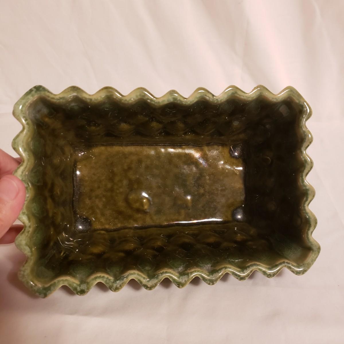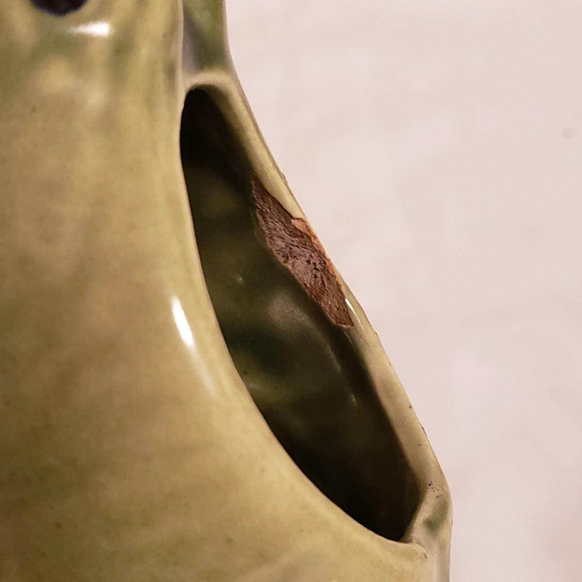 This fun and stylish pottery lot has three gems! The frog would be a perfect succulent pot! The frog measures 6" x 4" x 3"H. It has a crack on the inside rim, see picture. The art deco urn shaped pot has no apparent marking on the bottom. The rippled rectangular bowl is made by Ungemach Pottery Co. USA. It's marked UPCO USA #1028. Please see photos for details.