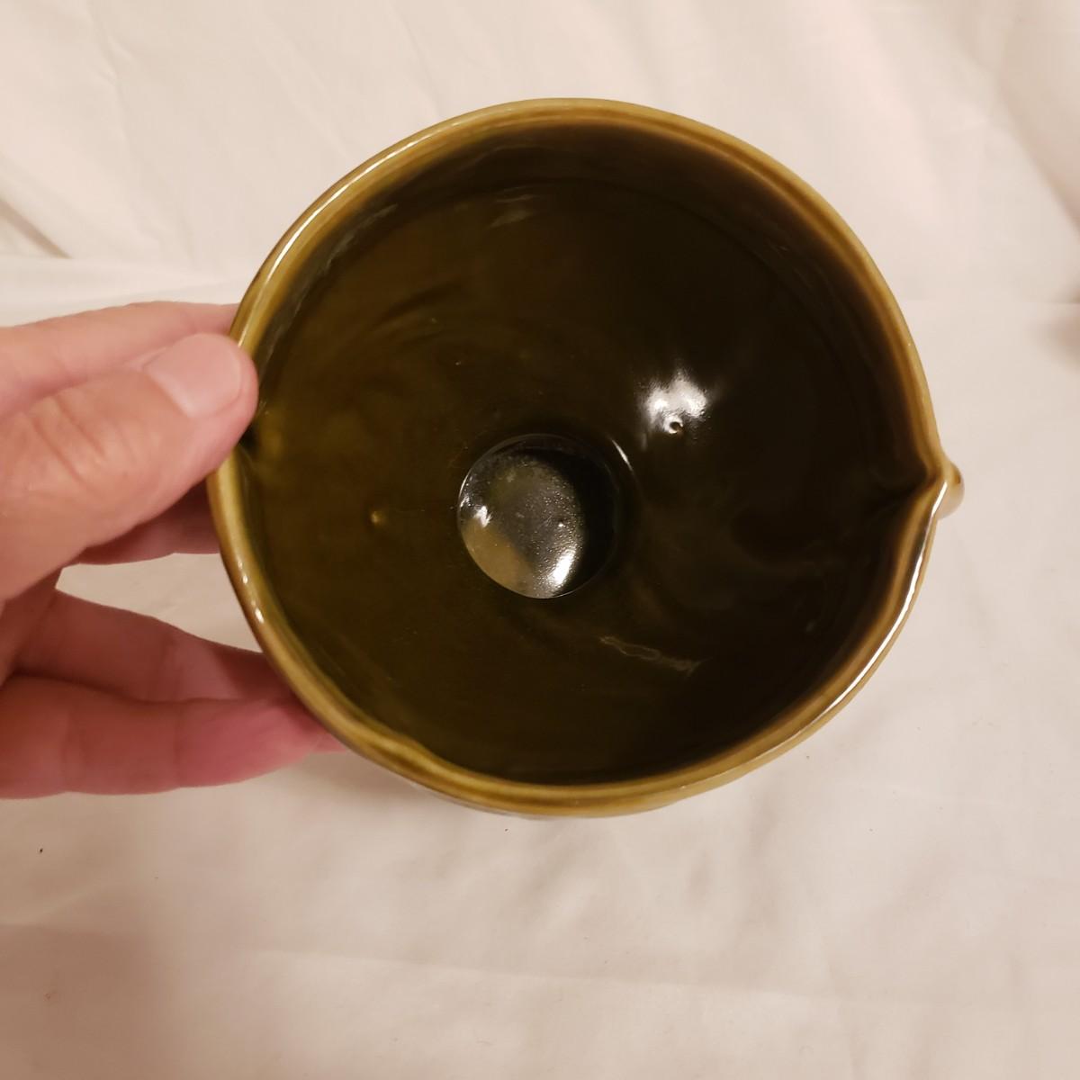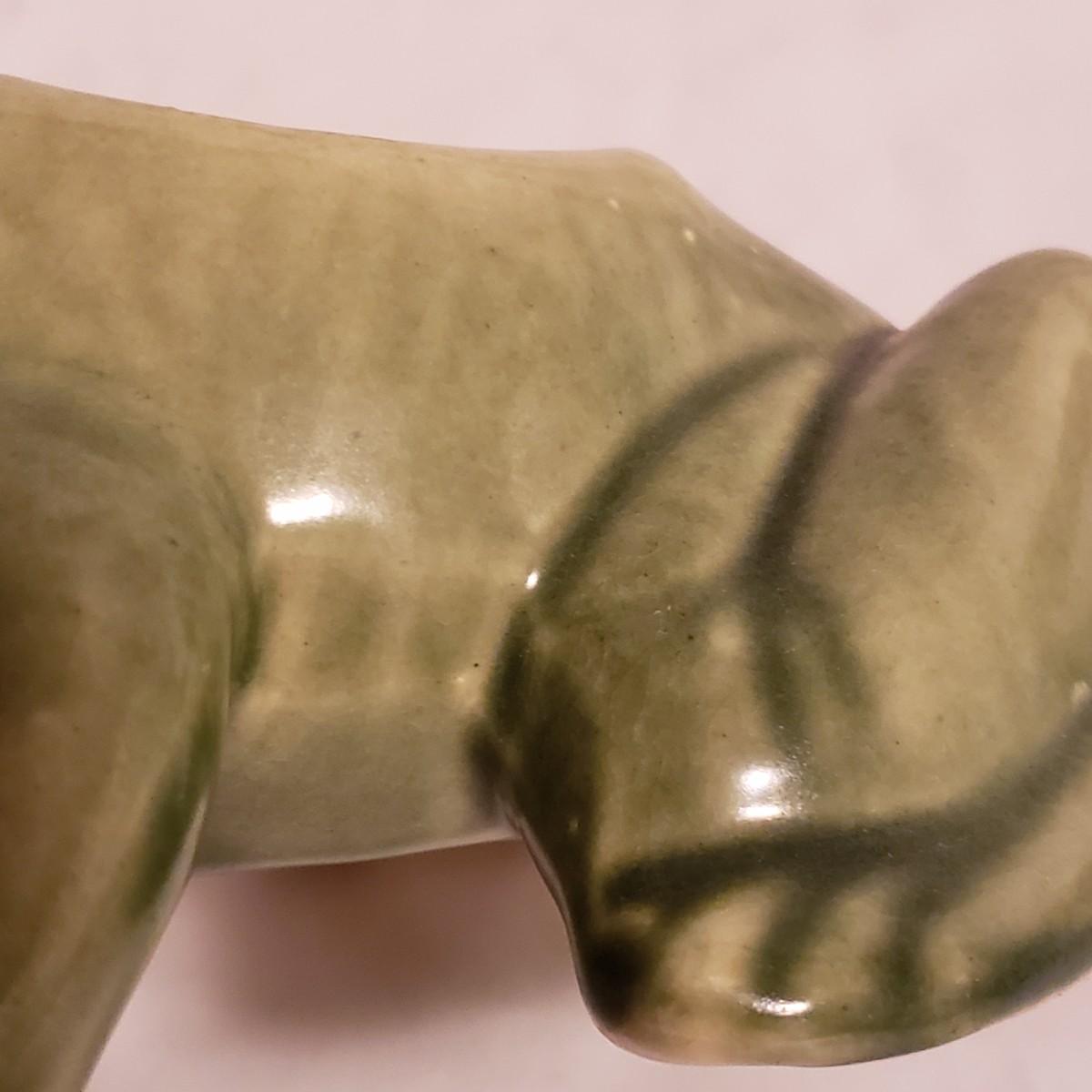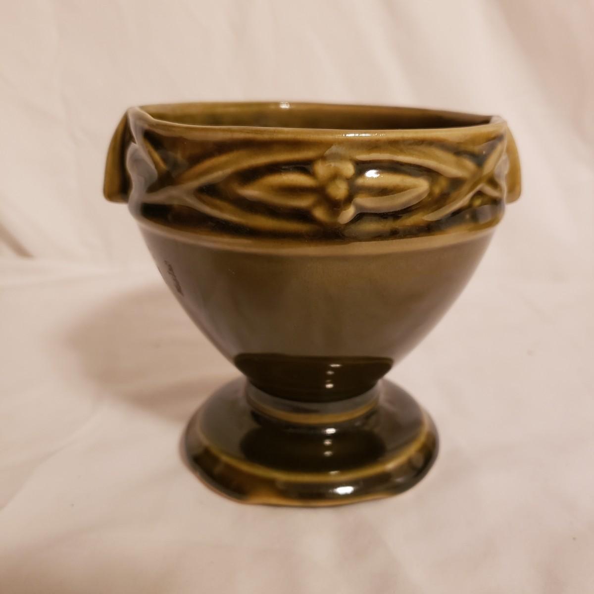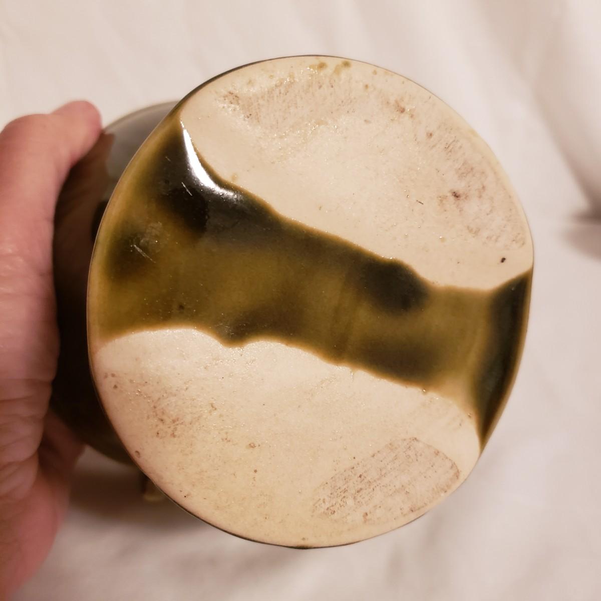 This fun and stylish pottery lot has three gems! The frog would be a perfect succulent pot! The frog measures 6" x 4" x 3"H. It has a crack on the inside rim, see picture. The art deco urn shaped pot has no apparent marking on the bottom. The rippled rectangular bowl is made by Ungemach Pottery Co. USA. It's marked UPCO USA #1028. Please see photos for details.