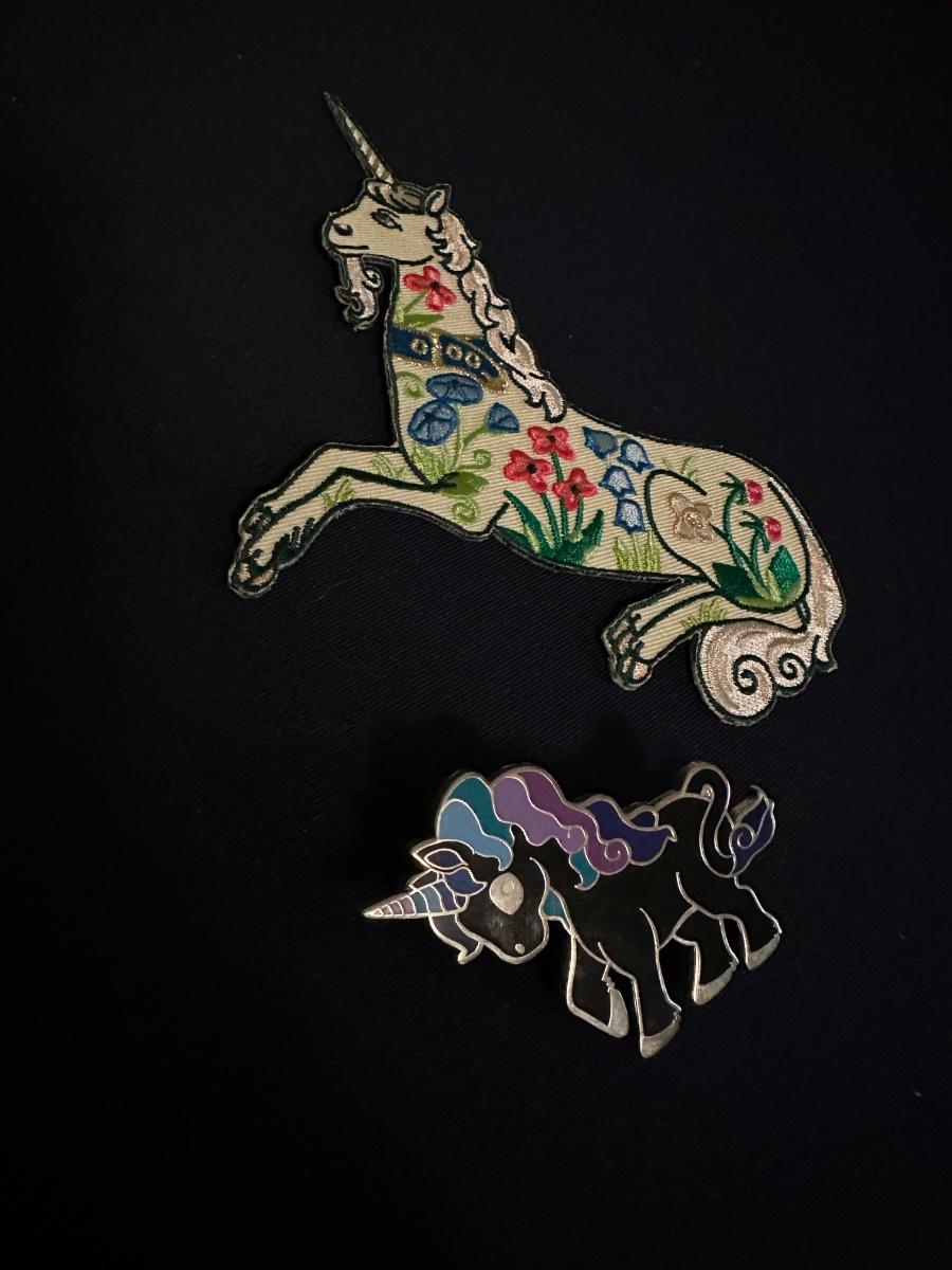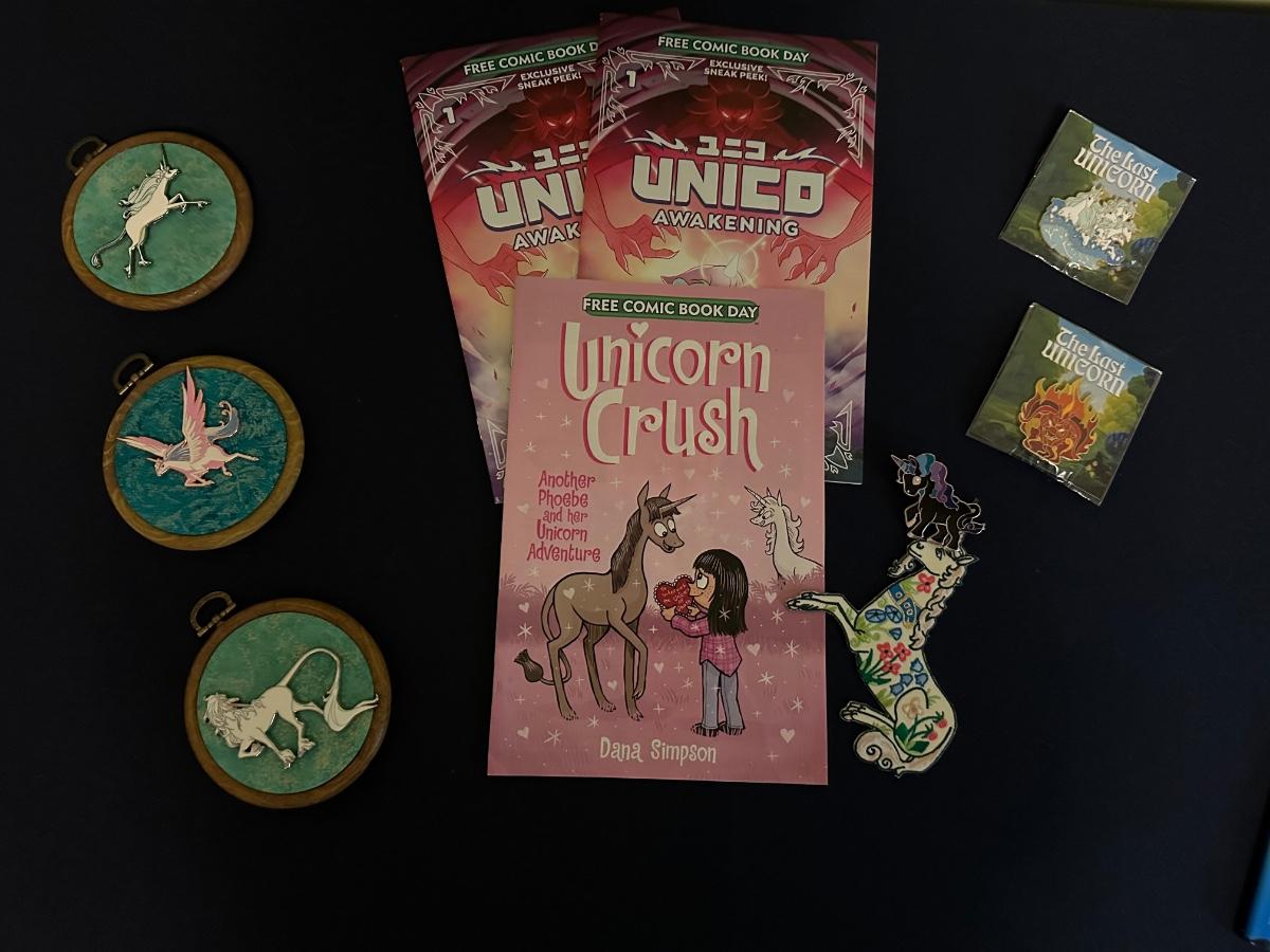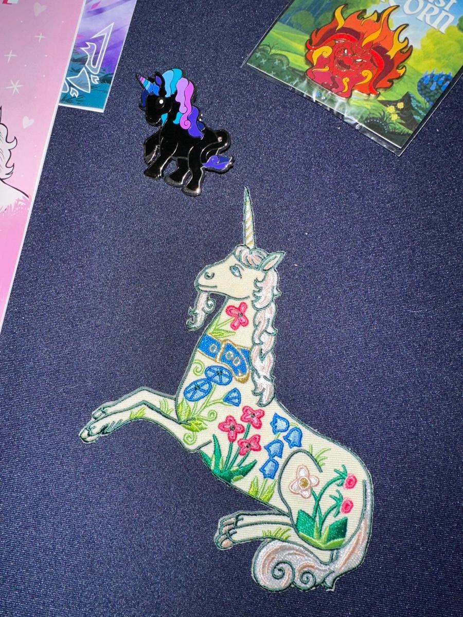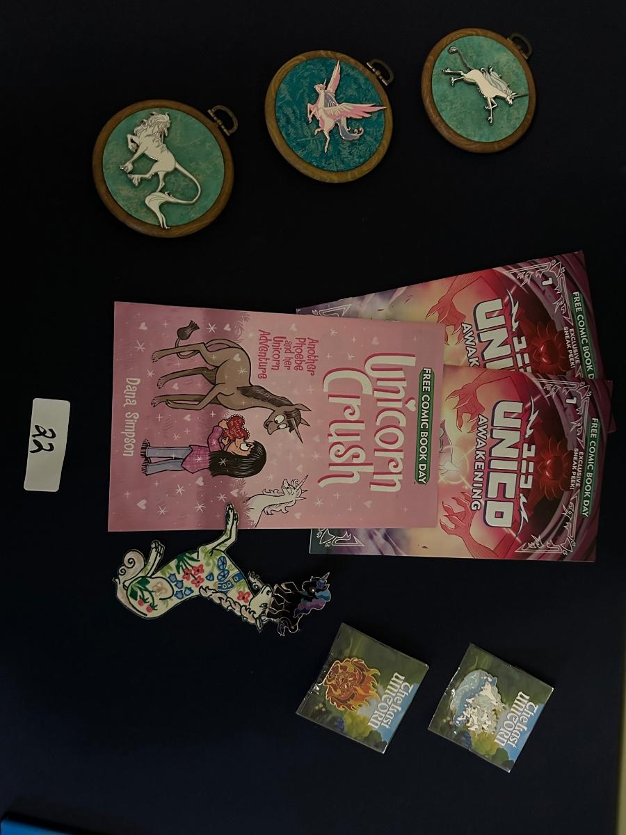 6 ENAMEL UNICORN PINS, 2 NEW IN PKG, 3 UNICORN CRUCH COMICS, UNICORN PATCH