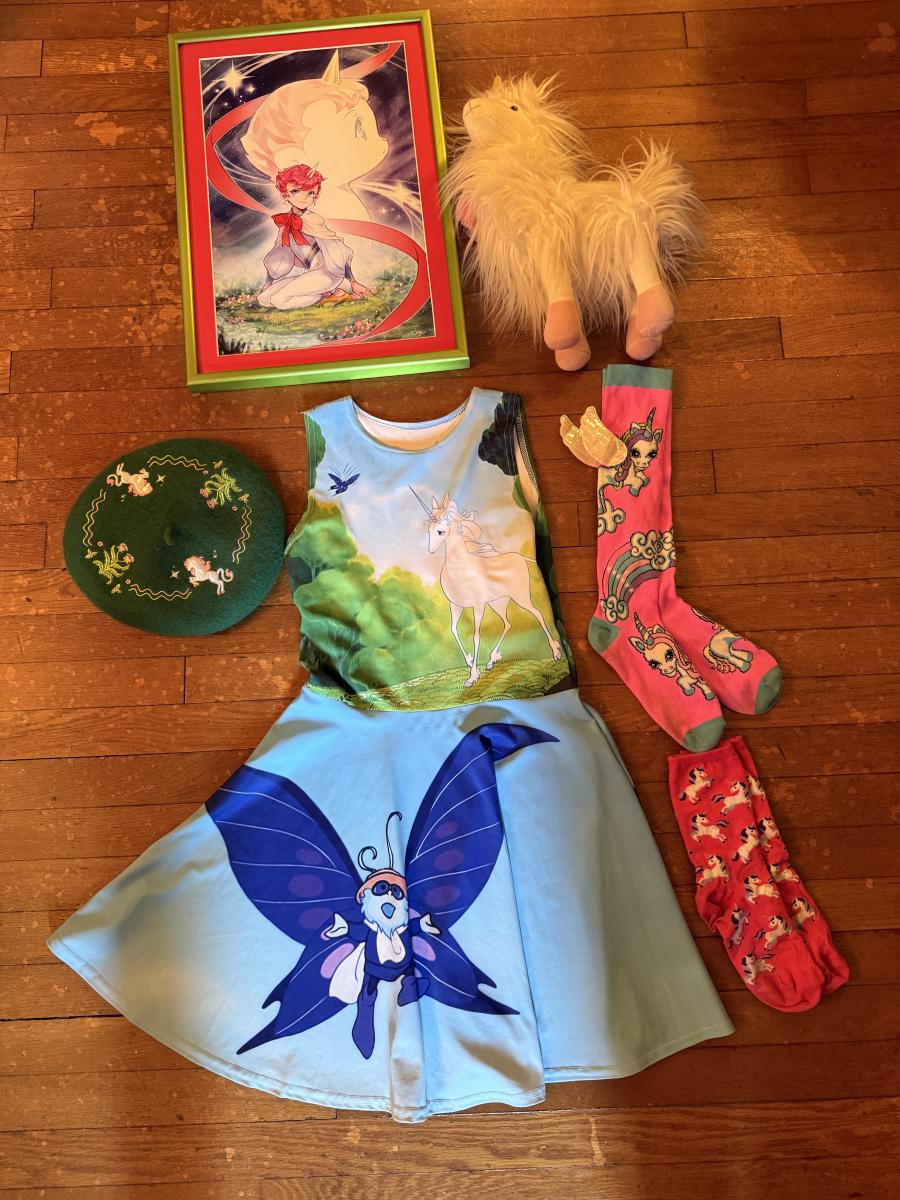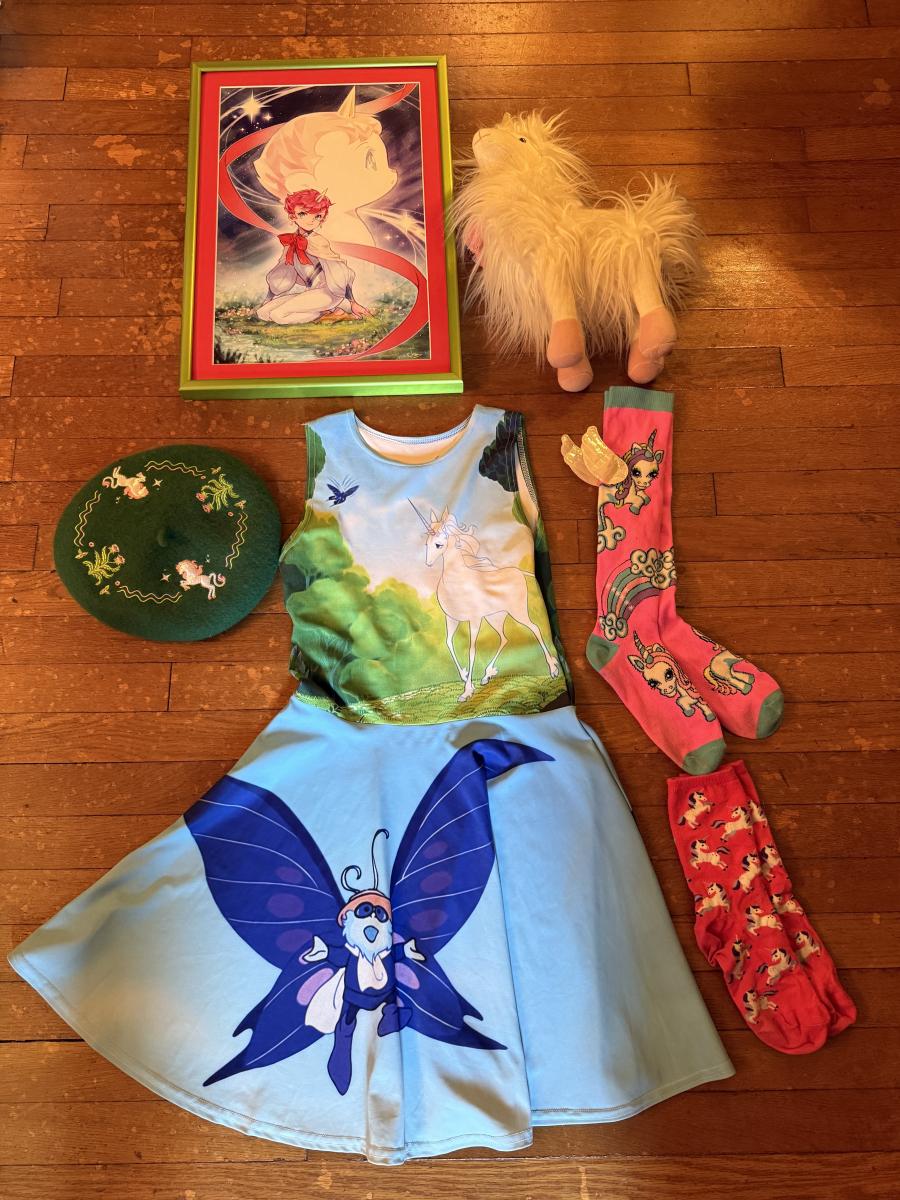 UNICORN LOT INCLUDES THE LAST UNICORN GOLD BUBBLE DRESS, FELTED BEANIE, SICKS, STUFFED ANIMAL FRAMED CHARACTER