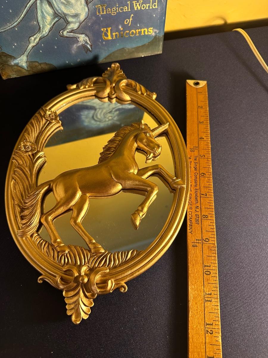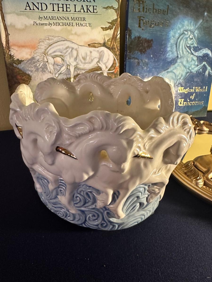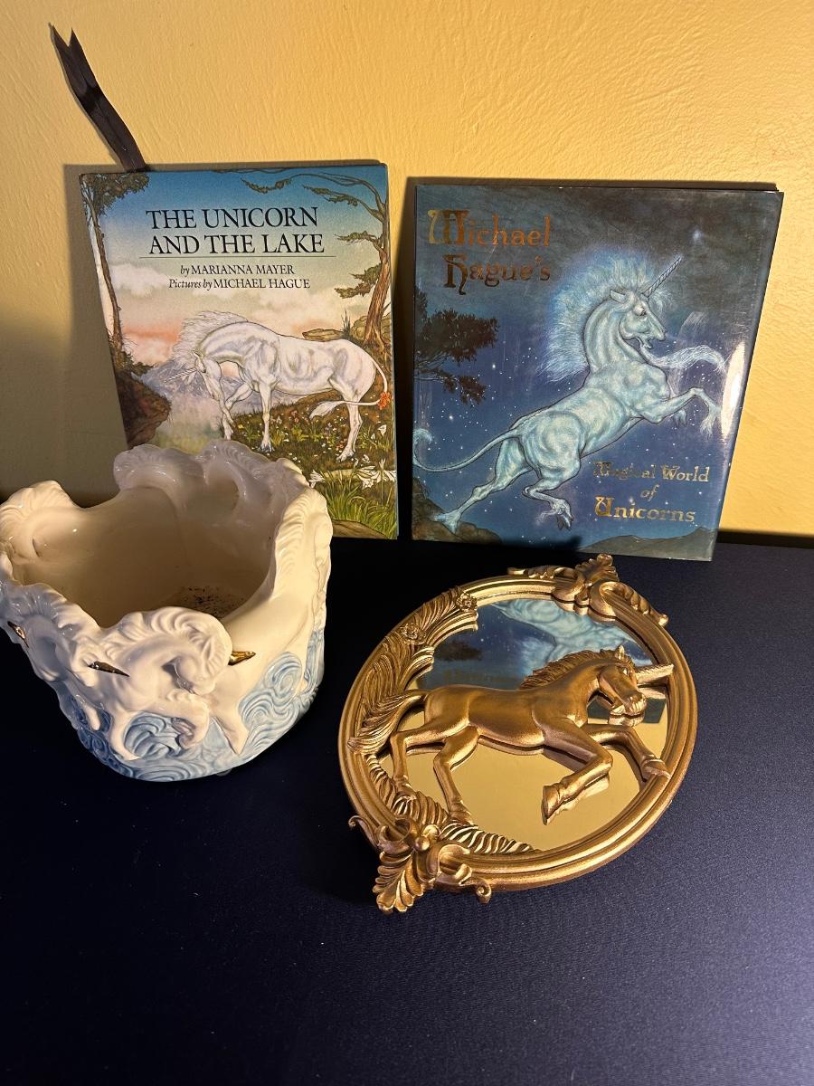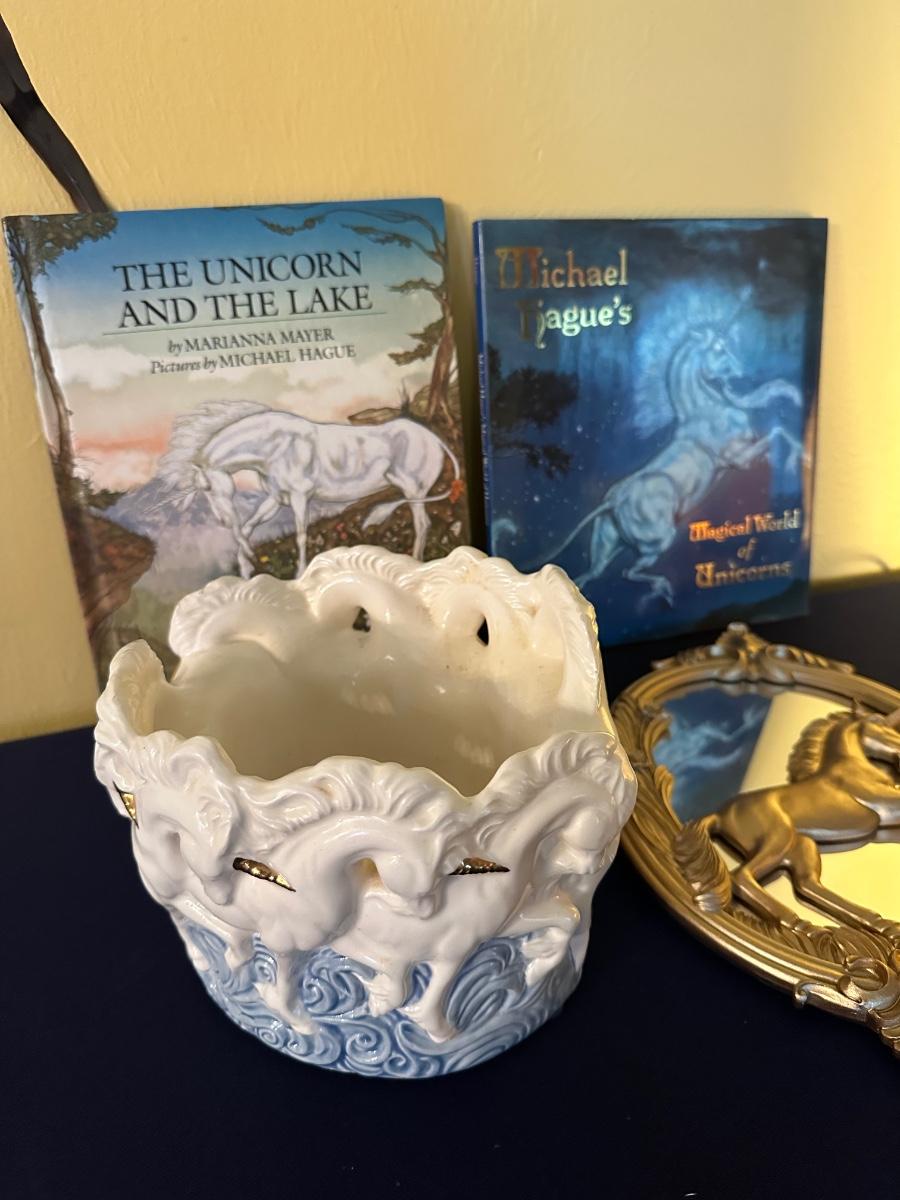 TWO UNICORN BOOKS, UNICORN PLANTER, GOLD UNICORN MIRROR