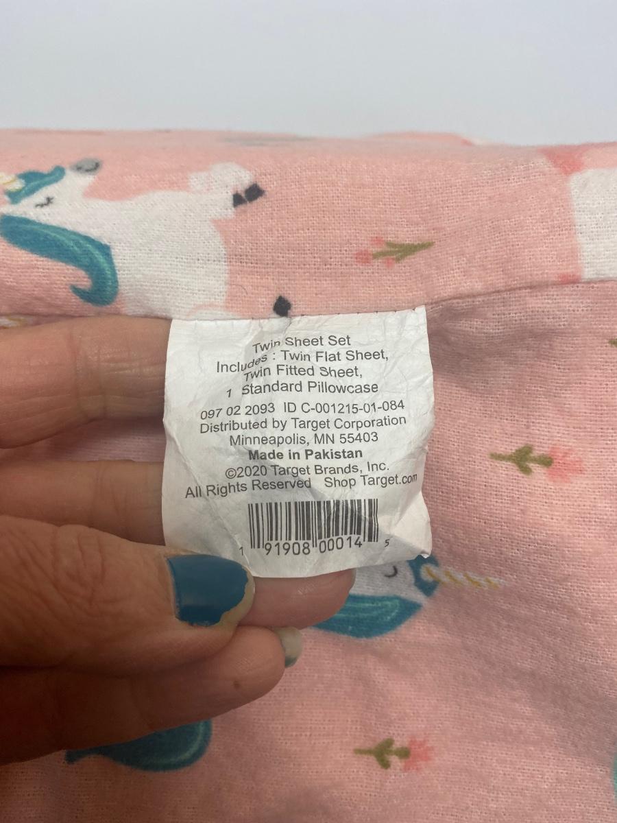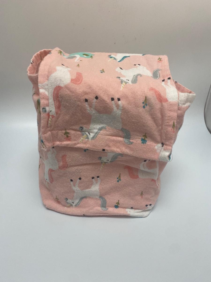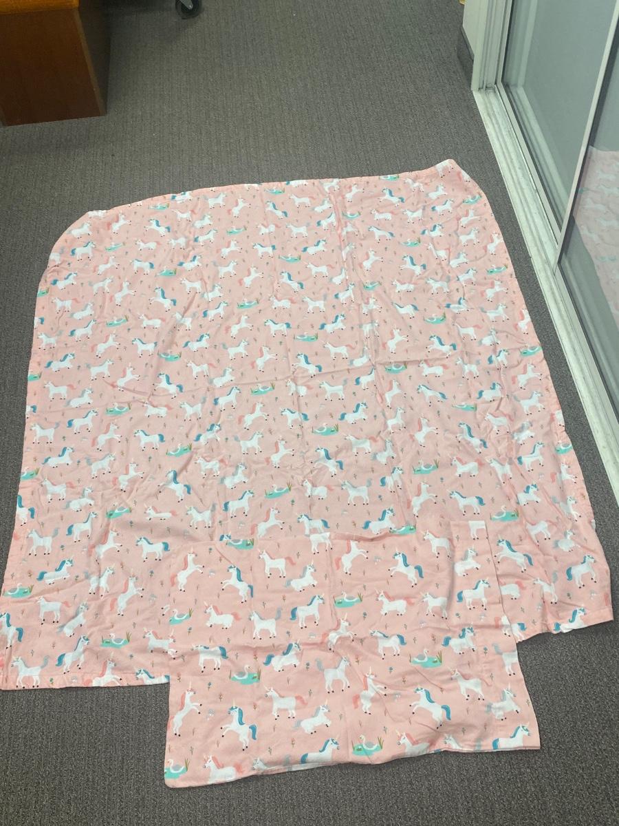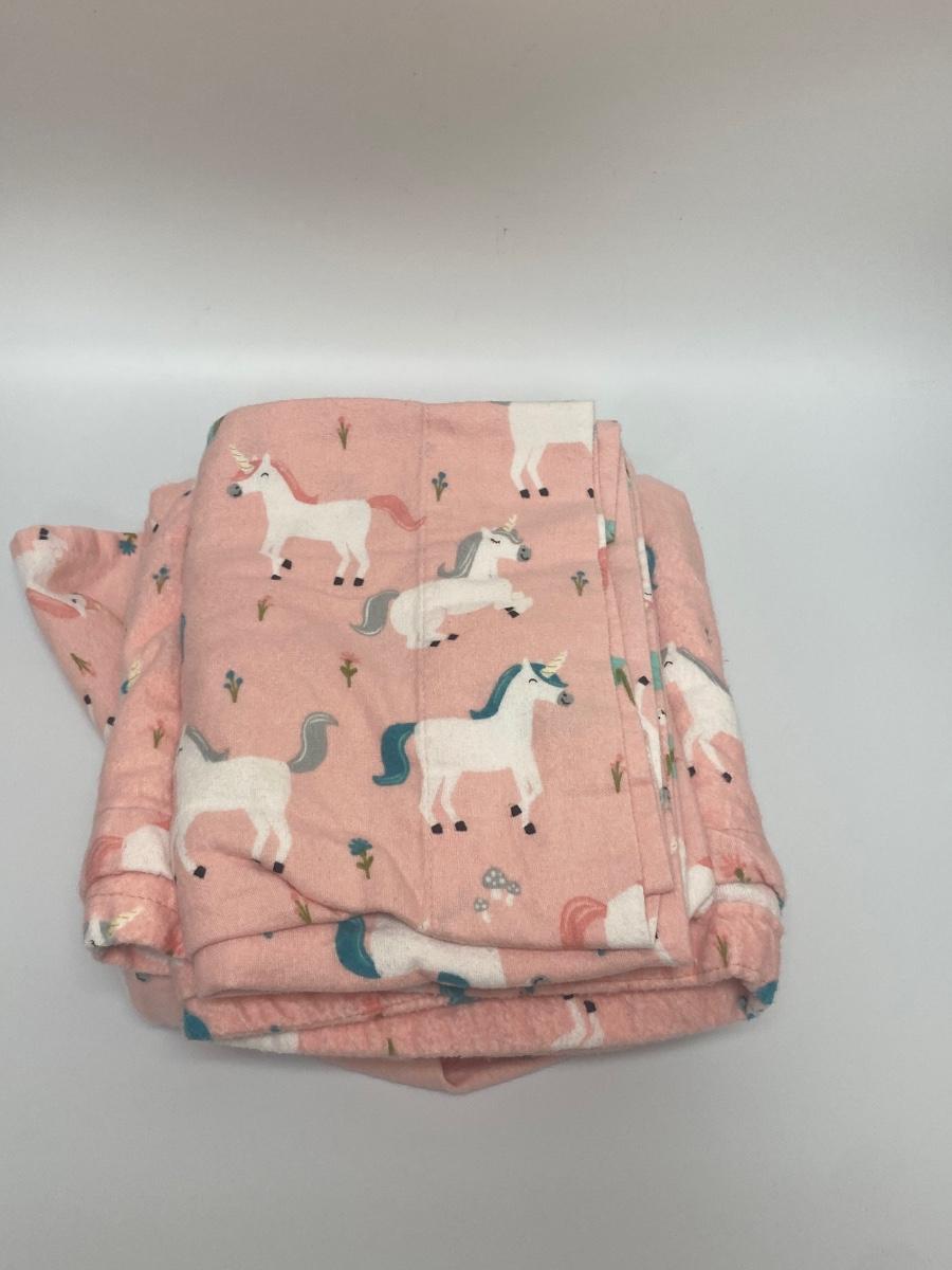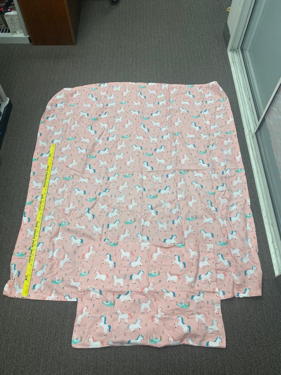 Peachy pink unicorn patterned flannel sheet and pillowcase set with bag. Good condition. Tag says the sheet is twin bed size, but it looks smaller. No fitted sheet.
