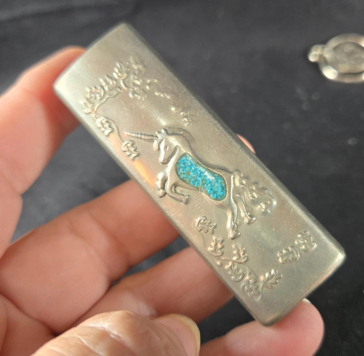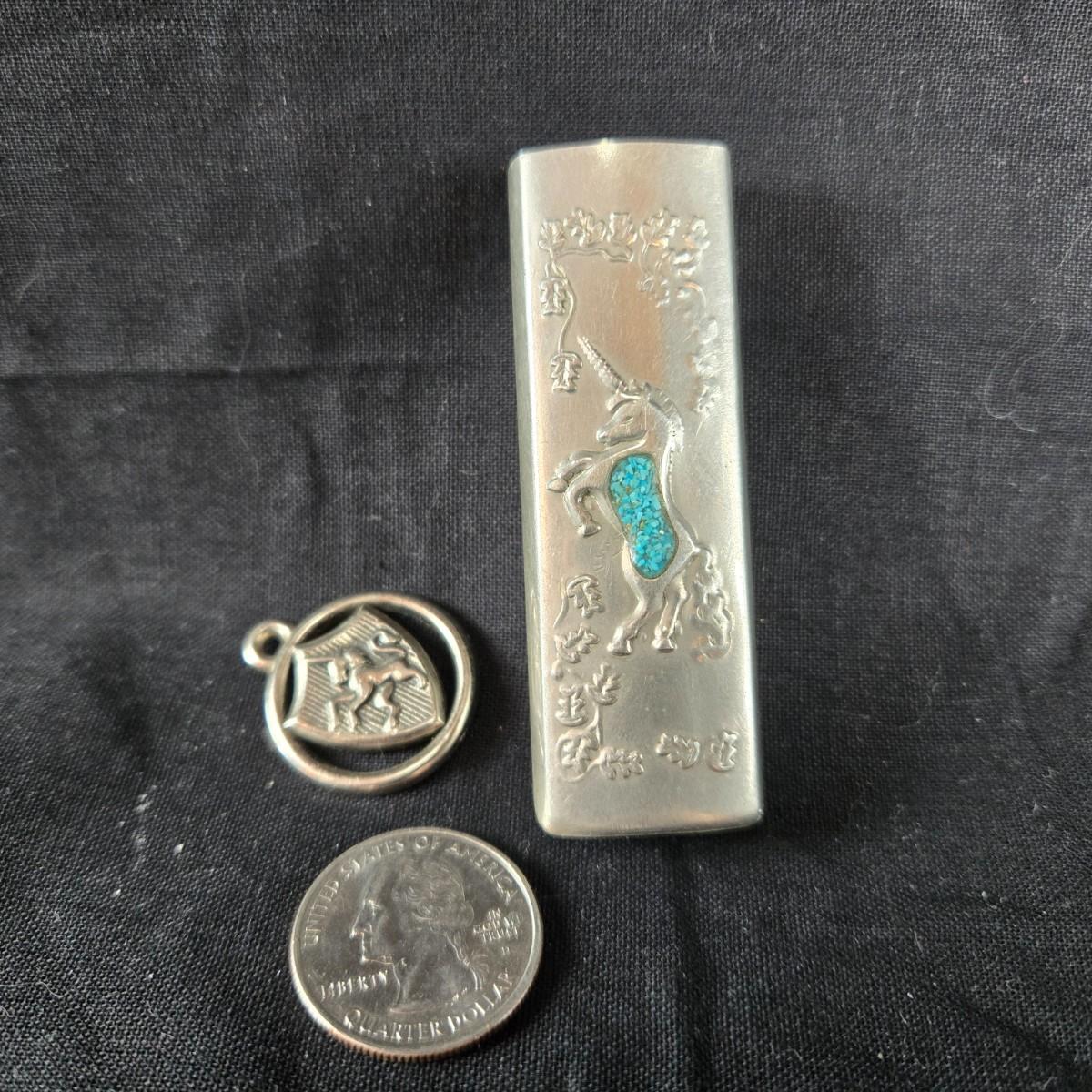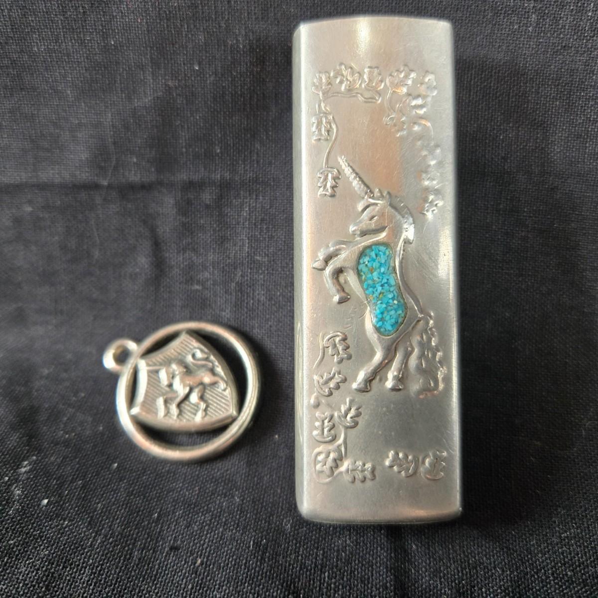 This auction lot is for two Unicorn Themed Collectibles, One item in the lot is a Unicorn Lighter Cover. It is aluminum with what looks to be a turquoise inset. It is about 2-5/8-inches long x 1-inch wide. The other item is a unicorn on a shield pendant - stainless. It is 1-inch in diameter.