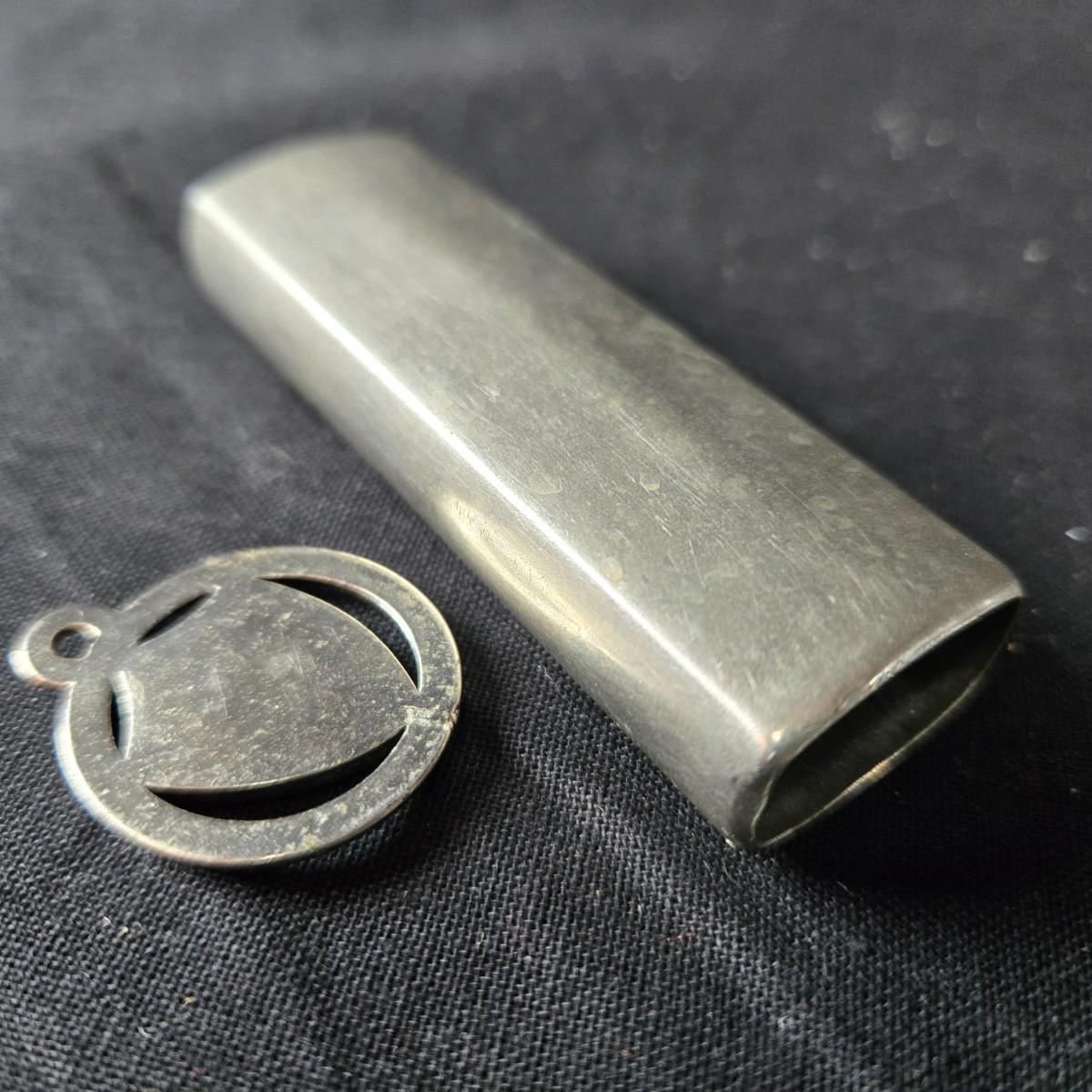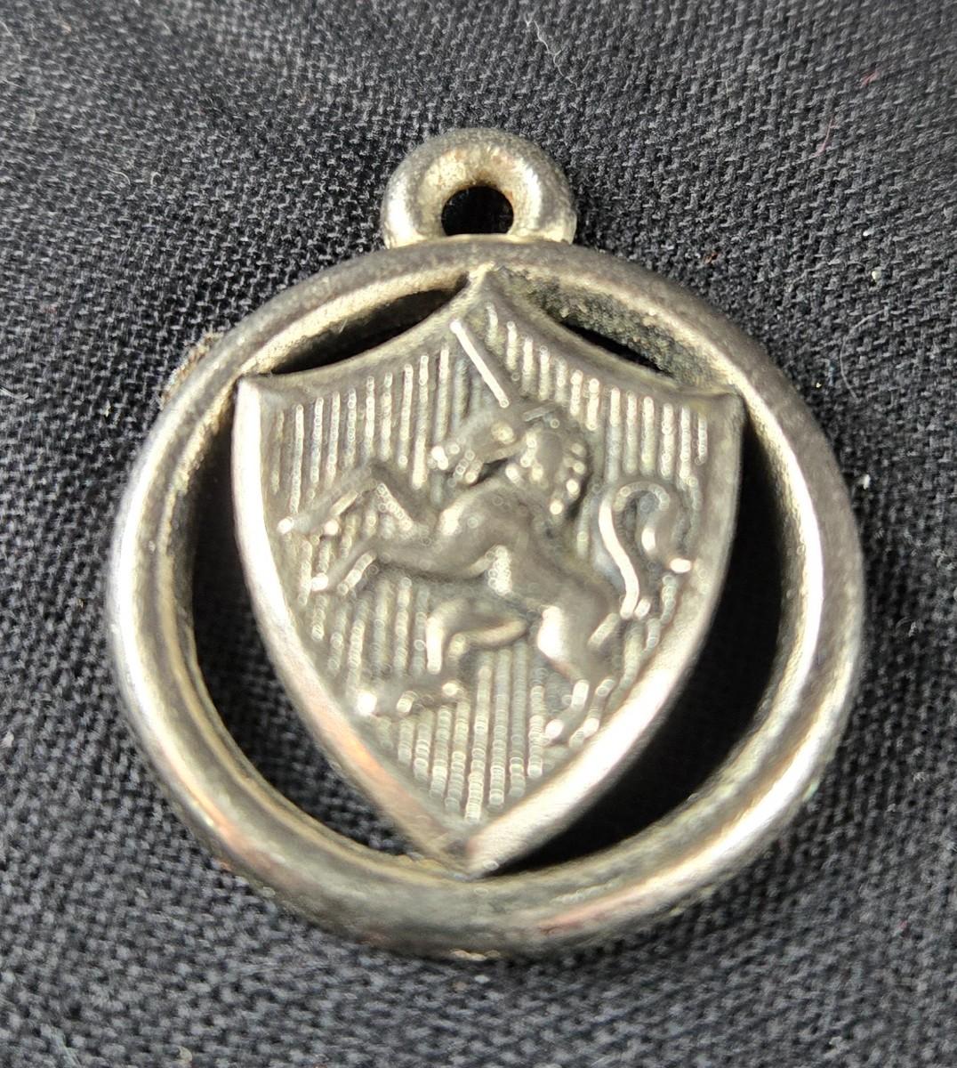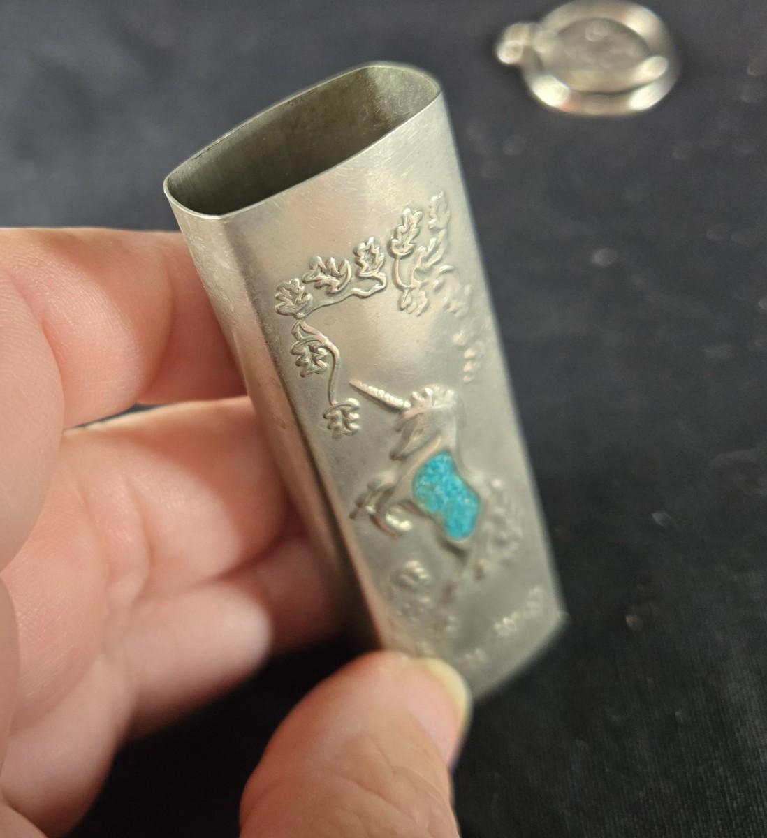 This auction lot is for two Unicorn Themed Collectibles, One item in the lot is a Unicorn Lighter Cover. It is aluminum with what looks to be a turquoise inset. It is about 2-5/8-inches long x 1-inch wide. The other item is a unicorn on a shield pendant - stainless. It is 1-inch in diameter.