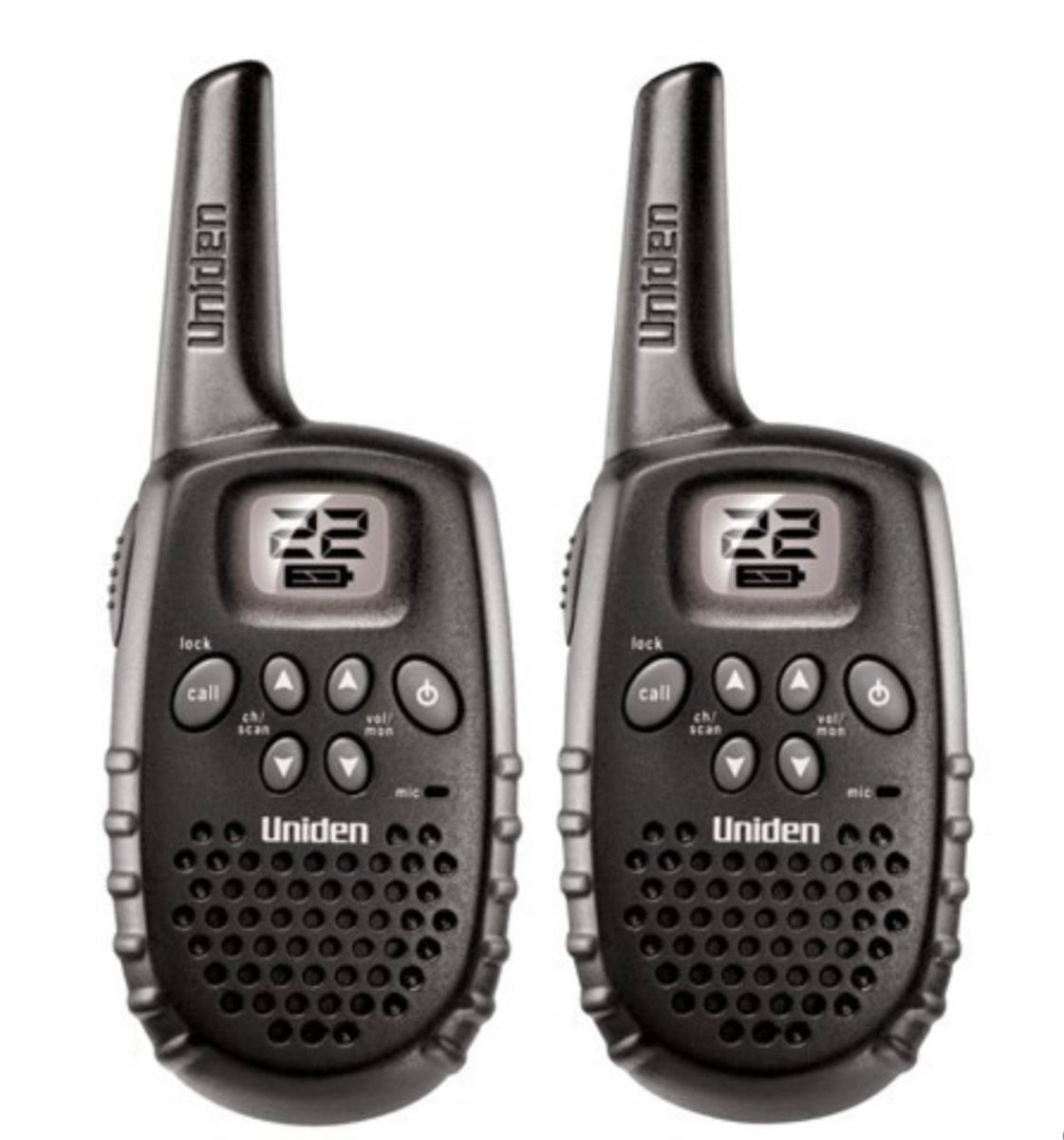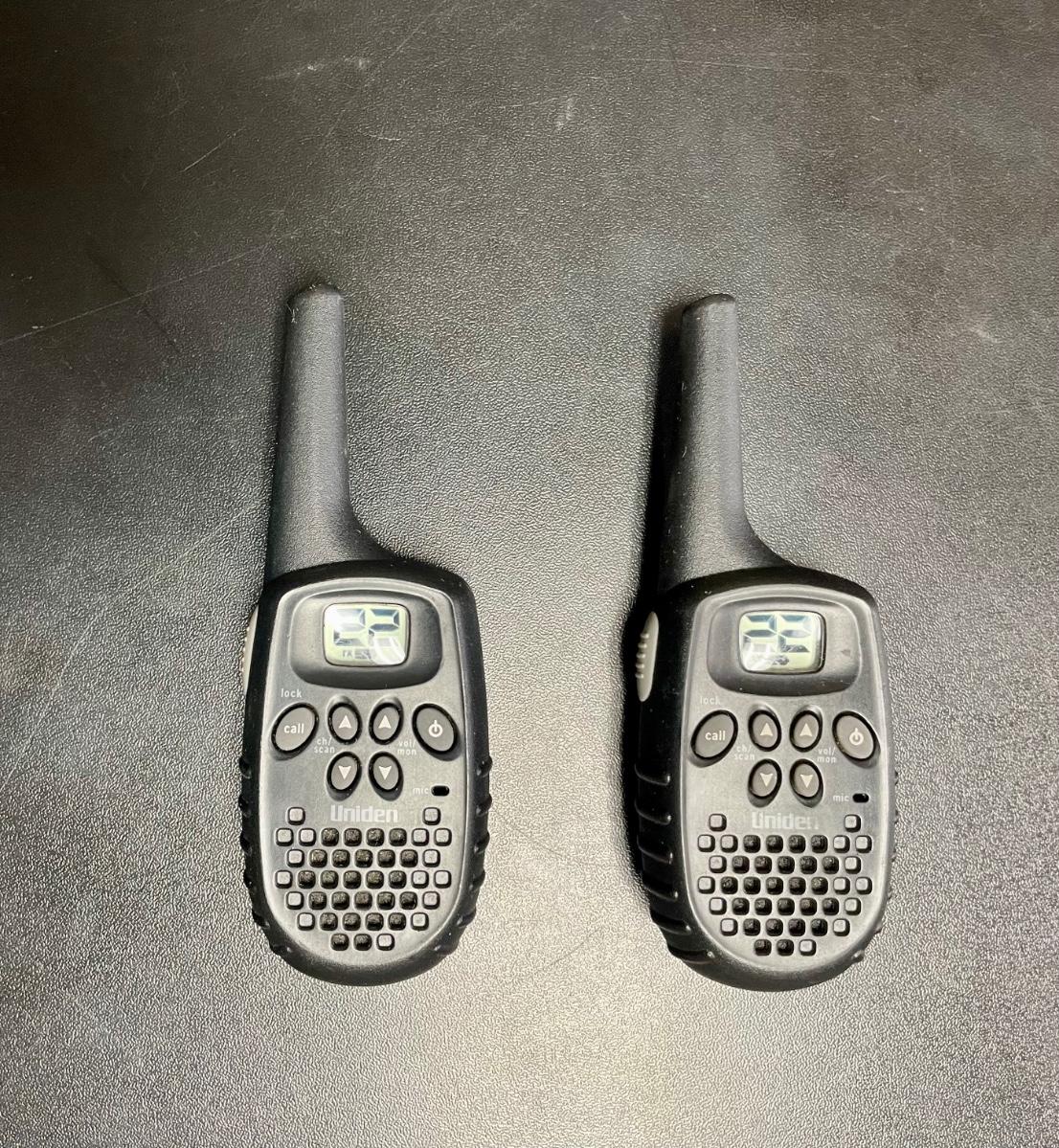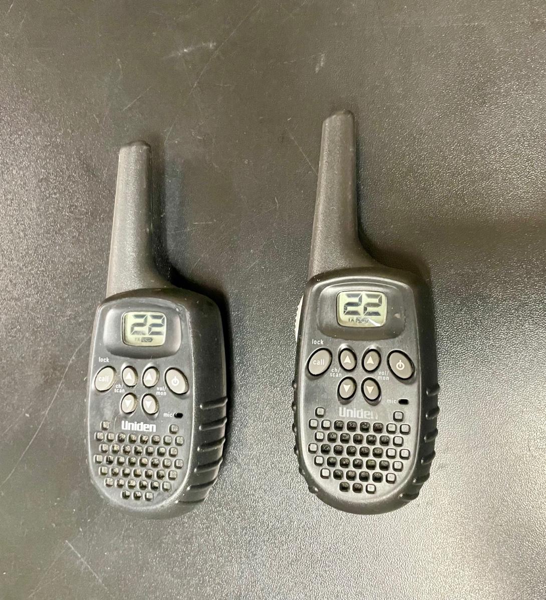 2-way radios with up to 16 miles range in ideal conditions. Features include 22 channels, call tone button, channel up-down and volume up-down buttons, on-off button, and push-to-talk button on the side. Takes 3 AAA batteries. Tested, both work as expected.