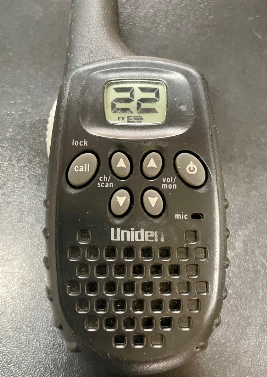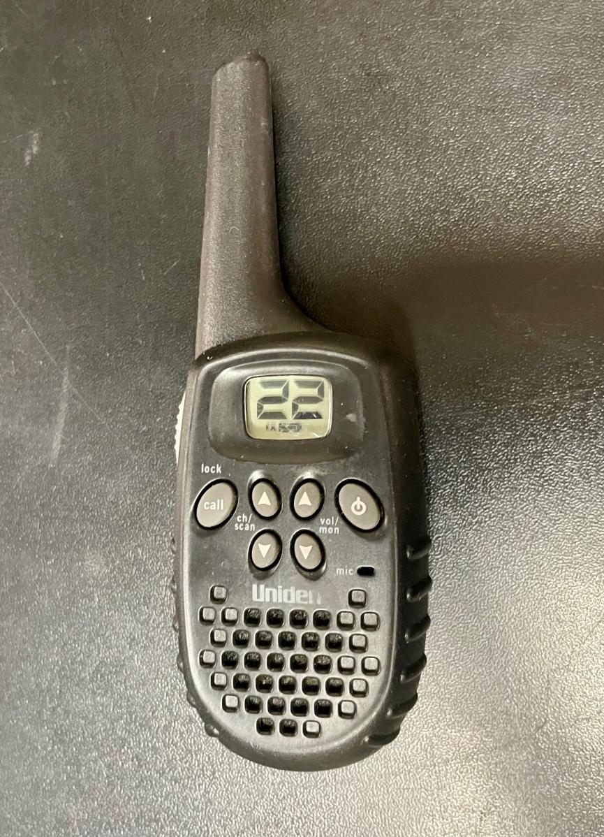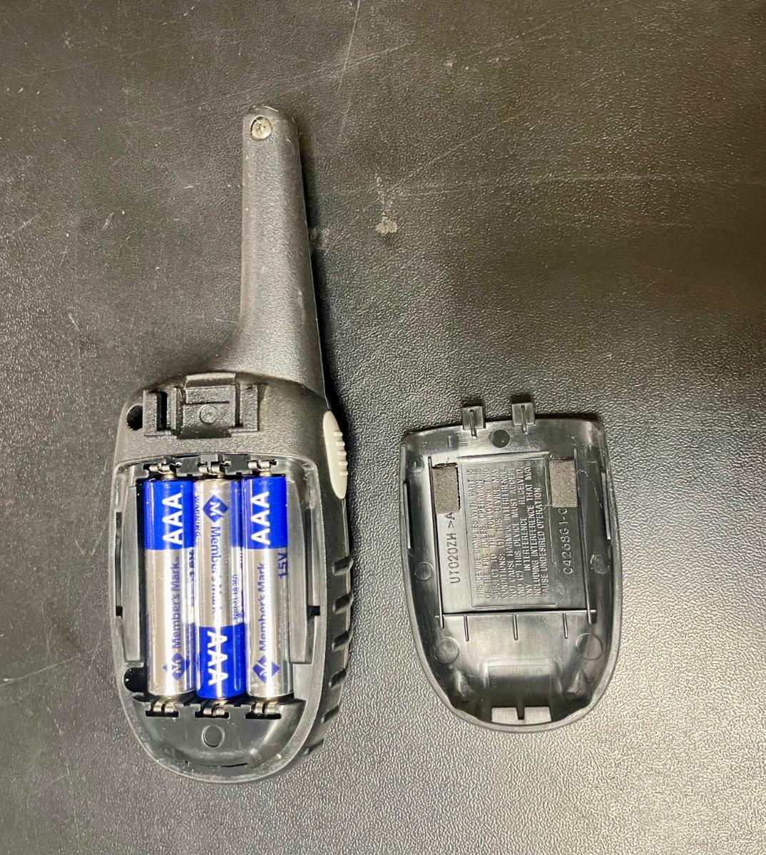 2-way radios with up to 16 miles range in ideal conditions. Features include 22 channels, call tone button, channel up-down and volume up-down buttons, on-off button, and push-to-talk button on the side. Takes 3 AAA batteries. Tested, both work as expected.