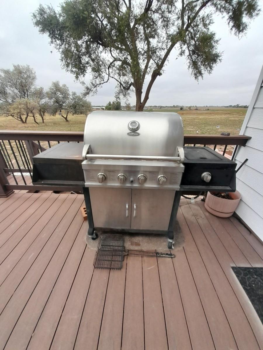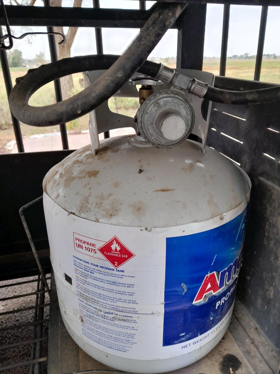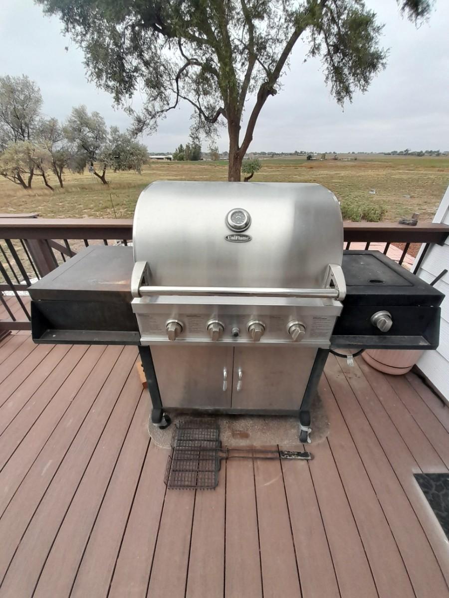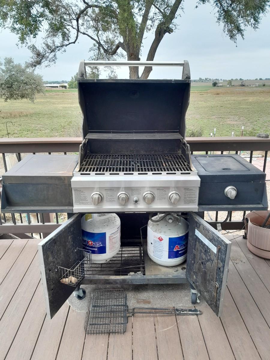 UNIFLAME STAINLESS STEEL BARBEQUE GRILL WITH TWO PROPANE TANKS