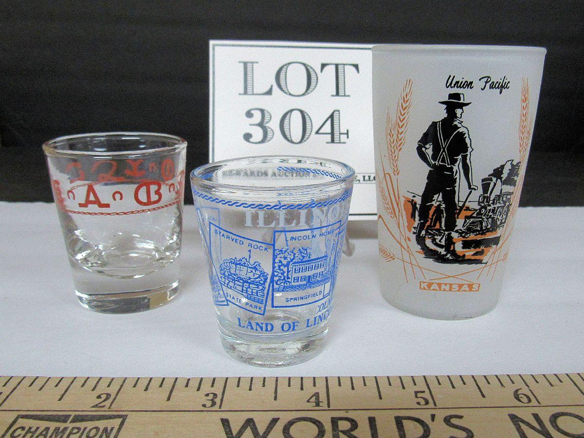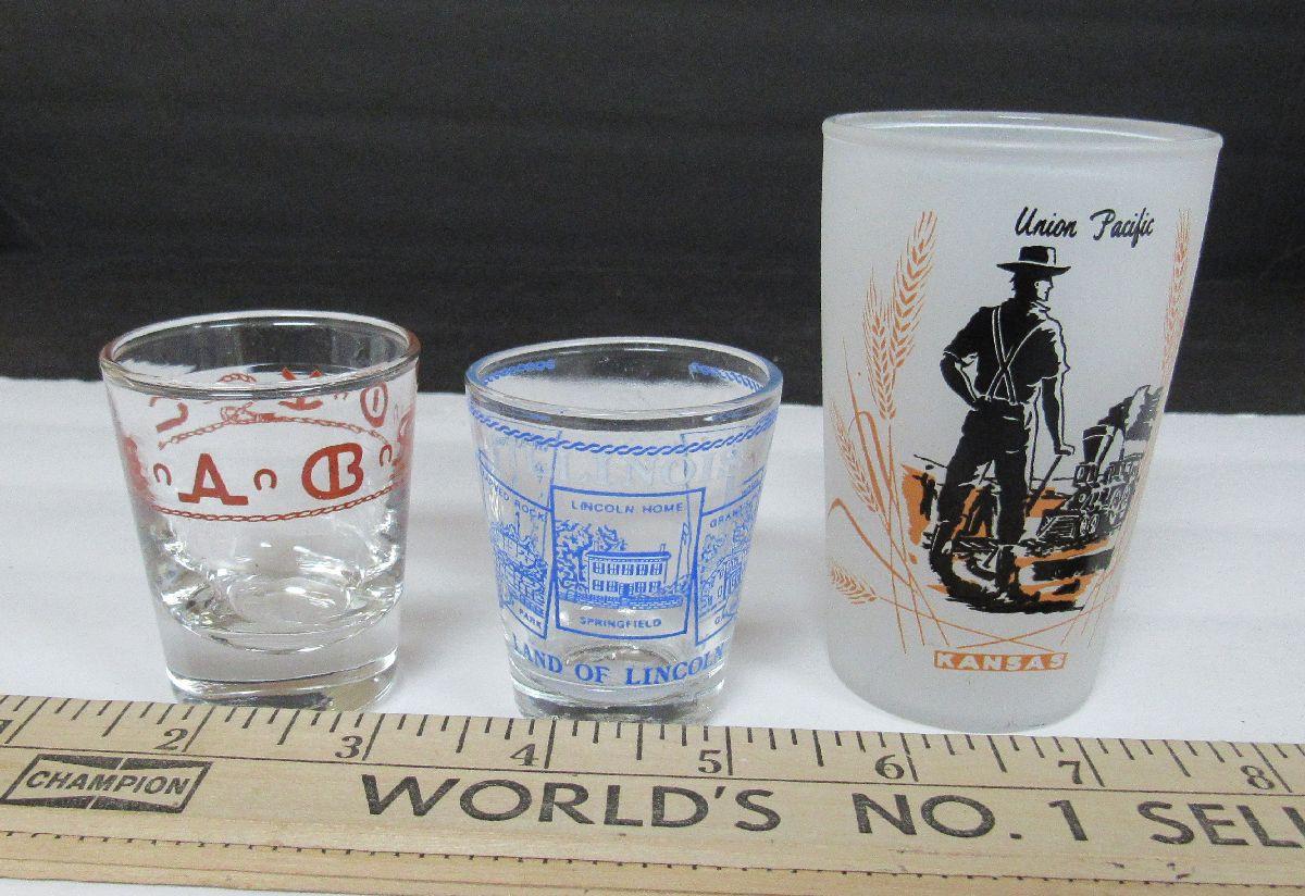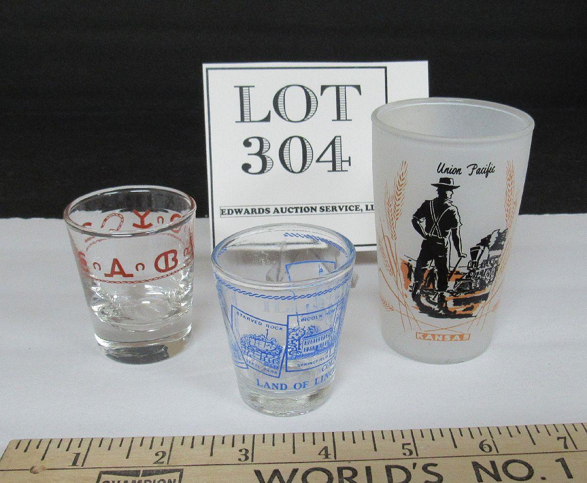 Union Pacific Rail Road Tumbler, Illinois Shot Glass, and Libbey Westward Ho Ranch Shot Glass
