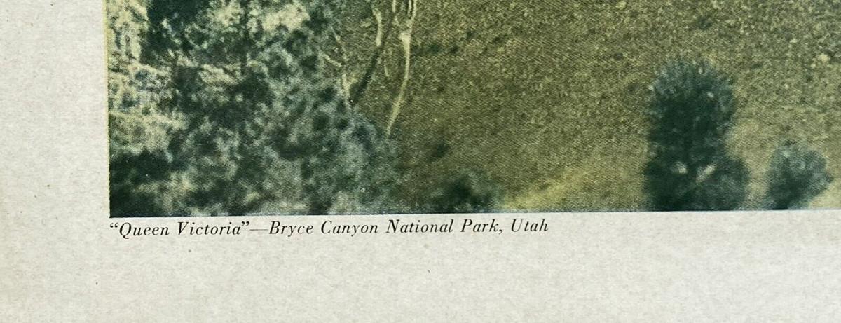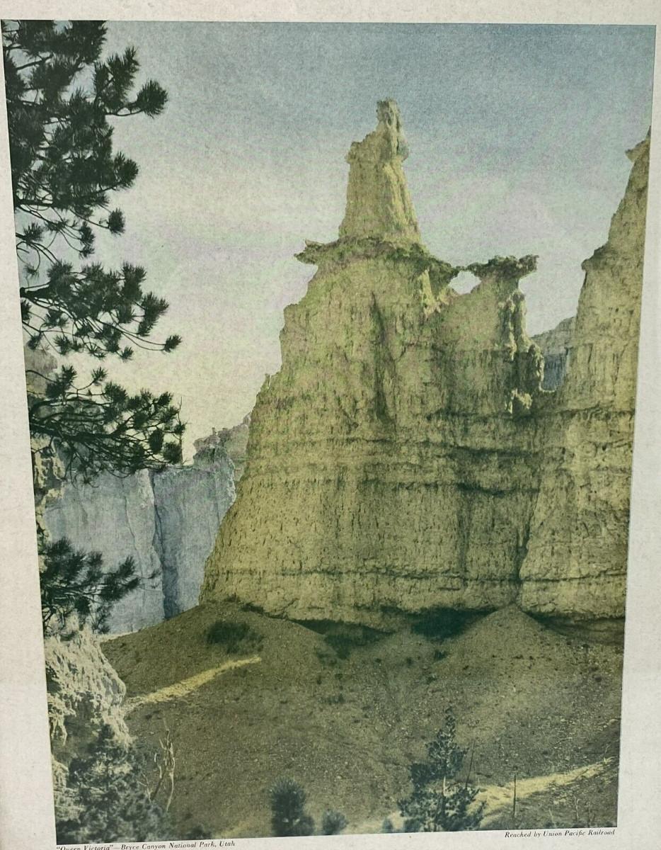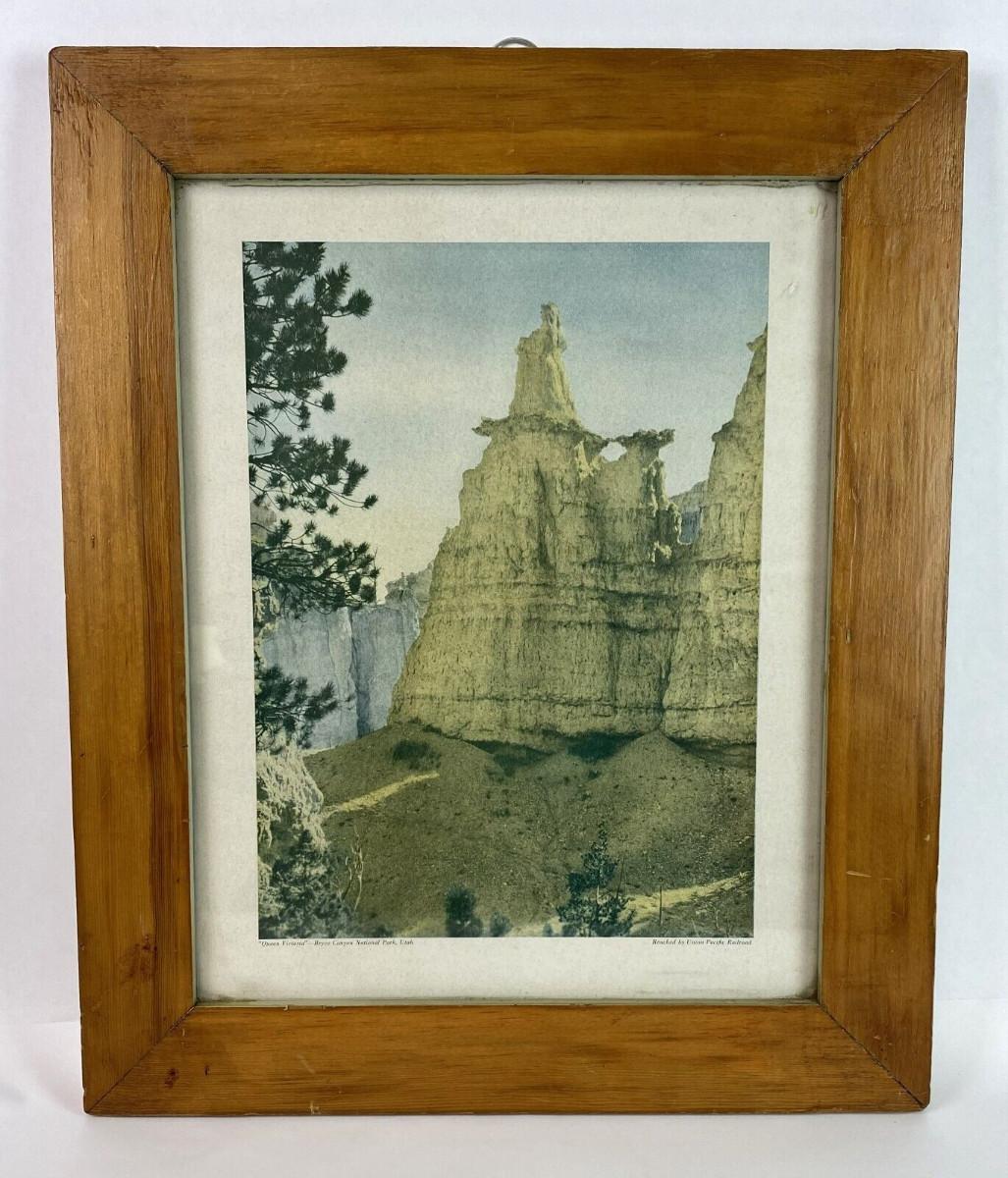 an early, tinted photo print of the '"QUEEN VICTORIA" hoodoo in Bryce Canyon National Park, Utah - Reached by Union Pacific Railroad' captioned promotional print circa 1930s-40s...Homemade frame with a pull-tab for hanging...wood frame is 17.5 x 14.75"...The image measures 13.75 x 10.5"...Shipping is based on the frame..which we can remove if that is your preference, adjusting shipping accordingly.