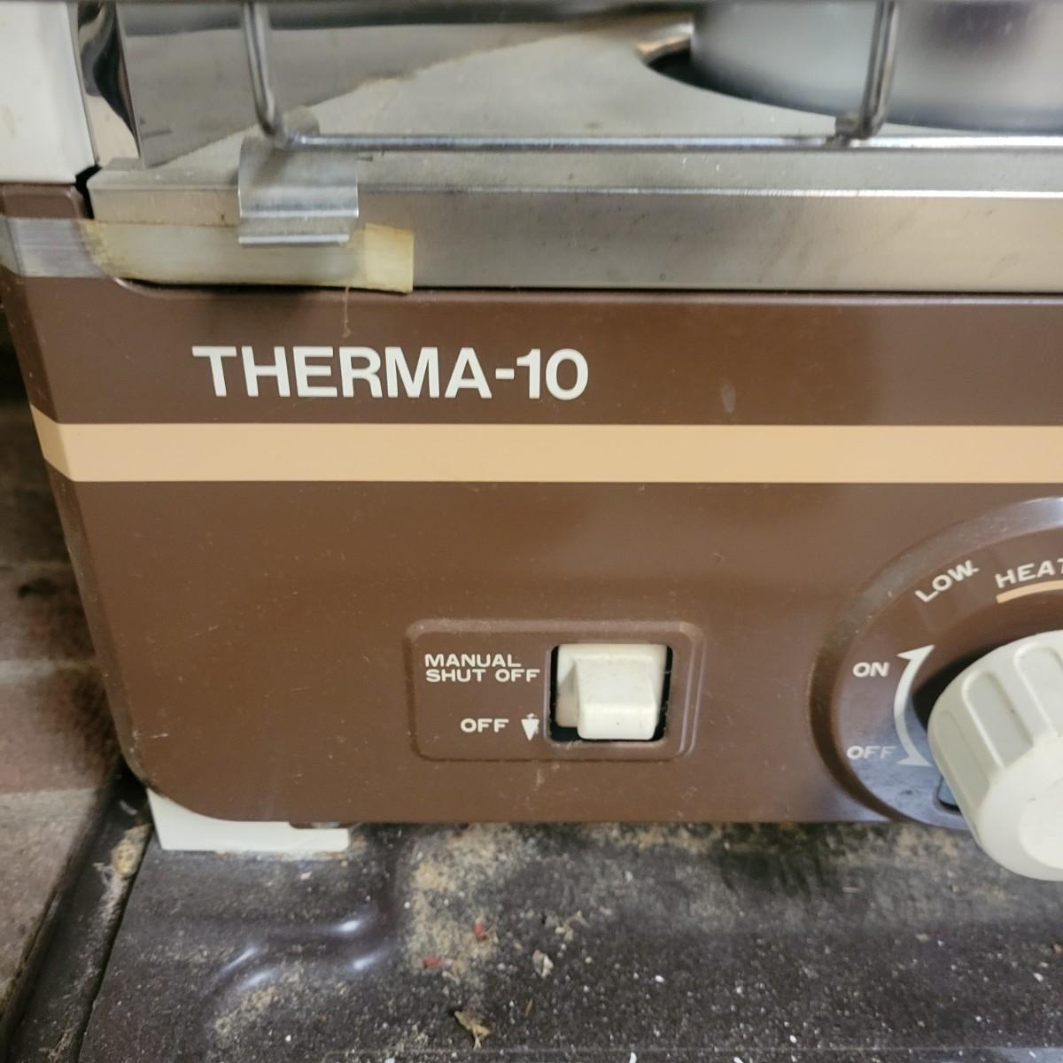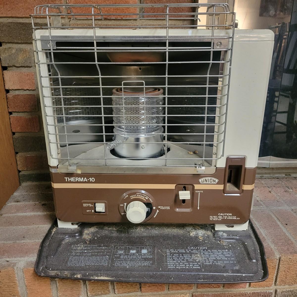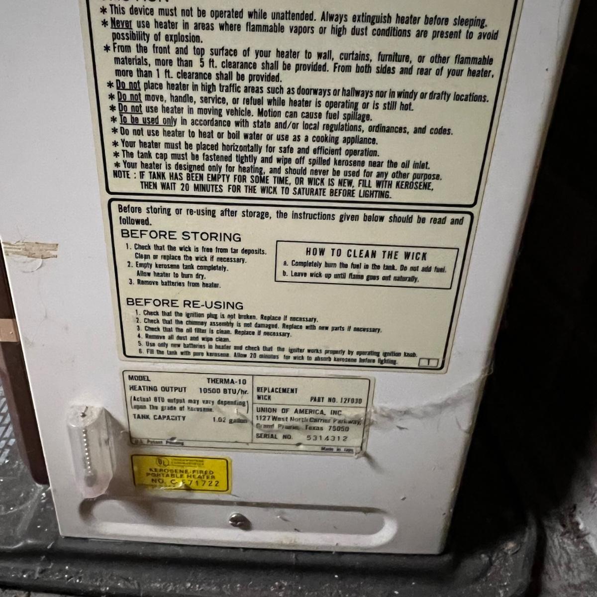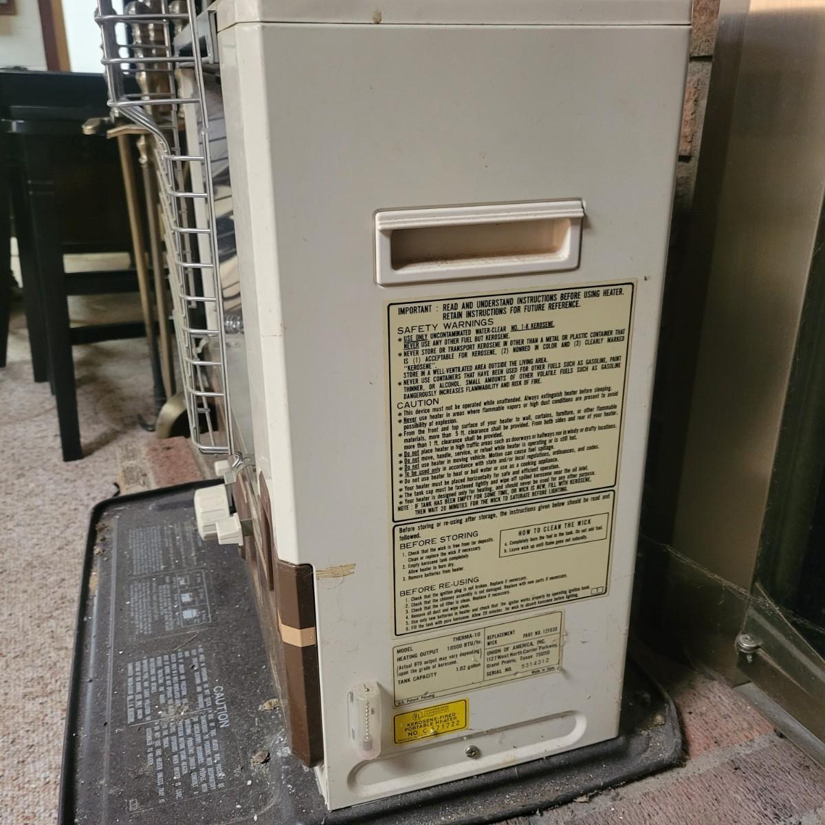 This heater is a Union Therma-10 kerosene heater that fired up when tested. It features push button ignition and measures approximately 21" x 17" x 20". It is in good condition, but could use a thorough cleaning. There is still some unidentified liquid present in the heater. Local pickup only.
