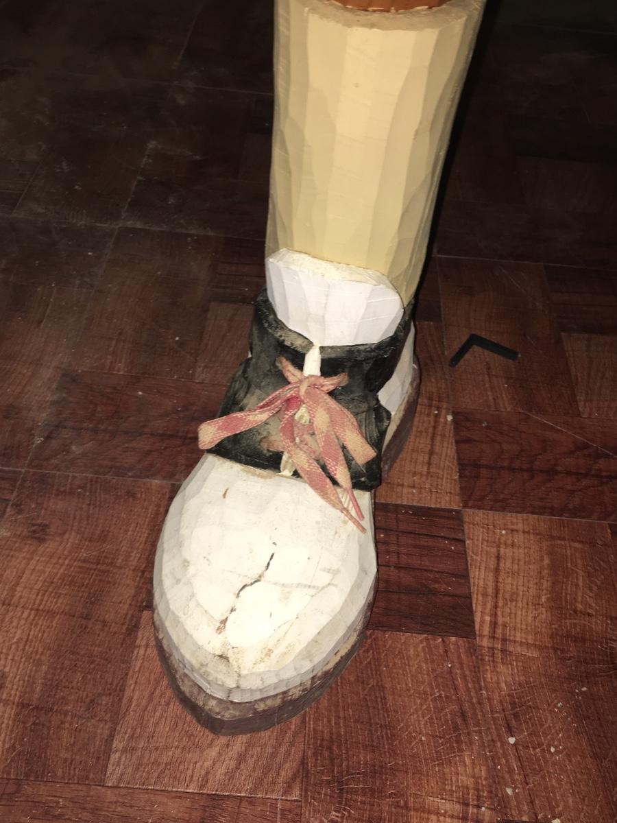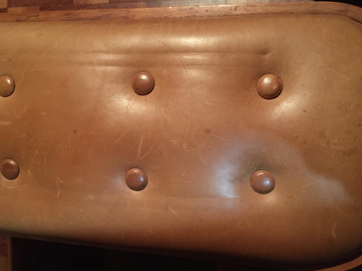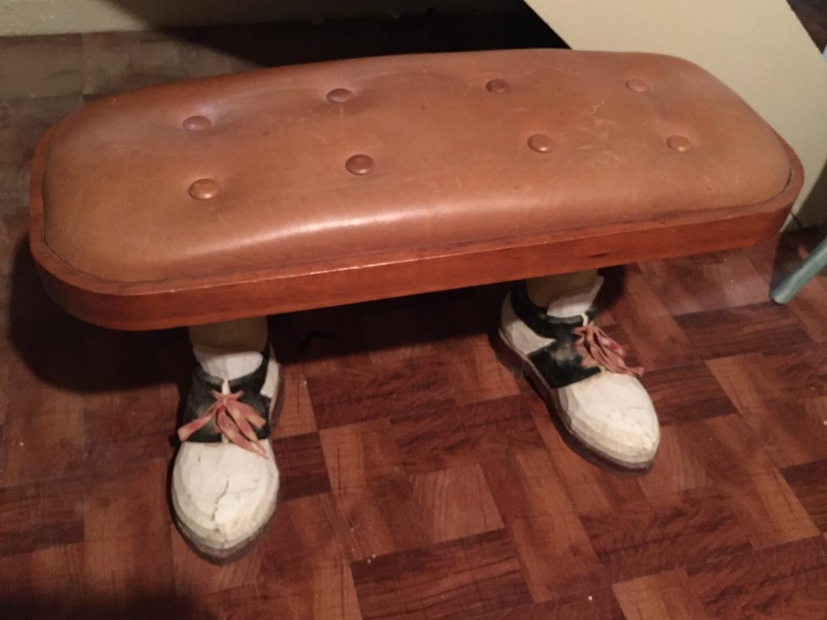 Low , narrow, vinyl top tufted bench with carved wooded legs resembling golf shoes. Very heavy. Perfect for the golfer in your life!
