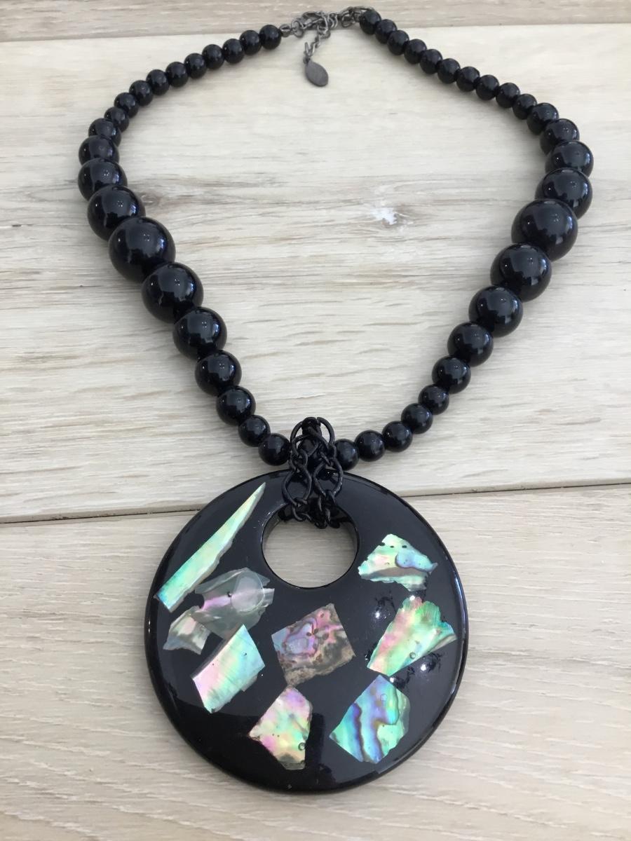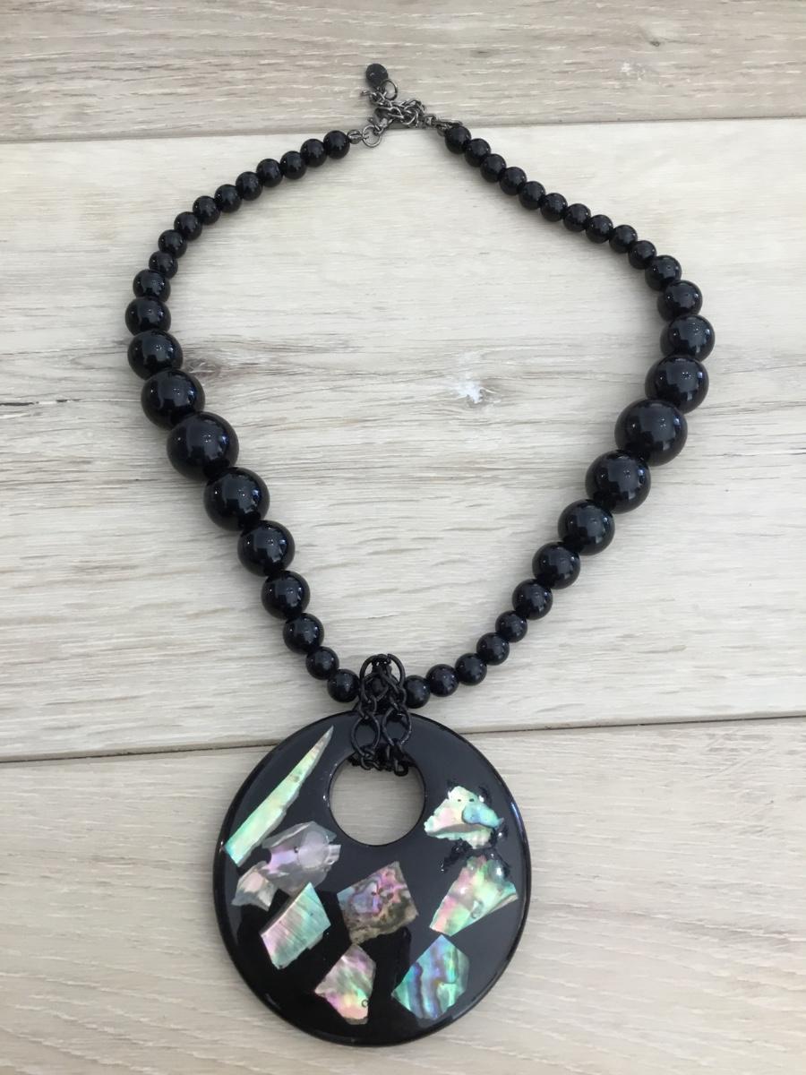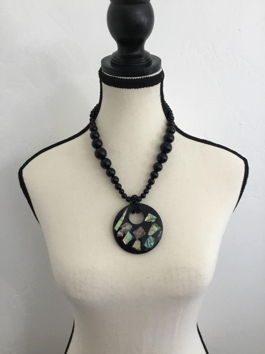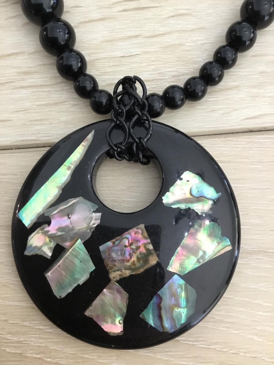 Unique 80s large chunky black beaded necklace with large circle abalone pendant