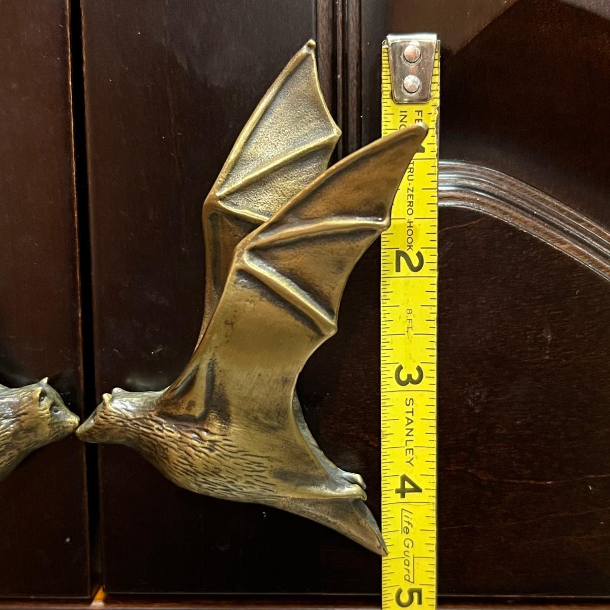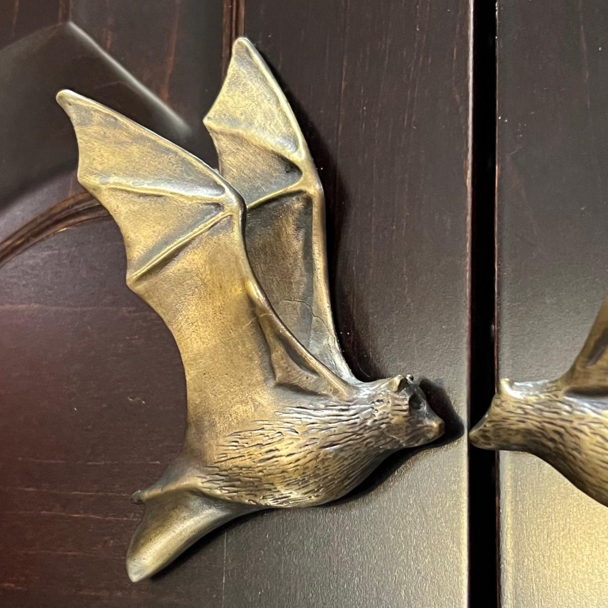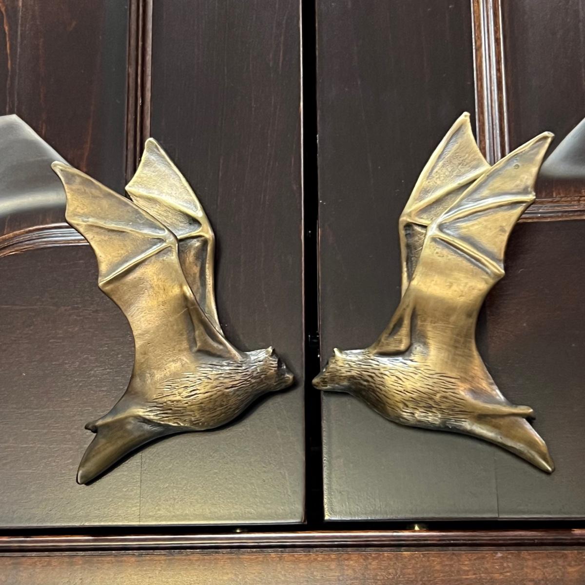 This unique set of metal bat shaped hardware have an aged bronze finish. There are 19 in total. The winning bidder will be responsible for dismantling them (Phillips head screwdriver needed).