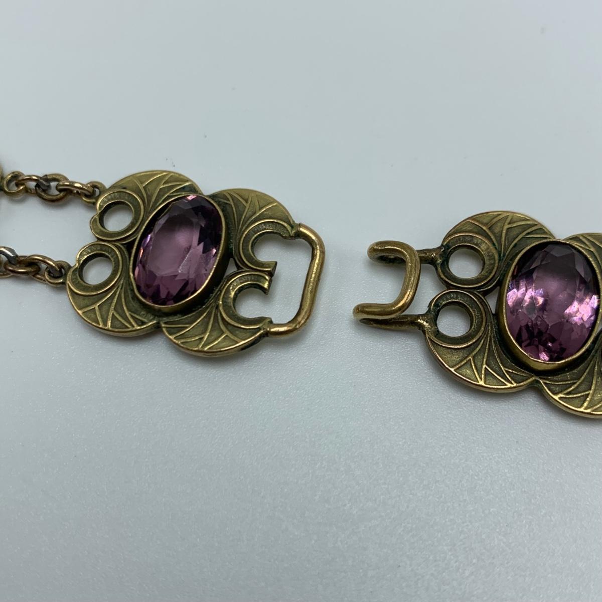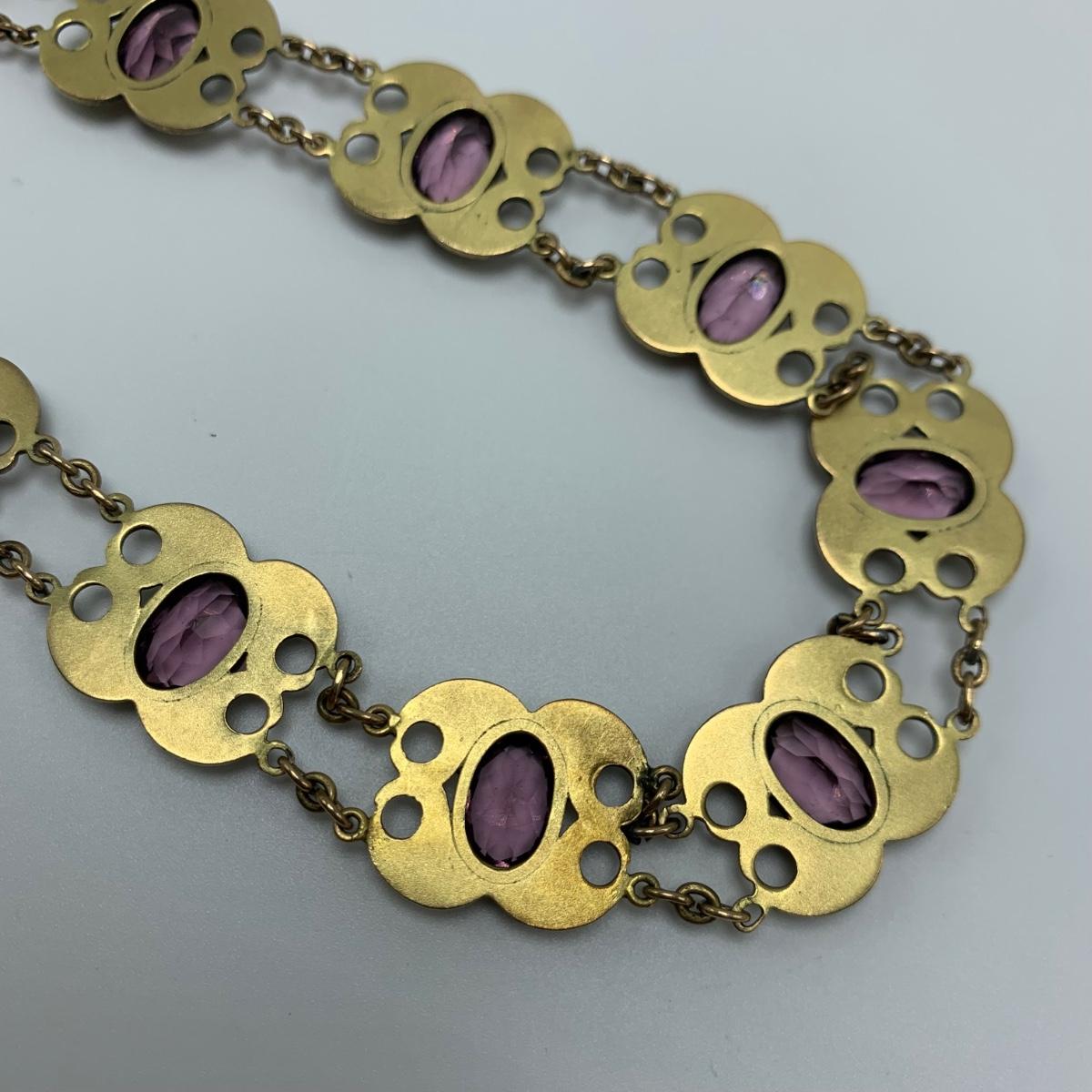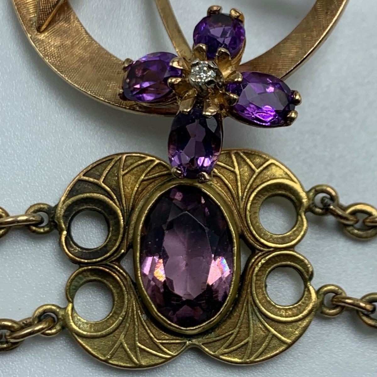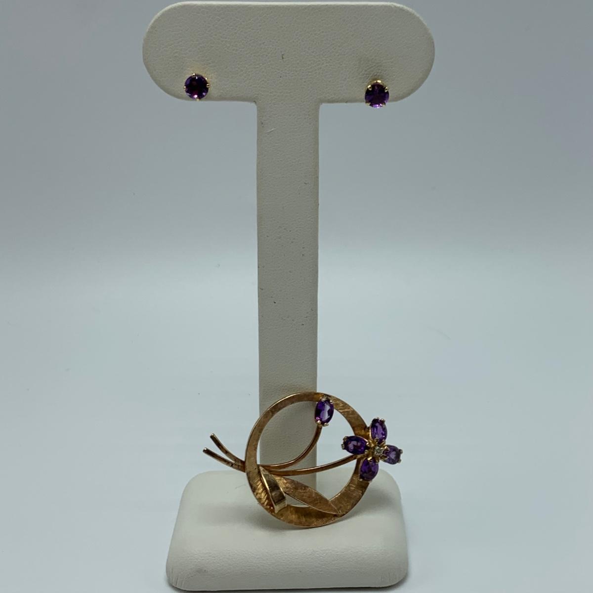 This lot features a beautiful and unique choker with faceted amethyst colored stones in ornate metal brass-colored settings. It is 15” long. Also included in this lot are a pair of stud earrings and a brooch that are stamped 14K. The earrings have mismatched backs. The gemstones in the earrings and brooch have a vibrant purple hue, while the gemstones in the necklace are more of a pinkish-purple. All sales are final. No returns or refunds. Please bid accordingly.