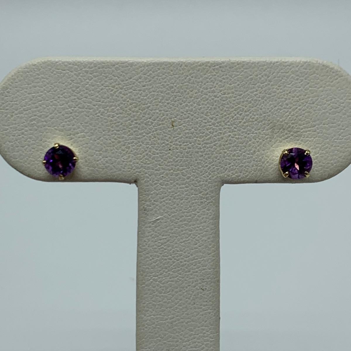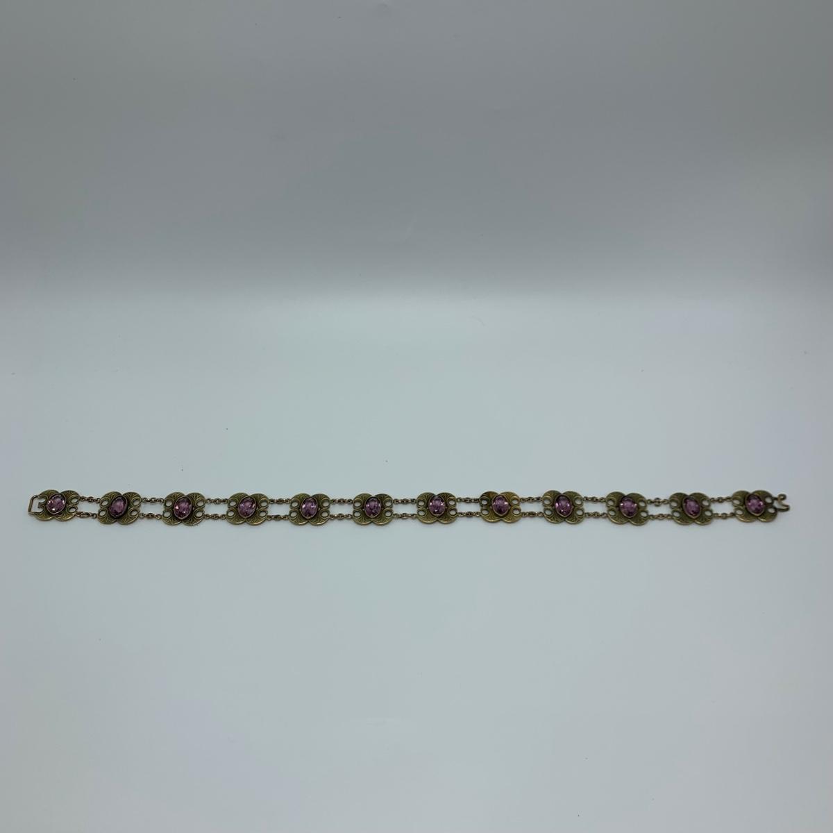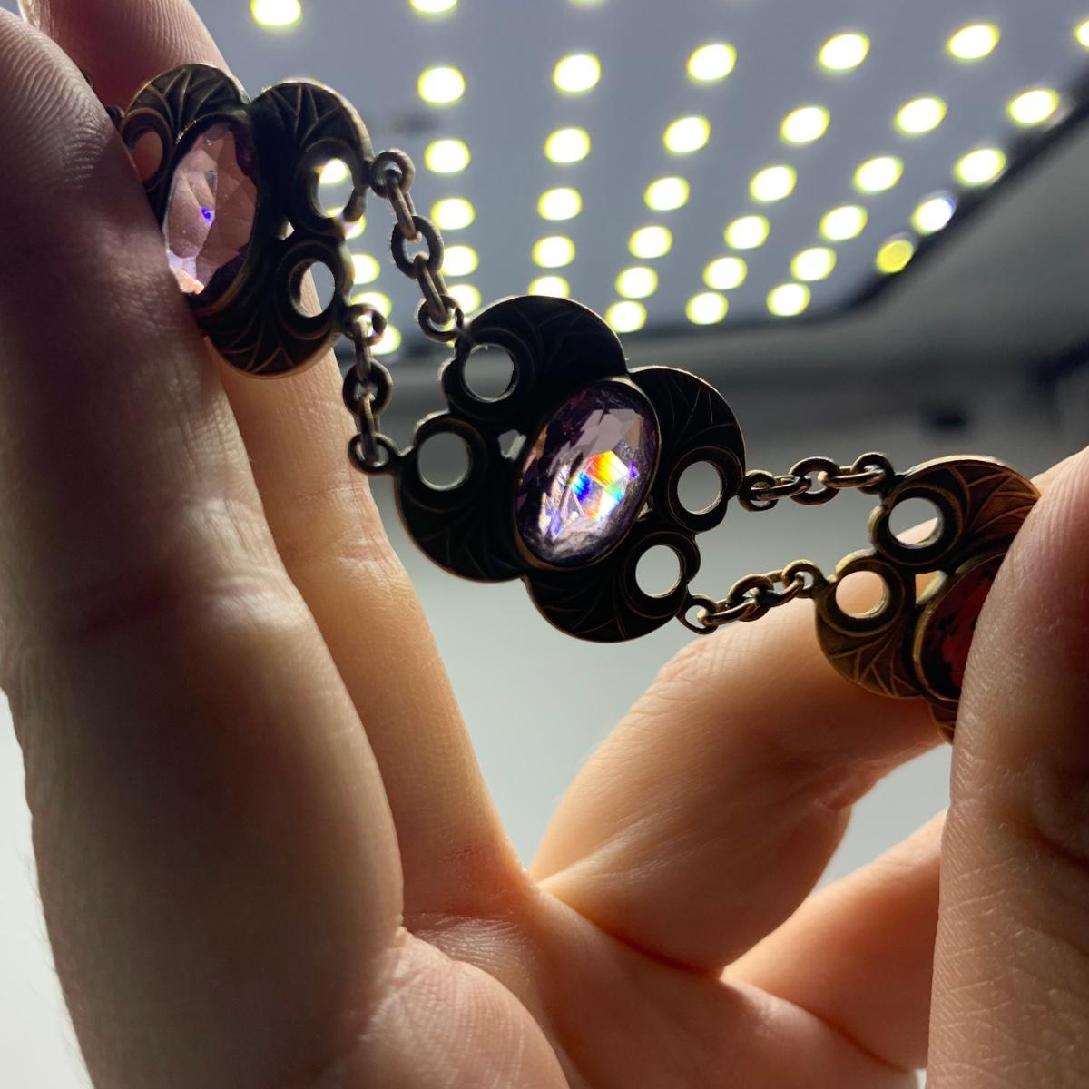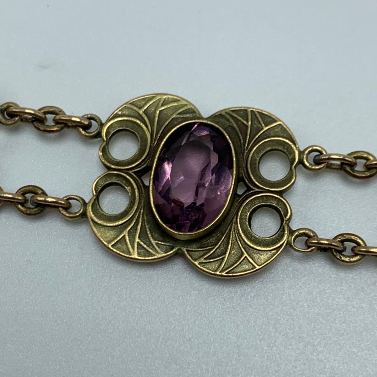 This lot features a beautiful and unique choker with faceted amethyst colored stones in ornate metal brass-colored settings. It is 15” long. Also included in this lot are a pair of stud earrings and a brooch that are stamped 14K. The earrings have mismatched backs. The gemstones in the earrings and brooch have a vibrant purple hue, while the gemstones in the necklace are more of a pinkish-purple. All sales are final. No returns or refunds. Please bid accordingly.