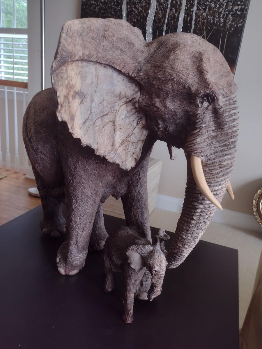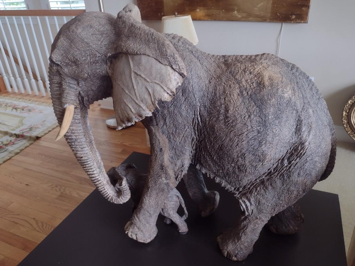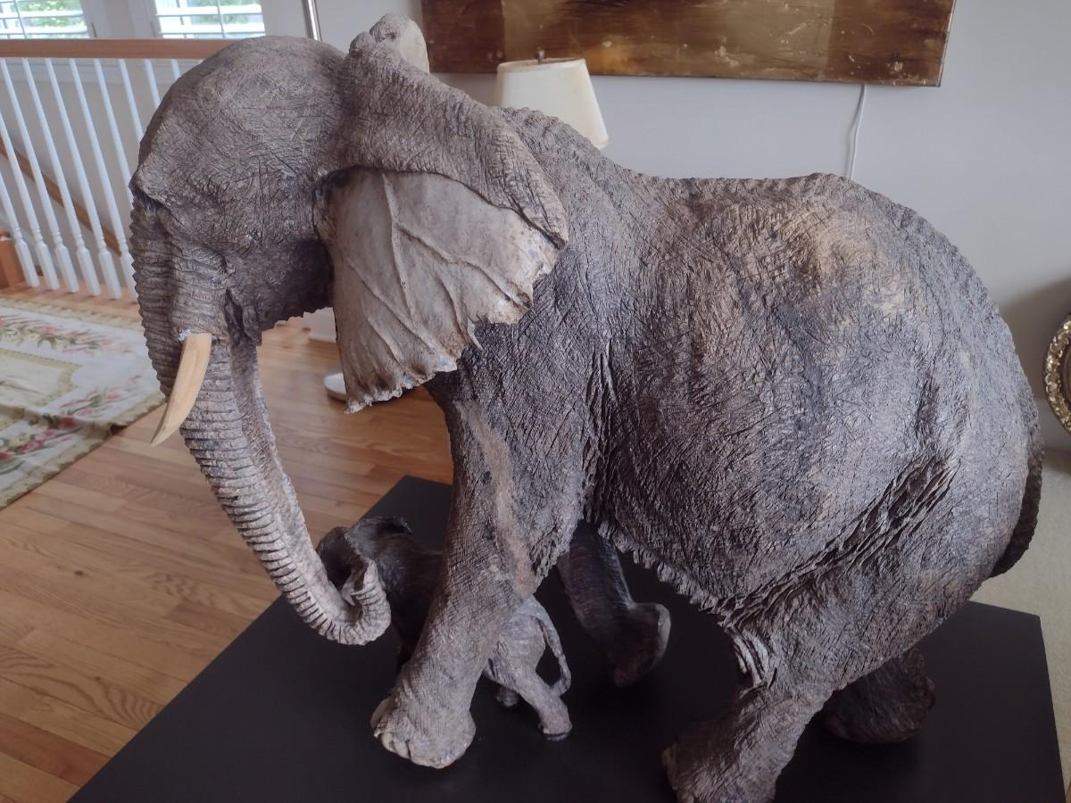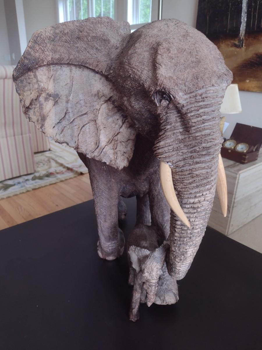 Unique and Rare Large Ironwood Elephant and Calf Carving South African Import Flawless this is an extremely impressive piece and cost over $3000 to purchase and import from South Africa in 2016. Weighs at least 75lbs. Wood tusks. No ivory content.