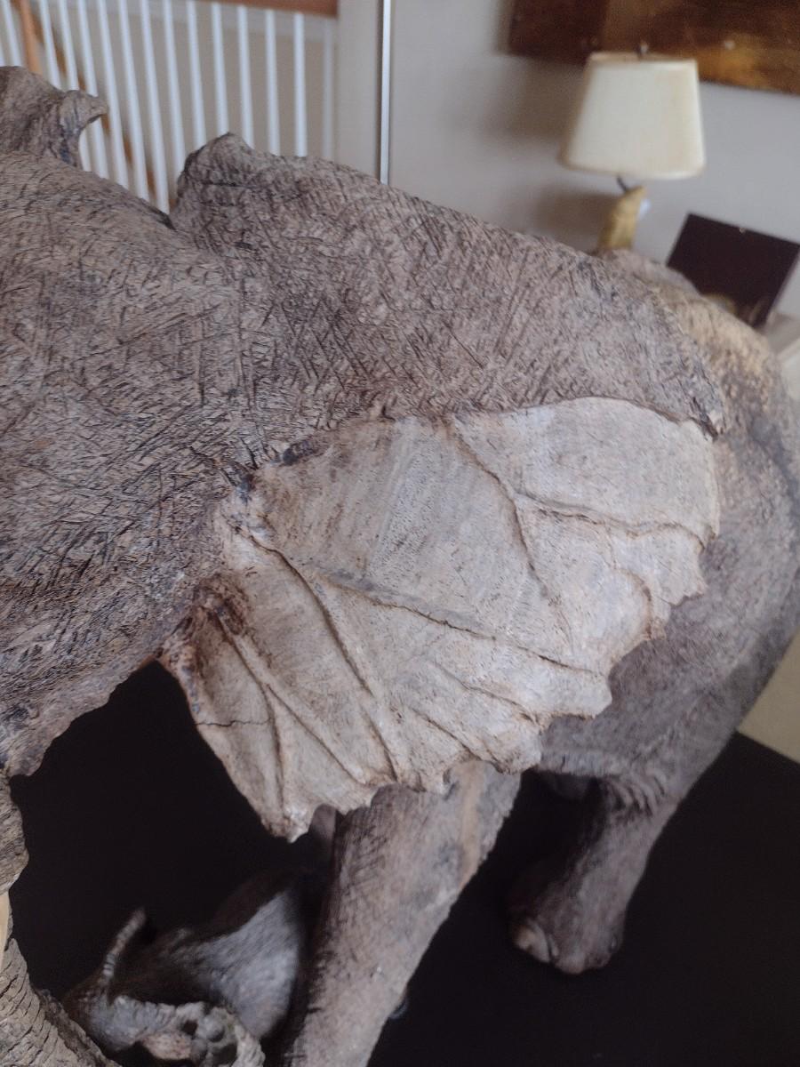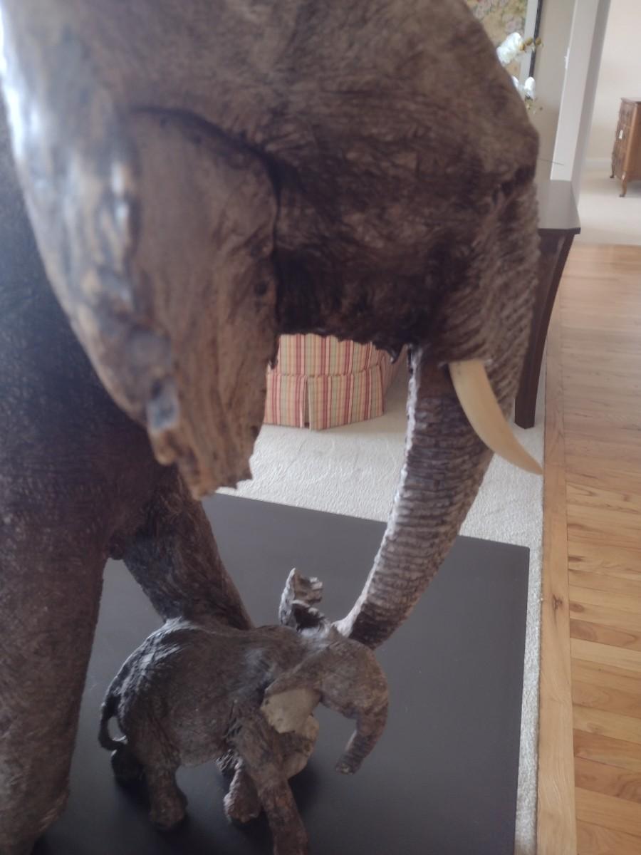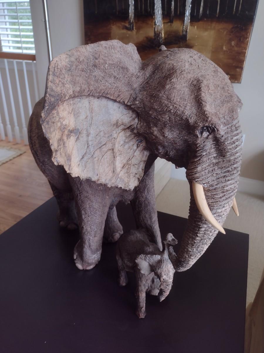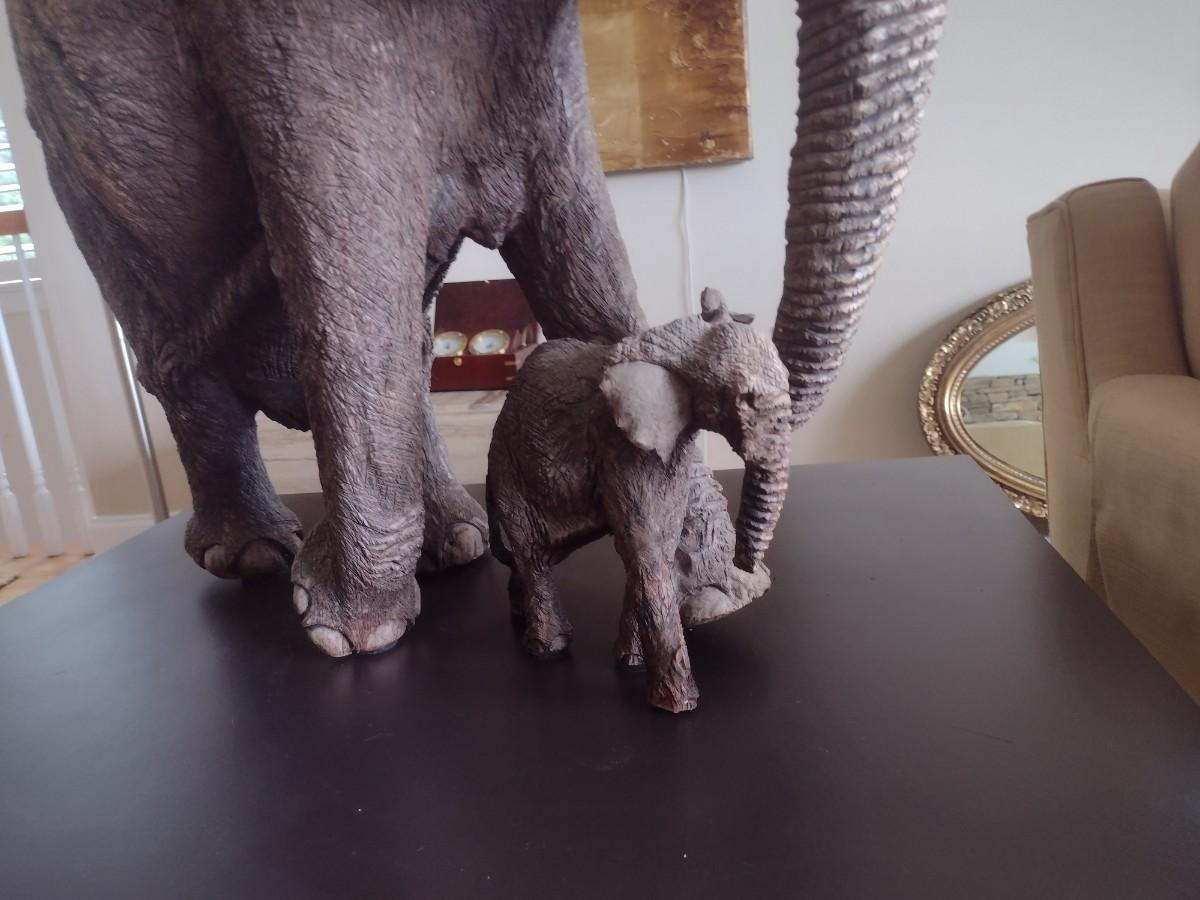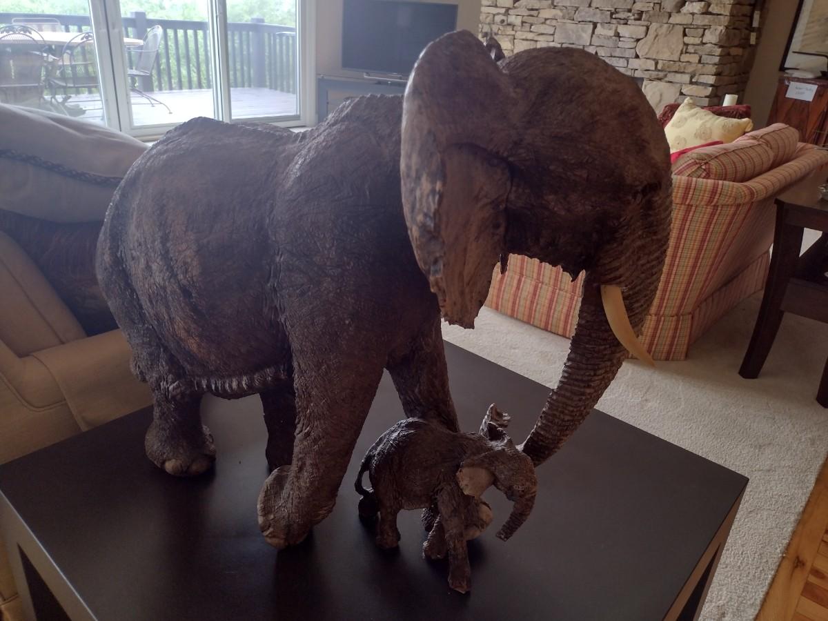 Unique and Rare Large Ironwood Elephant and Calf Carving South African Import Flawless this is an extremely impressive piece and cost over $3000 to purchase and import from South Africa in 2016. Weighs at least 75lbs. Wood tusks. No ivory content.