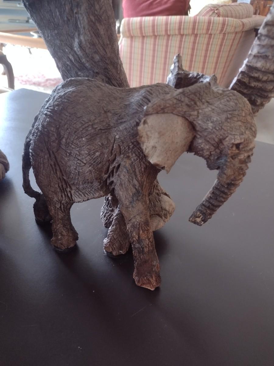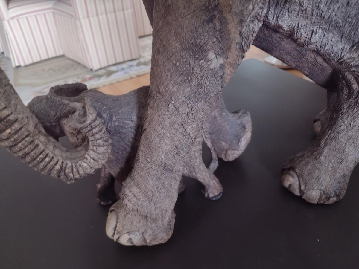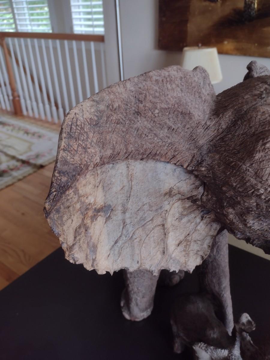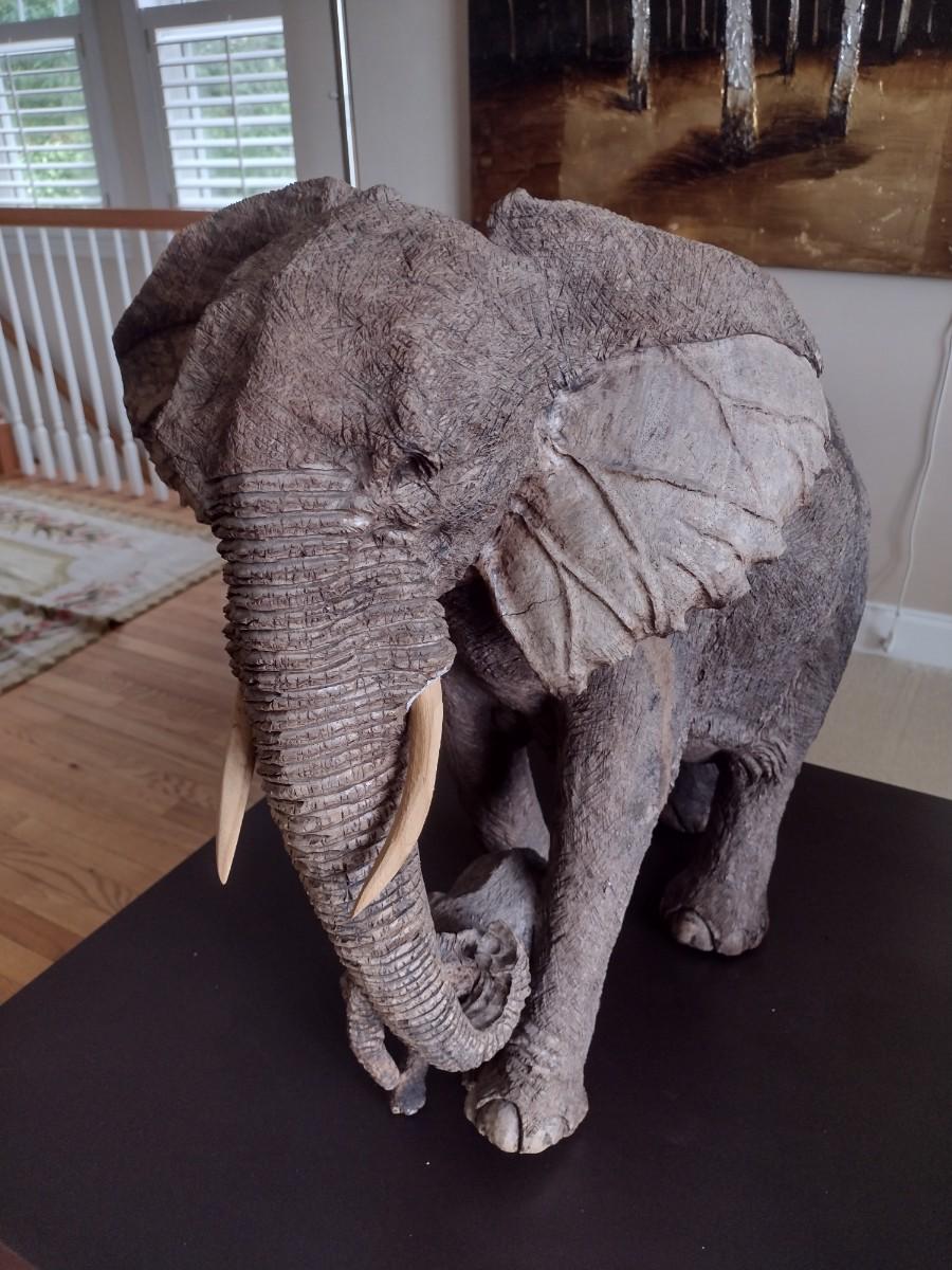 Unique and Rare Large Ironwood Elephant and Calf Carving South African Import Flawless this is an extremely impressive piece and cost over $3000 to purchase and import from South Africa in 2016. Weighs at least 75lbs. Wood tusks. No ivory content.
