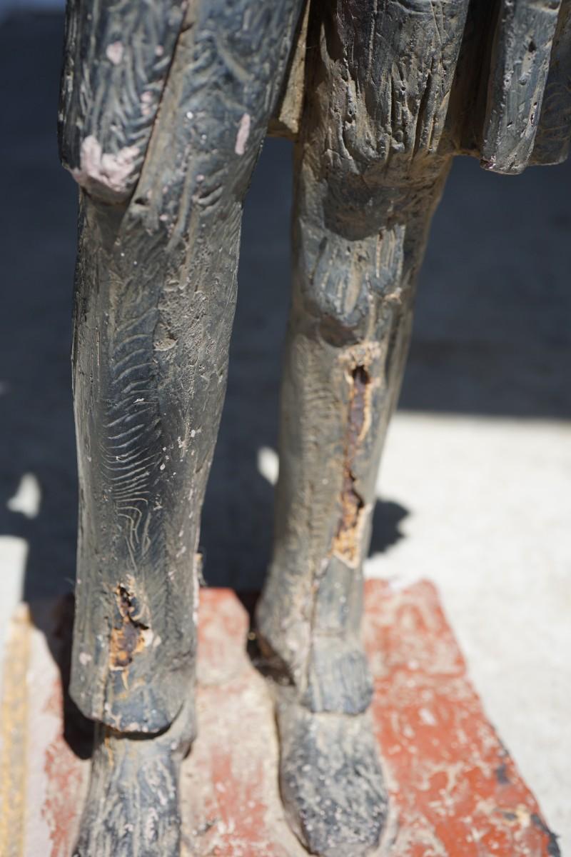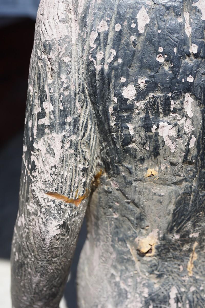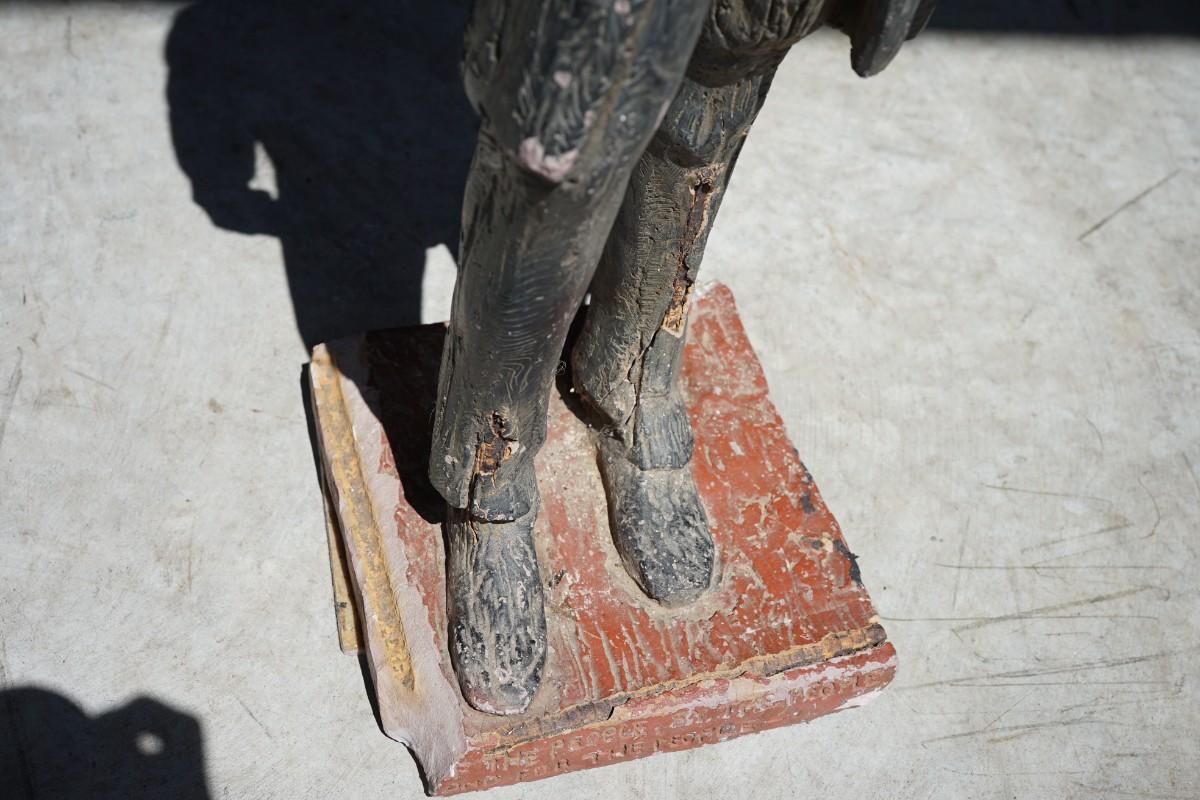 the statue is of fine detail. painted, old paint and is there is some paint missing etc. typical with age. He is holding a book and rests on a square platform of cement and a metal plate to protect.