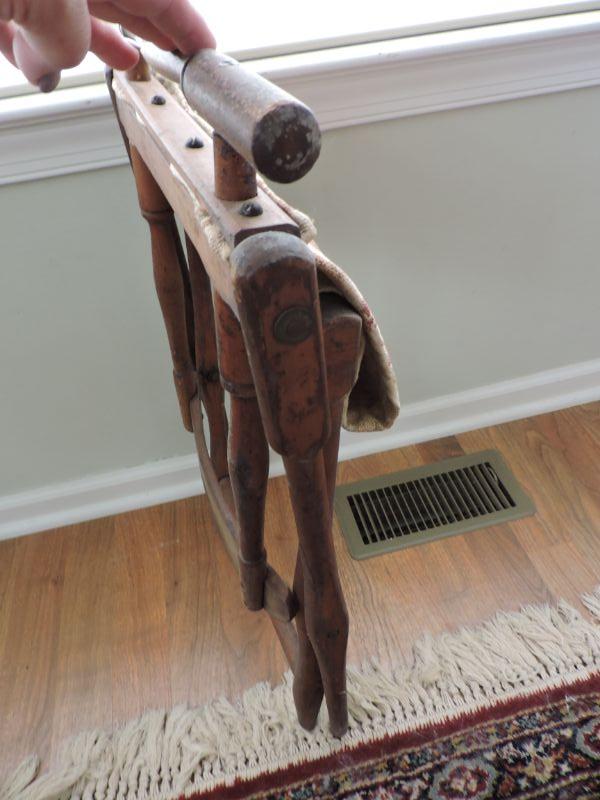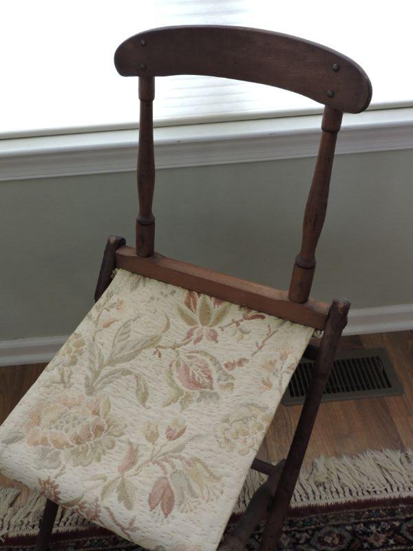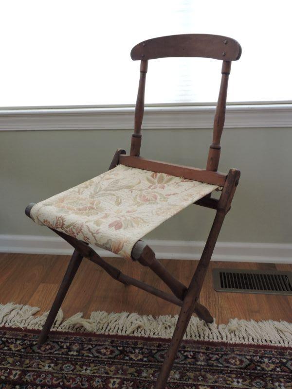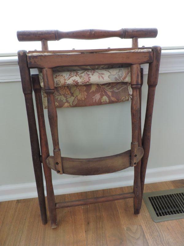 Very unique folding chair folds up with a handle to carry. **Please read Terms and Conditions before placing a bid. Pick up is Sunday, September 1, 2019 from 10am to 4pm in Williamstown. All sales are final. All sales are as is, where is. Please review all photos. Any props included in photos are not included in listing. All measurements are approximate. Comes from home with cats.