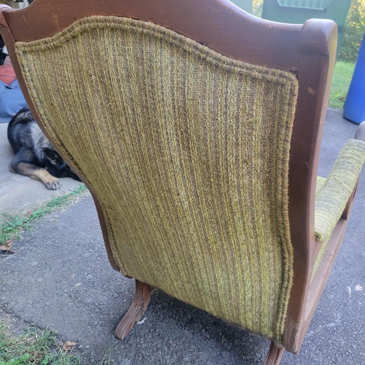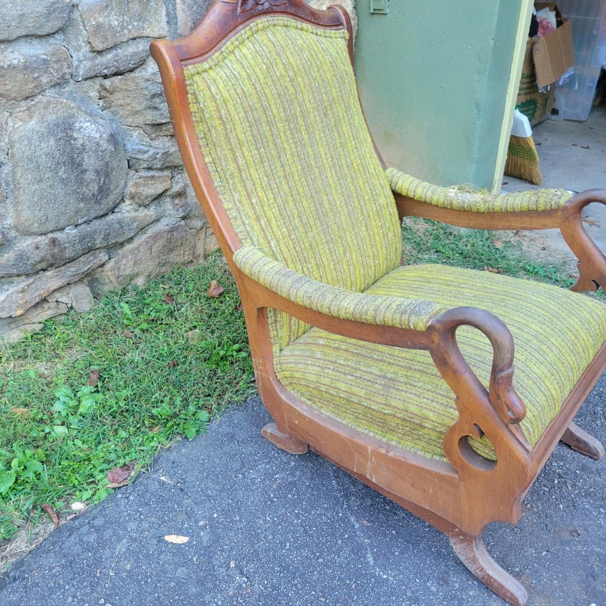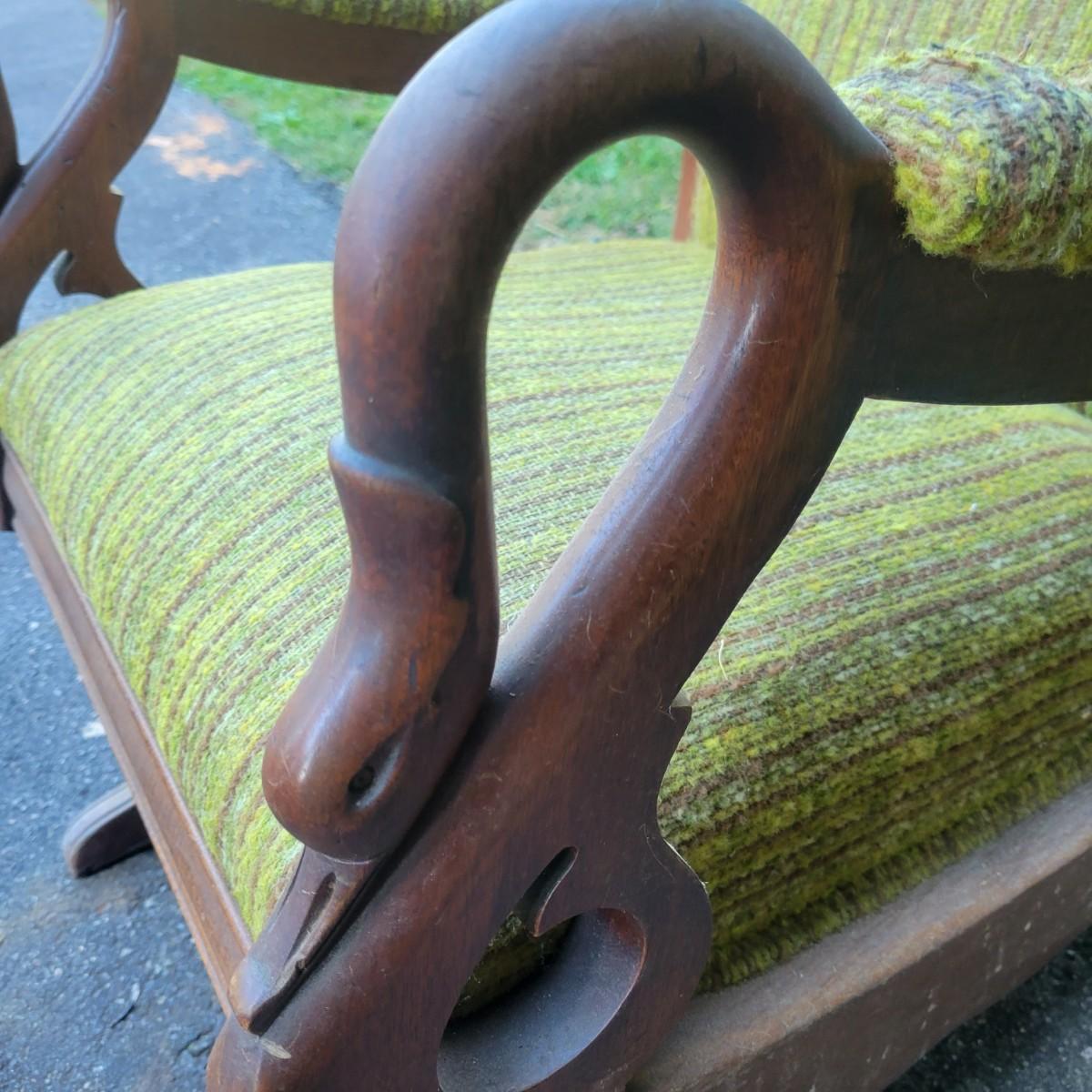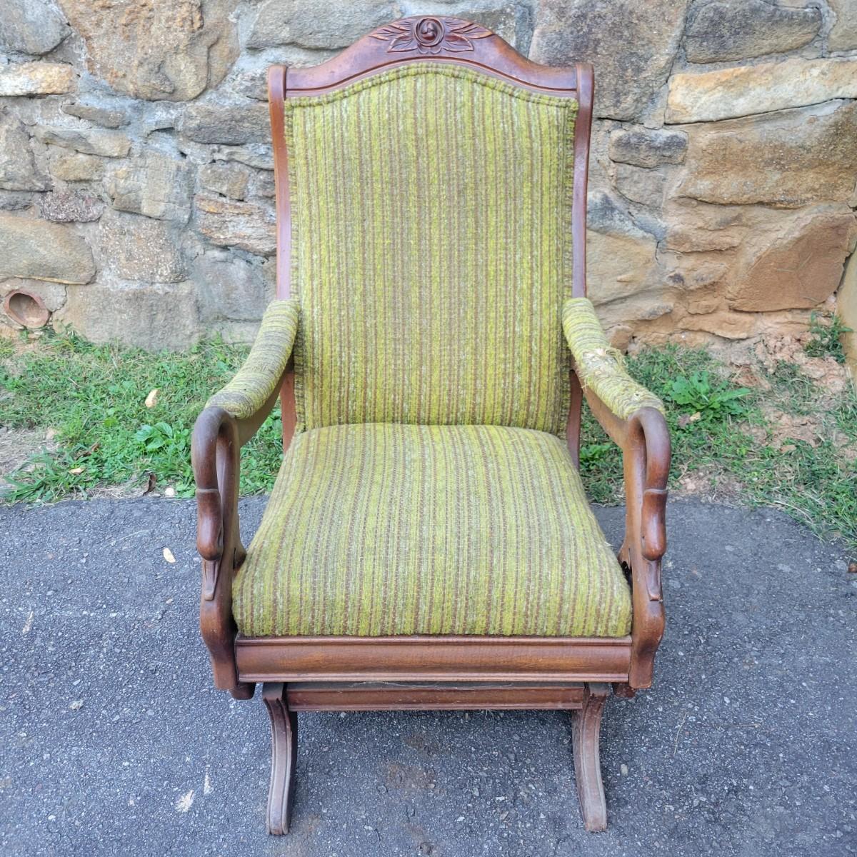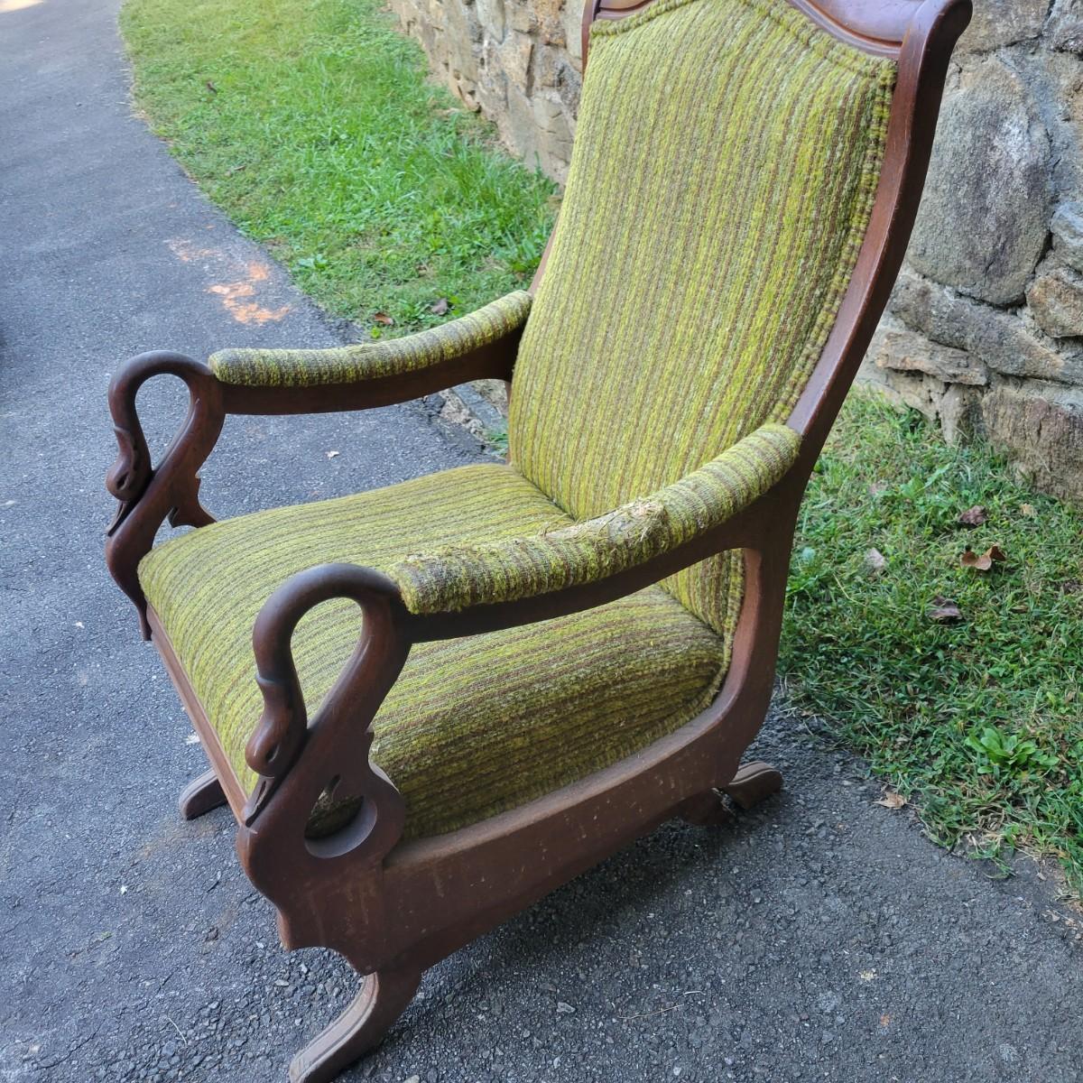 A unique antique rocking chair in fair condition with notable scratches and damage. Rear feet are cracked and repaired or broken off, missing piece is still with the chair. Upholstery also shows significant damage. This chair features beautiful carvings, including swan hands as hand rests and spring driven rocking mechanism. This piece could be restored to make a lovely and unique piece of furniture. Measures approximately 24.5" x 29" x 39" Local pickup only