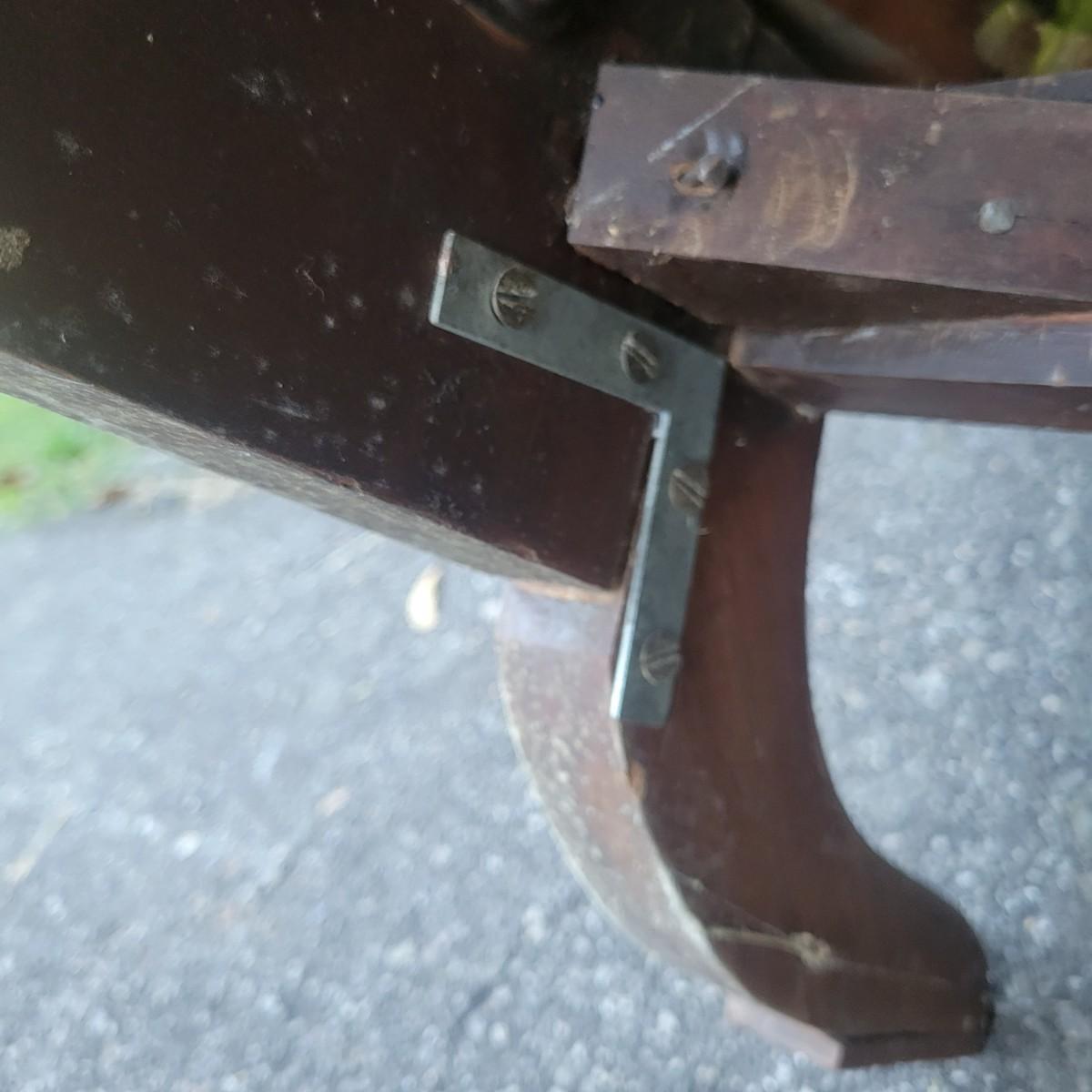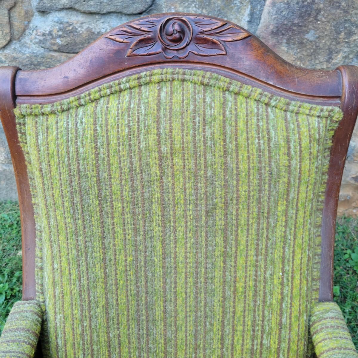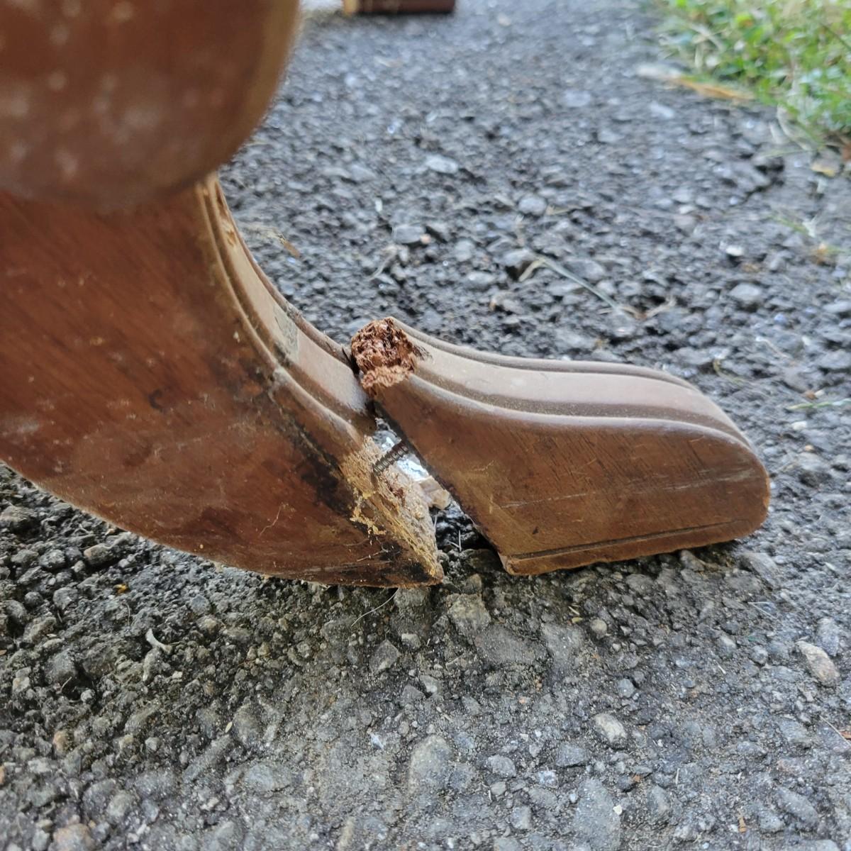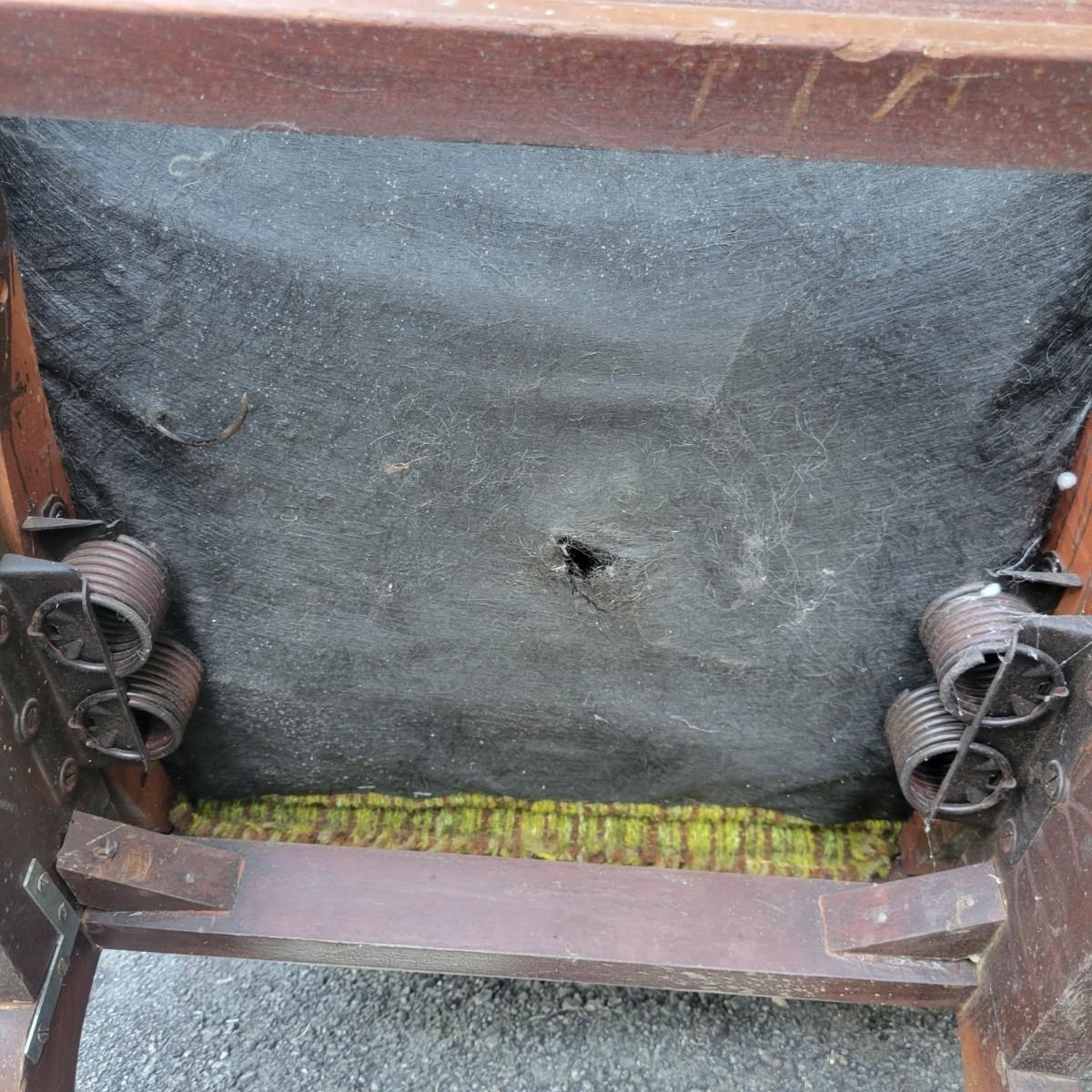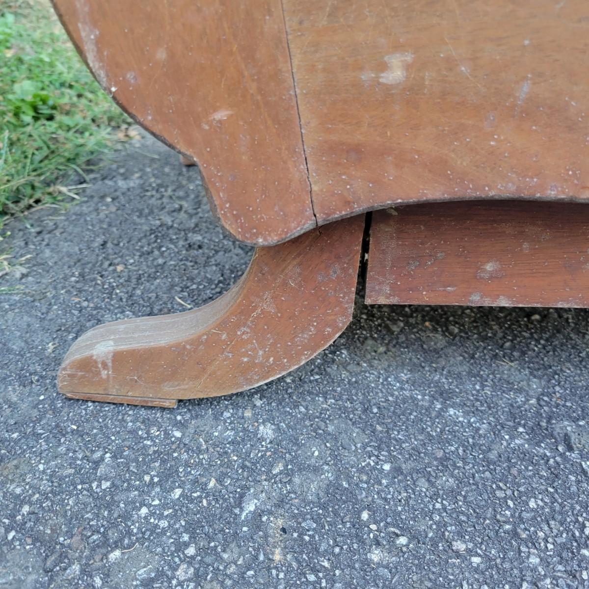 A unique antique rocking chair in fair condition with notable scratches and damage. Rear feet are cracked and repaired or broken off, missing piece is still with the chair. Upholstery also shows significant damage. This chair features beautiful carvings, including swan hands as hand rests and spring driven rocking mechanism. This piece could be restored to make a lovely and unique piece of furniture. Measures approximately 24.5" x 29" x 39" Local pickup only
