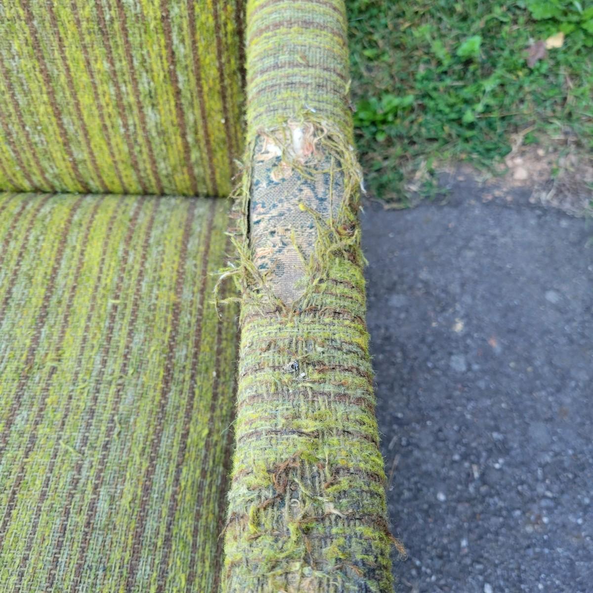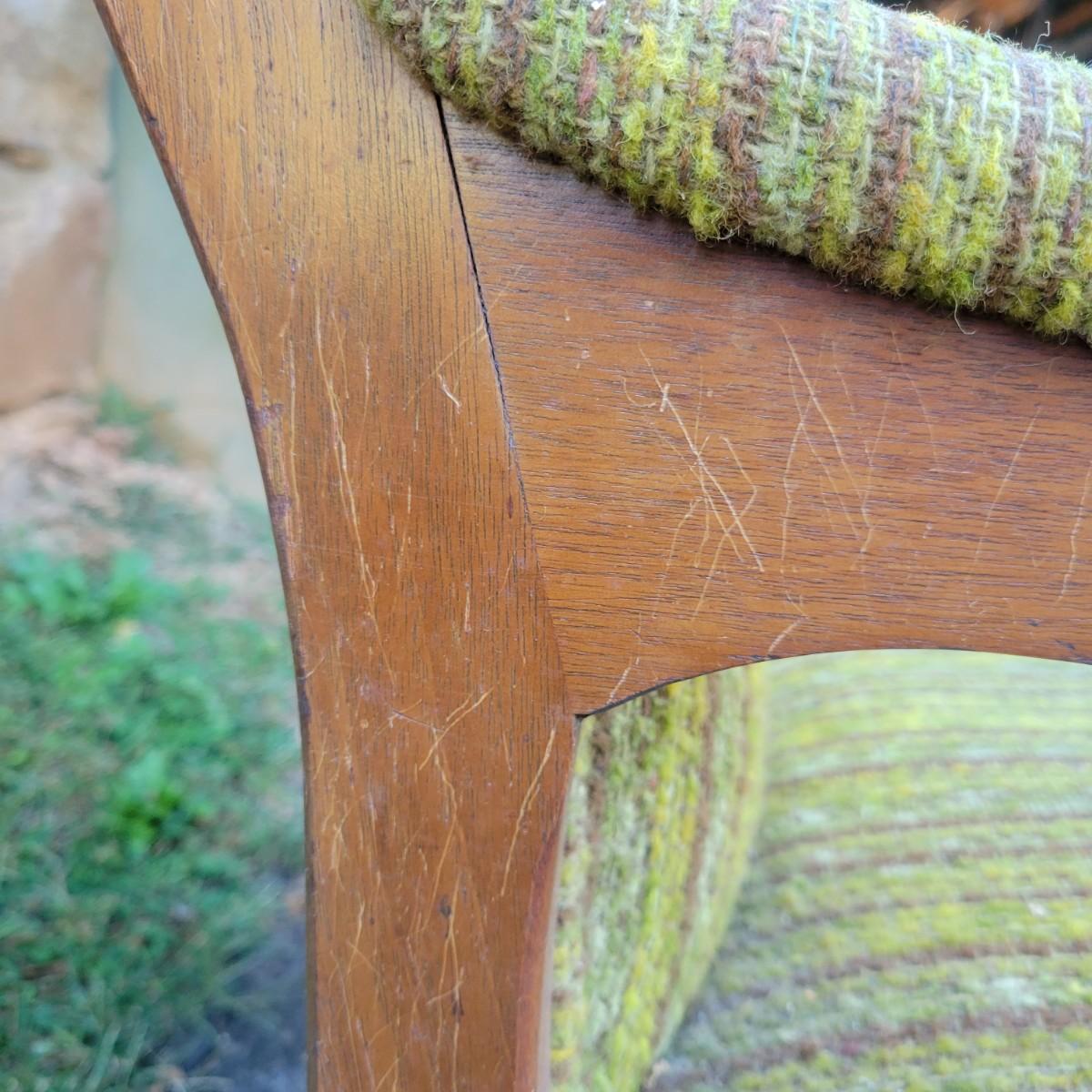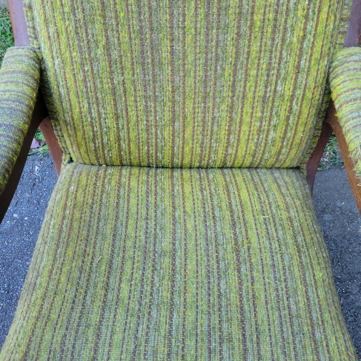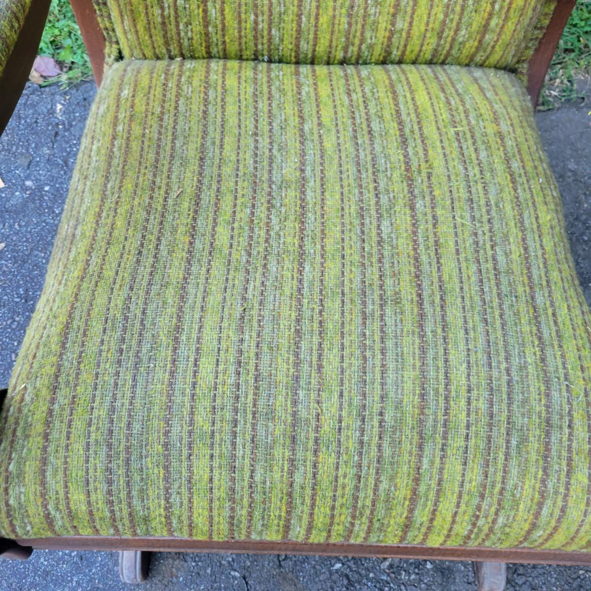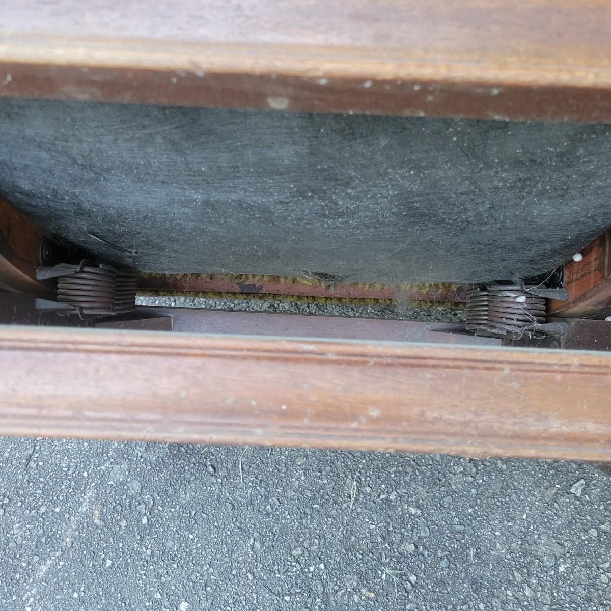 A unique antique rocking chair in fair condition with notable scratches and damage. Rear feet are cracked and repaired or broken off, missing piece is still with the chair. Upholstery also shows significant damage. This chair features beautiful carvings, including swan hands as hand rests and spring driven rocking mechanism. This piece could be restored to make a lovely and unique piece of furniture. Measures approximately 24.5" x 29" x 39" Local pickup only