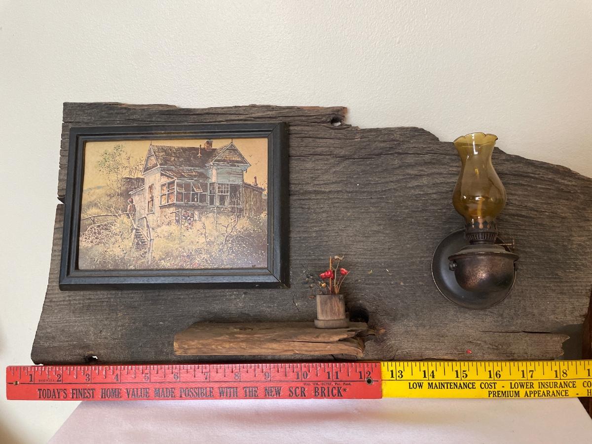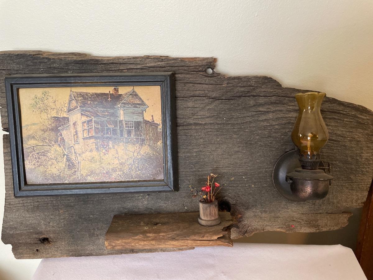 Rustic Barnwood with oil, lamp, shelf, and picture