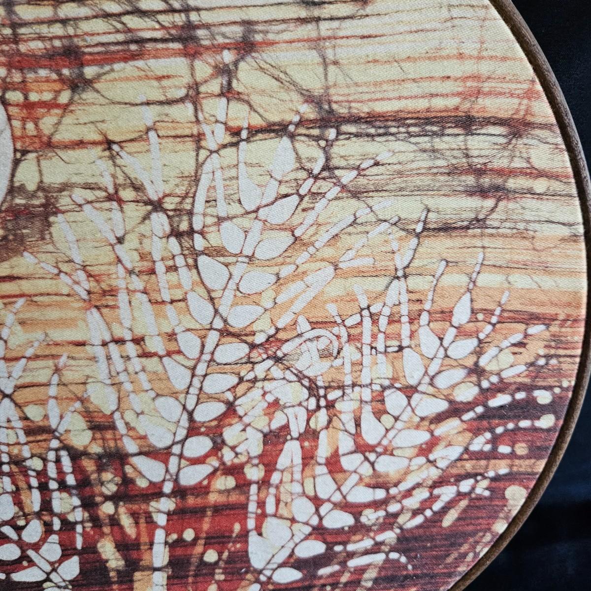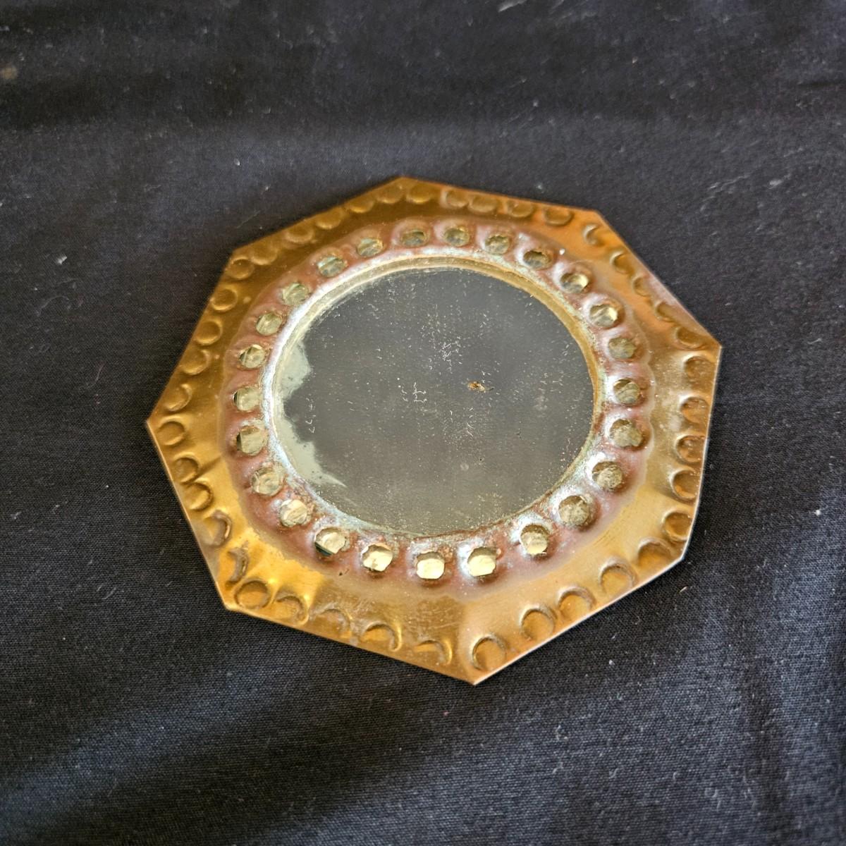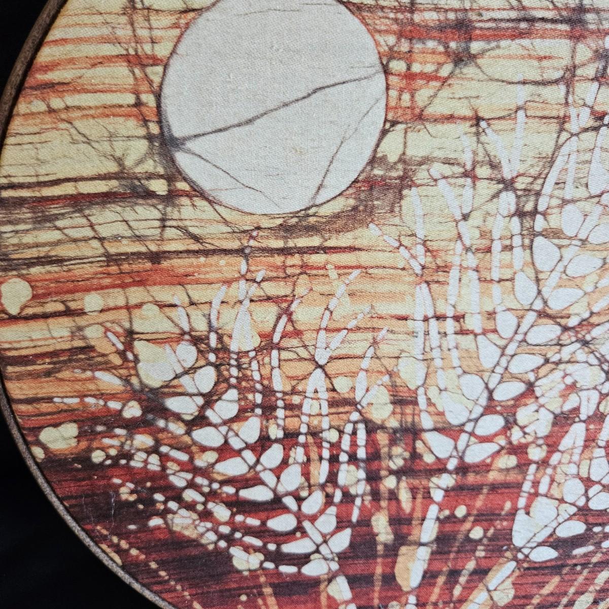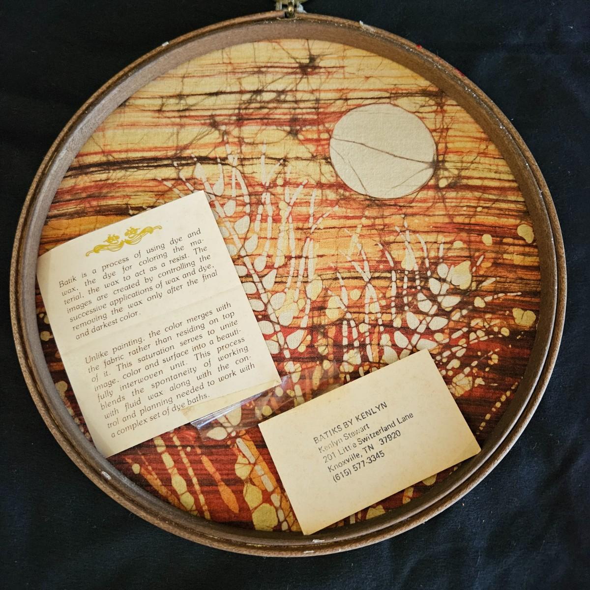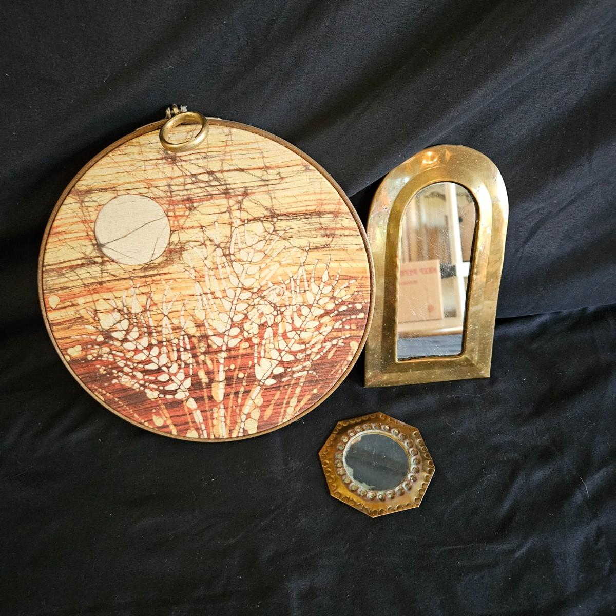 A unique batik with warm sunset tones that depicts plants and the sun. It is in a stretching hoop with a brass loop for hanging. It measures approximately 10.5"D. Also includes two small mirrors in brass frames. Shipping available